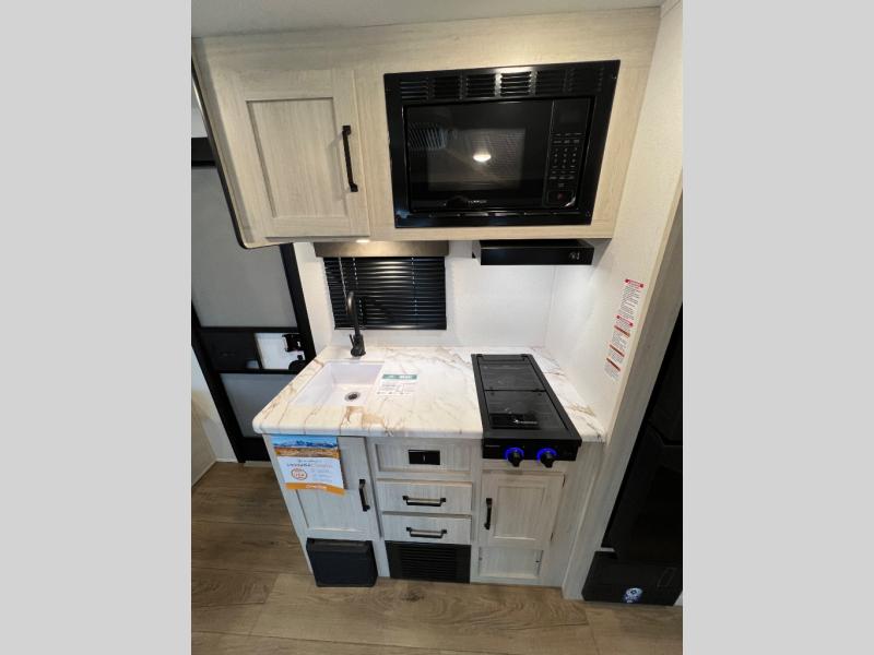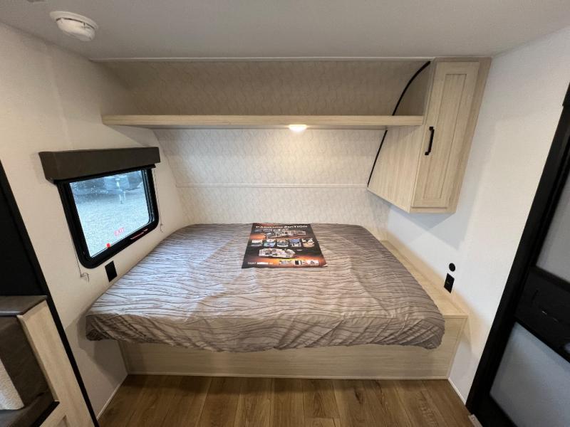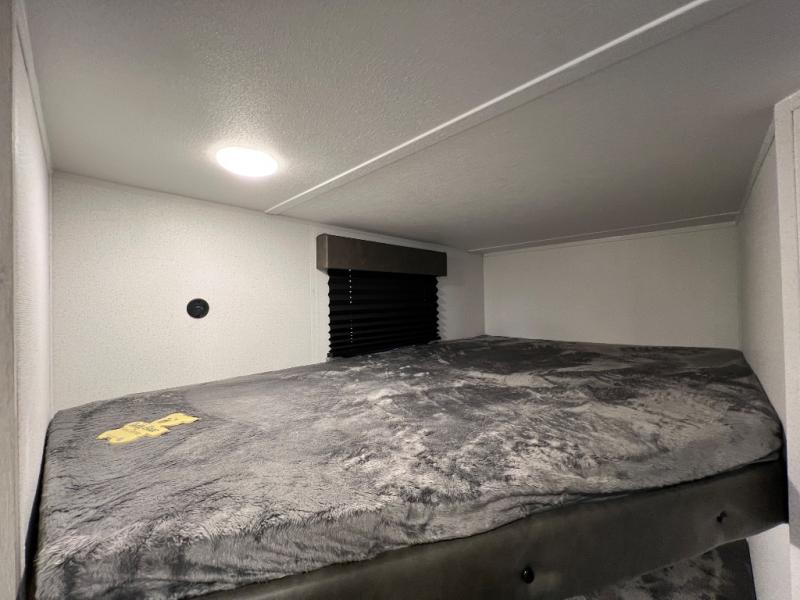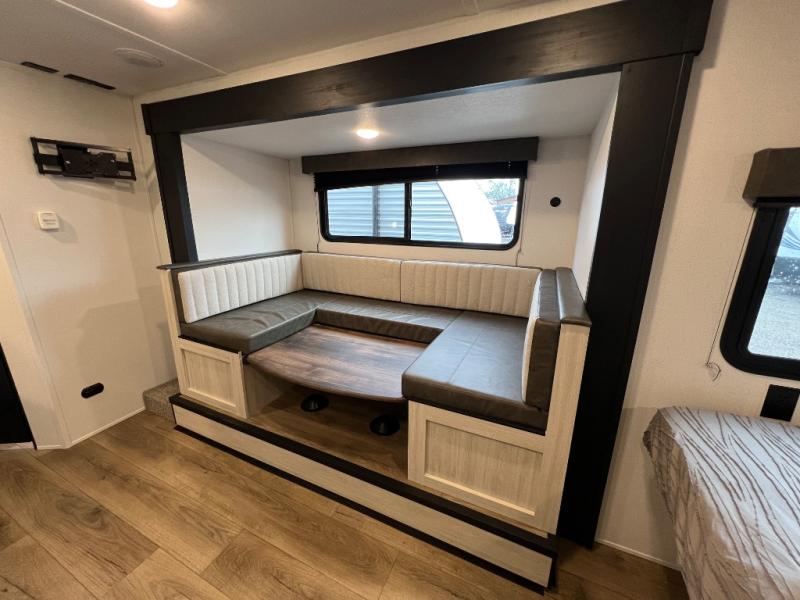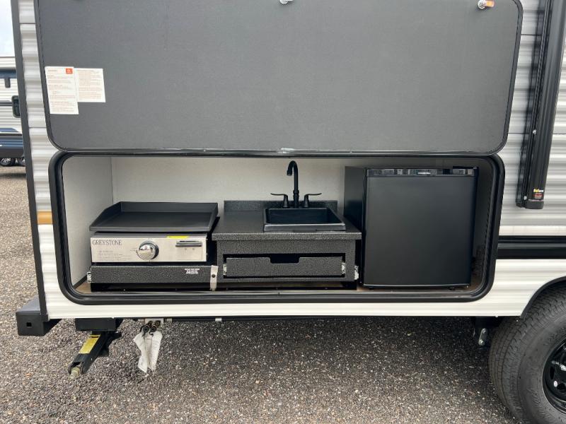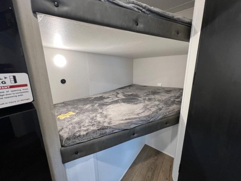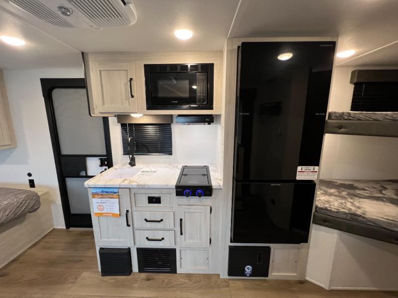 The whole gang will love camping in this travel trailer since there are double-size bunks for compact sleeping spaces and a slide out for more space to relax! The front RV queen bed is sure to provide a great night's rest, and you can choose the optional Murphy bed if you're needing more seating space during the day. Once you've made dinner on the two-burner cooktop, you can dine around the U-shaped dinette. And an optional mini kitchen with a griddle is available if you'd rather cook outdoors! This unit includes ample storage space for your things, including exterior storage and storage under the bunks!