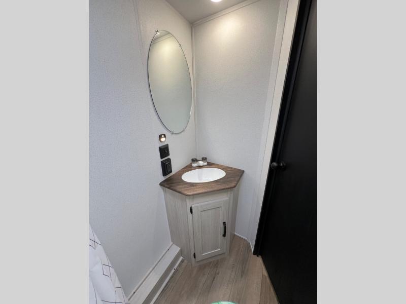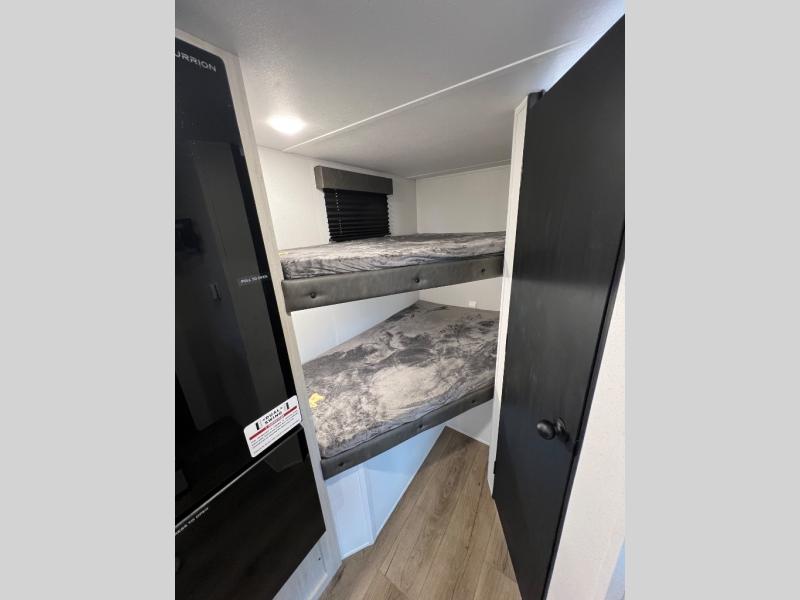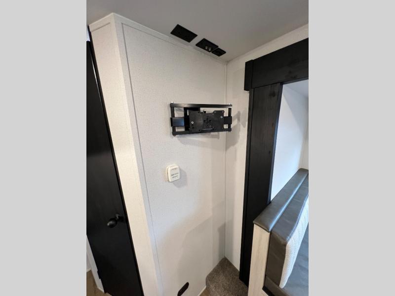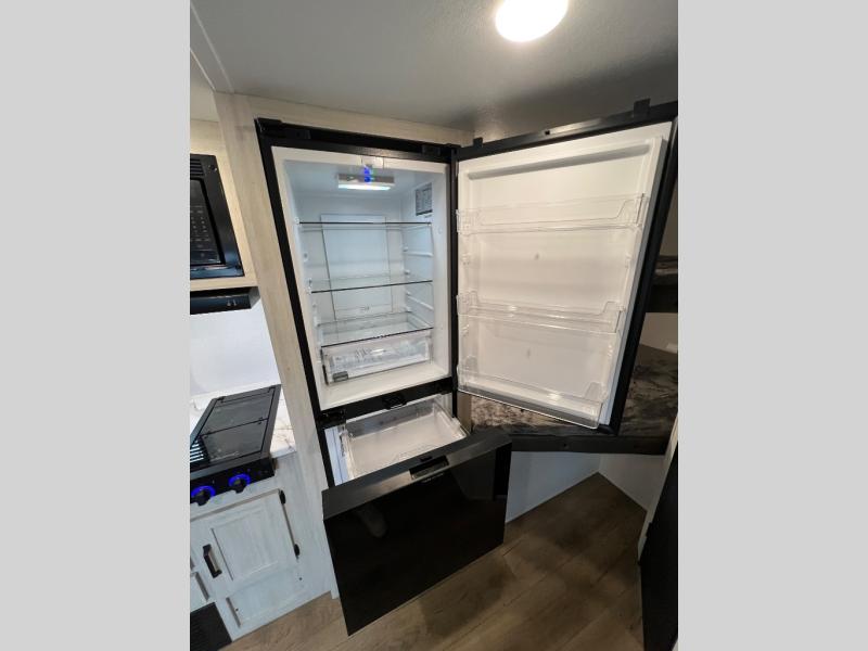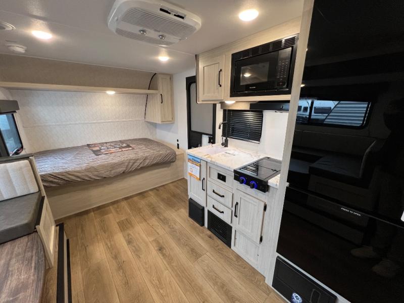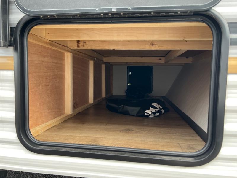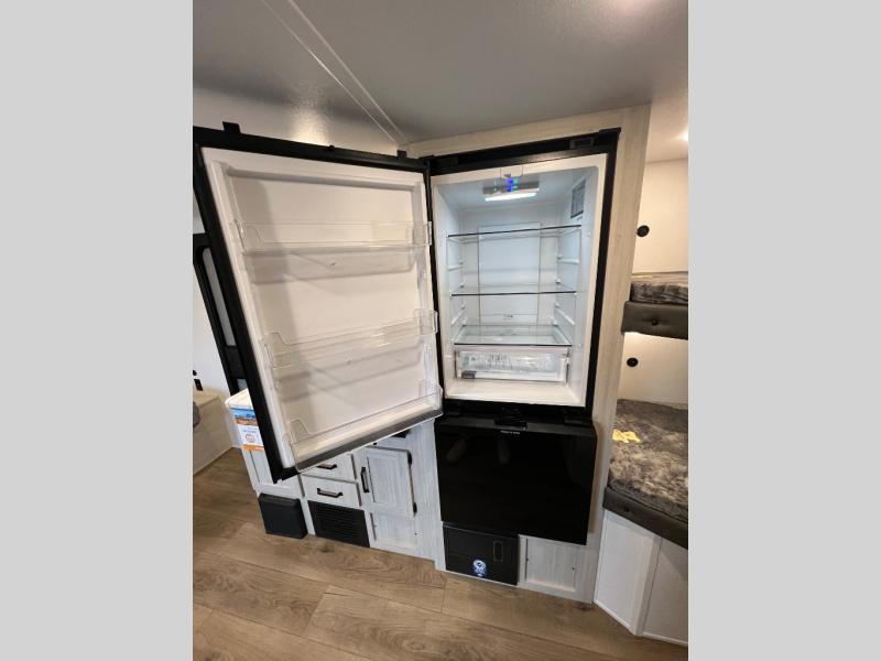 The whole gang will love camping in this travel trailer since there are double-size bunks for compact sleeping spaces and a slide out for more space to relax! The front RV queen bed is sure to provide a great night's rest, and you can choose the optional Murphy bed if you're needing more seating space during the day. Once you've made dinner on the two-burner cooktop, you can dine around the U-shaped dinette. And an optional mini kitchen with a griddle is available if you'd rather cook outdoors! This unit includes ample storage space for your things, including exterior storage and storage under the bunks!