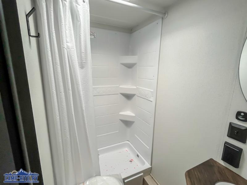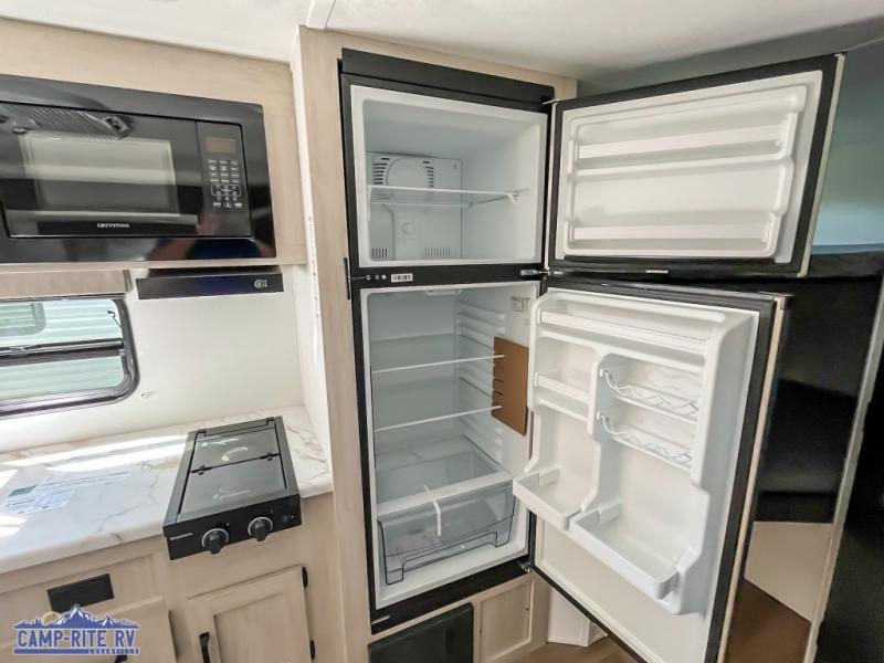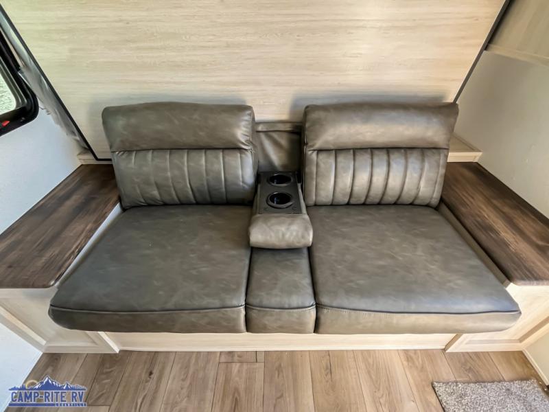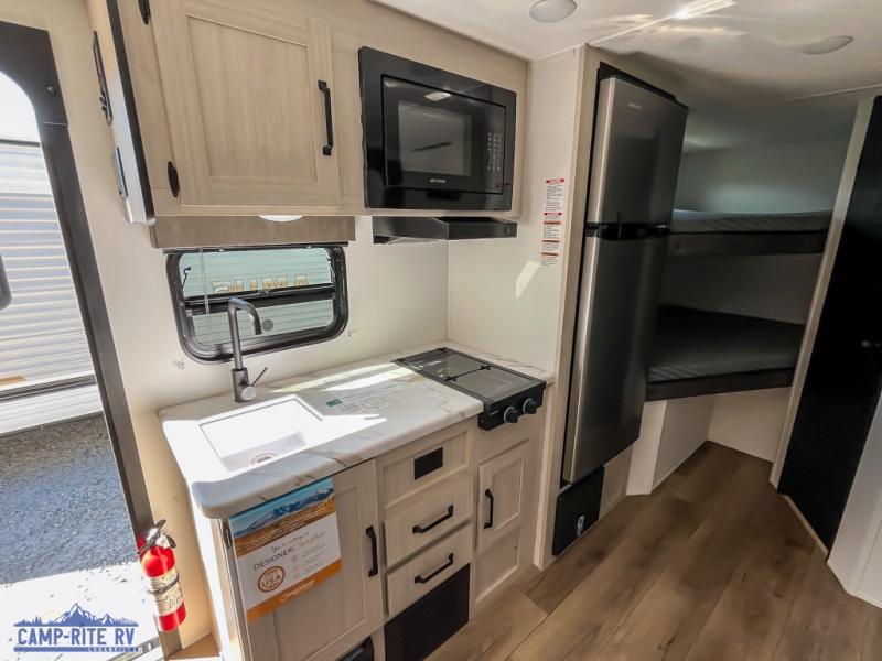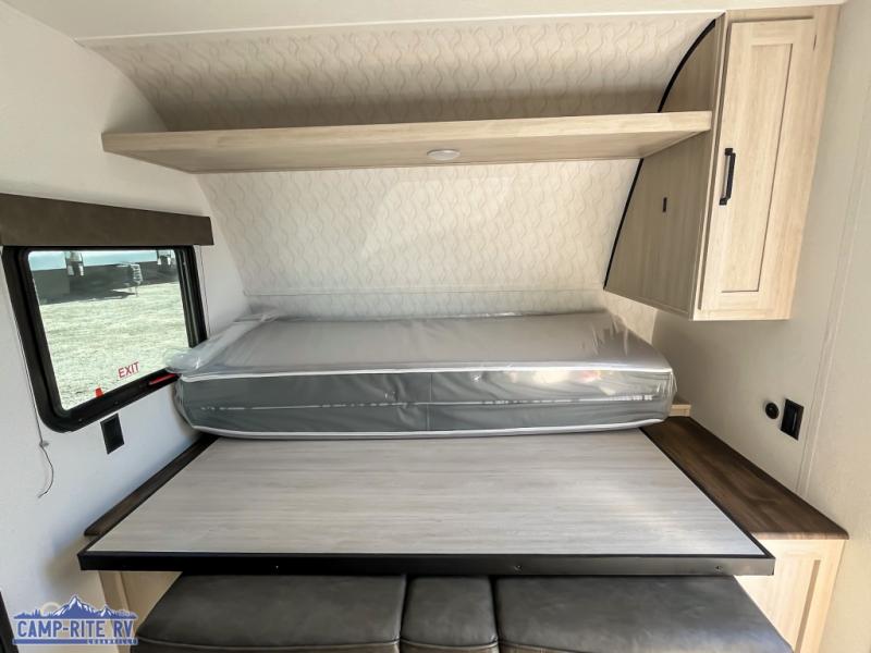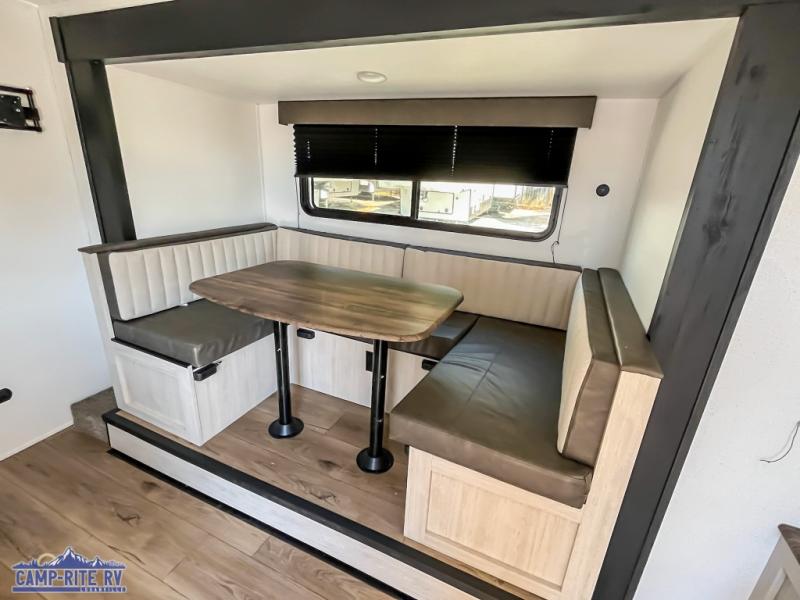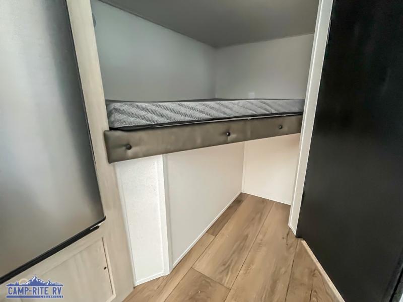 The whole gang will love camping in this travel trailer since there are double-size bunks for compact sleeping spaces and a slide out for more space to relax! The front RV queen bed is sure to provide a great night's rest, and you can choose the optional Murphy bed if you're needing more seating space during the day. Once you've made dinner on the two burner cooktop, you can dine around the U-shaped dinette. And an optional mini kitchen with a griddle is available if you'd rather cook outdoors! This unit includes ample storage space for your things, including exterior storage and storage under the bunks!