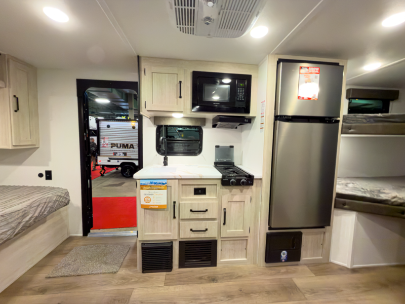 The Puma Camping Edition by Forest River offer an affordable travel trailer for rookie campers or seasoned RVers! They are built with 5/8" tongue and groove plywood flooring and a front diamond plate for added protection. There are also exterior magnetic baggage door latches, back up camera prep, a battery disconnect. Head inside to find Thermofoil countertops with a smooth drop edge, bedroom USB ports and outlets, and pleated shades in the living room.