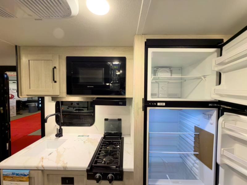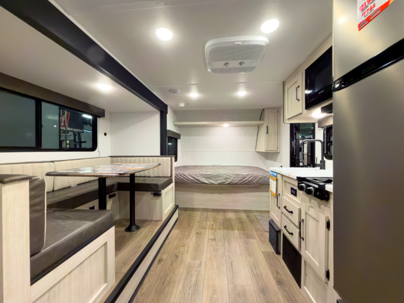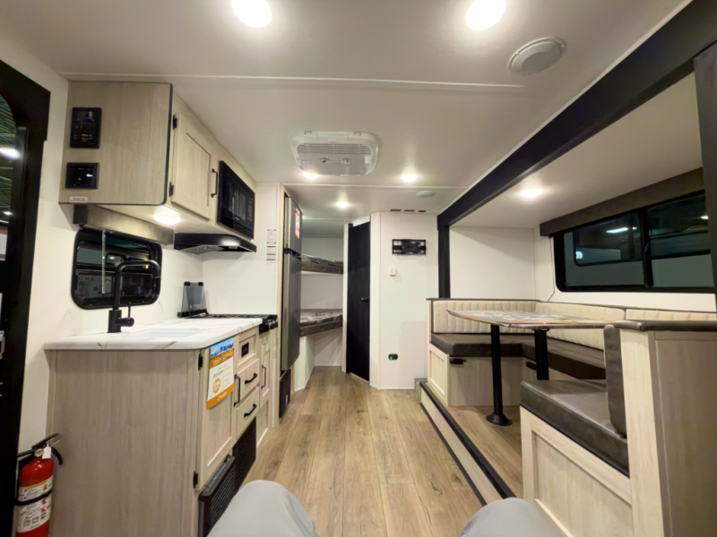 The whole gang will love camping in this travel trailer since there are double-size bunks for compact sleeping spaces and a slide out for more space to relax! The front RV queen bed is sure to provide a great night's rest, and you can choose the optional Murphy bed if you're needing more seating space during the day. Once you've made dinner on the two-burner cooktop, you can dine around the U-shaped dinette. And an optional mini kitchen with a griddle is available if you'd rather cook outdoors! This unit includes ample storage space for your things, including exterior storage and storage under the bunks!