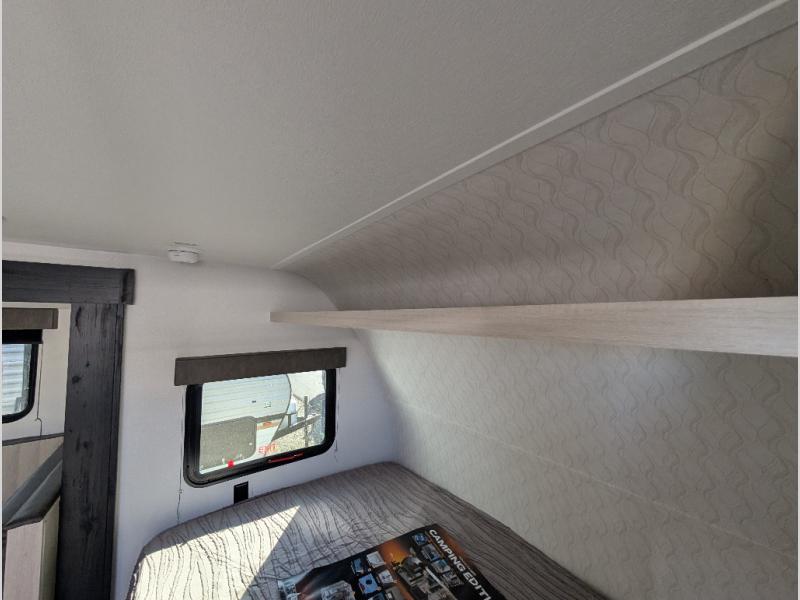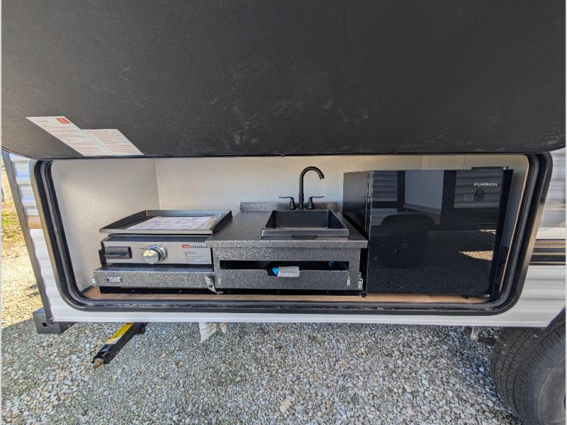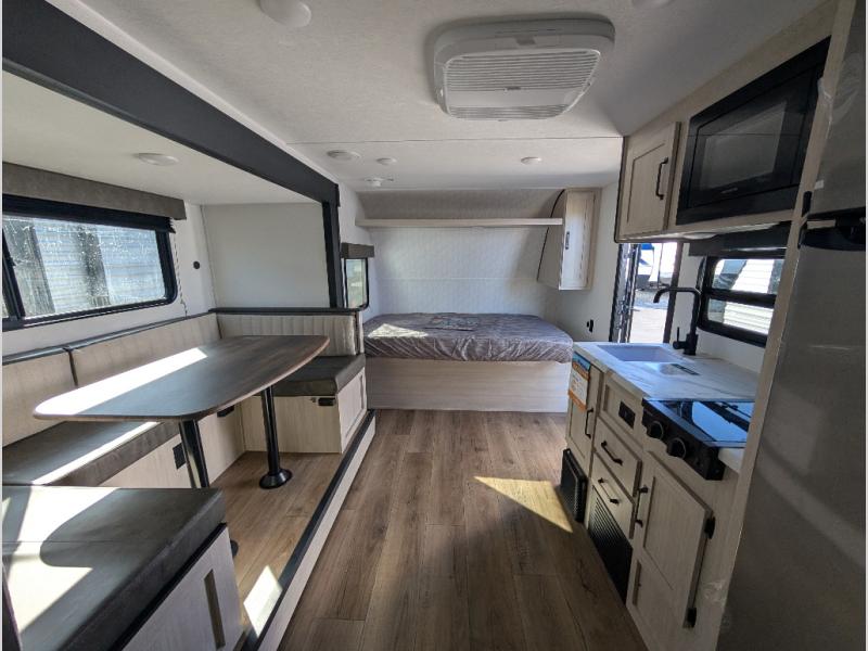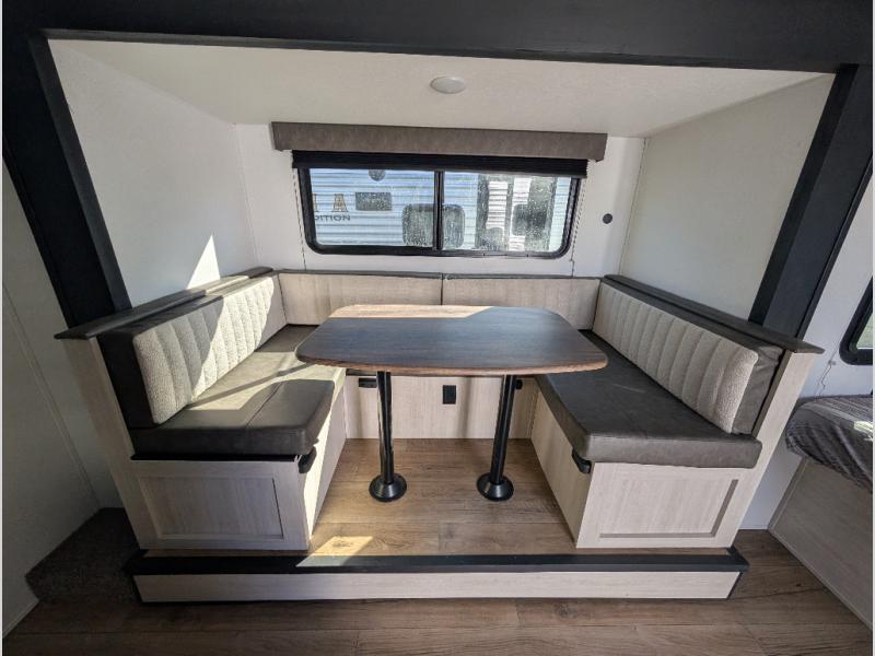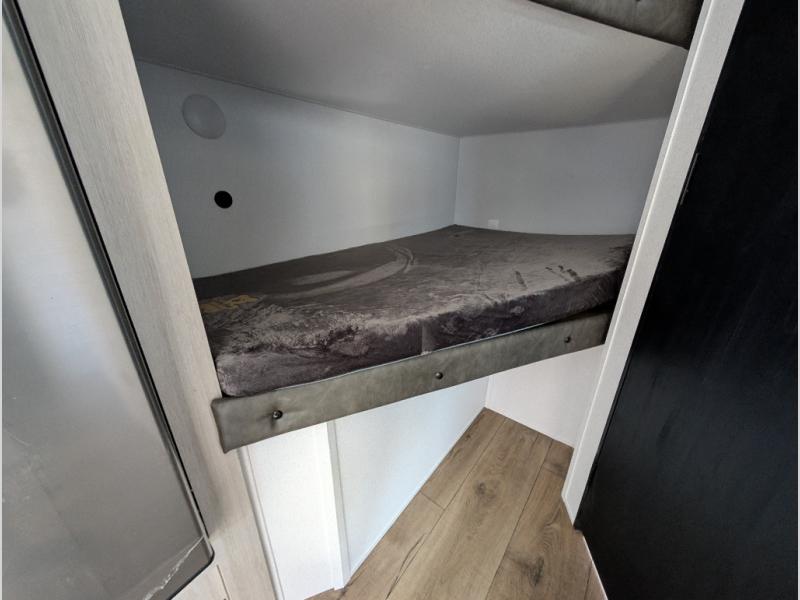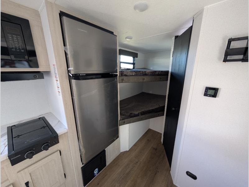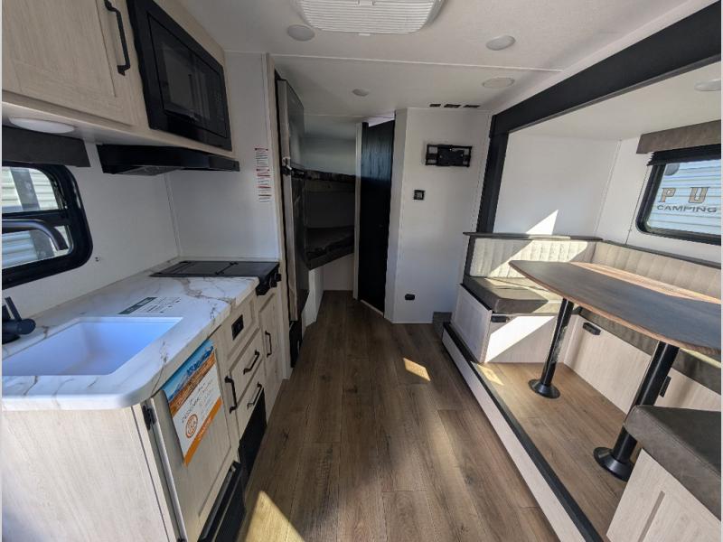 The whole gang will love camping in this travel trailer since there are double-size bunks for compact sleeping spaces and a slide out for more space to relax! The front RV queen bed is sure to provide a great night's rest, and you can choose the optional Murphy bed if you're needing more seating space during the day. Once you've made dinner on the two-burner cooktop, you can dine around the U-shaped dinette. And an optional mini kitchen with a griddle is available if you'd rather cook outdoors! This unit includes ample storage space for your things, including exterior storage and storage under the bunks!