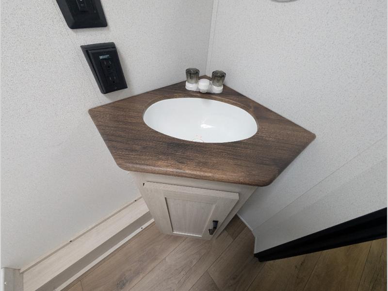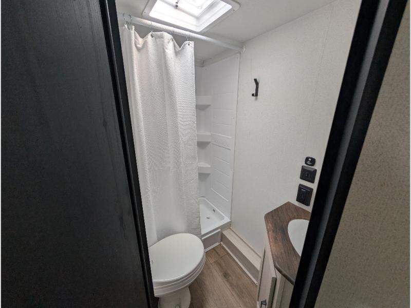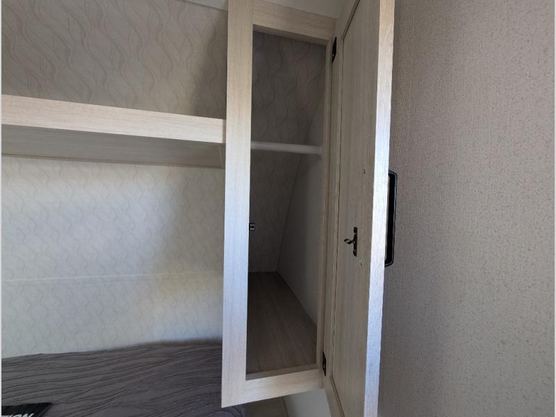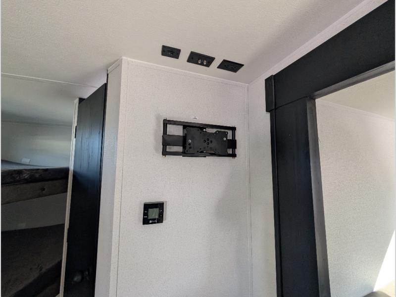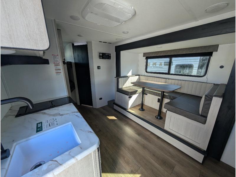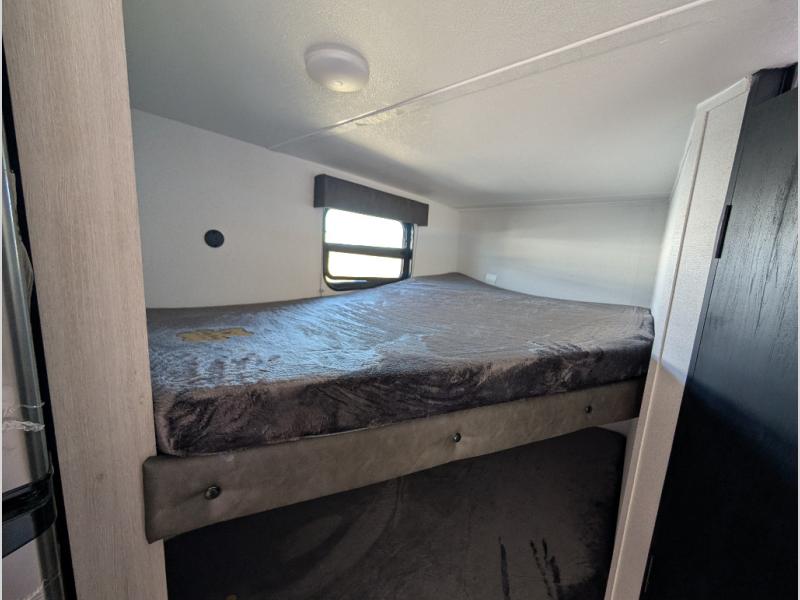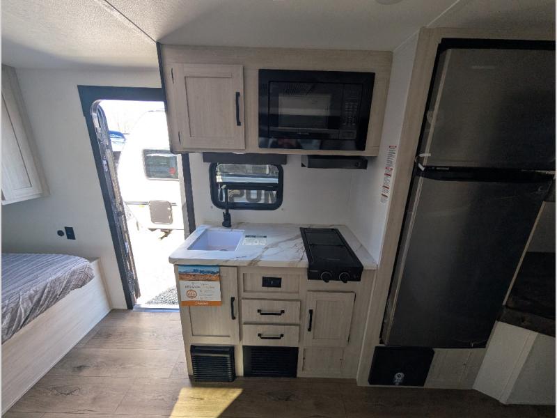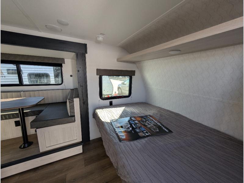 The whole gang will love camping in this travel trailer since there are double-size bunks for compact sleeping spaces and a slide out for more space to relax! The front RV queen bed is sure to provide a great night's rest, and you can choose the optional Murphy bed if you're needing more seating space during the day. Once you've made dinner on the two-burner cooktop, you can dine around the U-shaped dinette. And an optional mini kitchen with a griddle is available if you'd rather cook outdoors! This unit includes ample storage space for your things, including exterior storage and storage under the bunks!