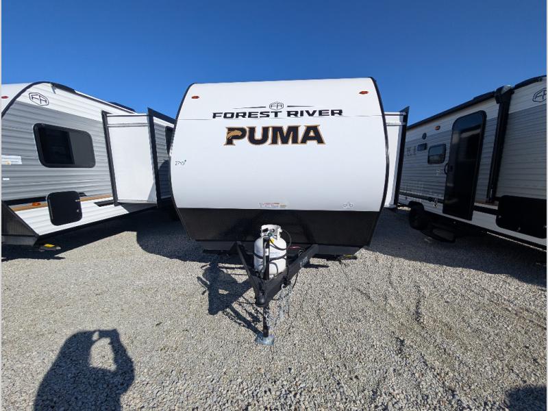 The Puma Camping Edition by Forest River offer an affordable travel trailer for rookie campers or seasoned RVers! They are built with 5/8" tongue and groove plywood flooring and a front diamond plate for added protection. There are also exterior magnetic baggage door latches, back up camera prep, a battery disconnect. Head inside to find Thermofoil countertops with a smooth drop edge, bedroom USB ports and outlets, and pleated shades in the living room.