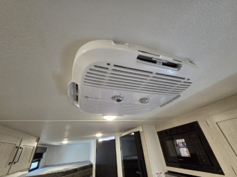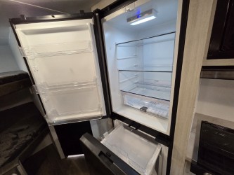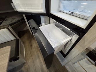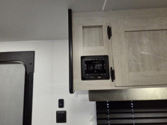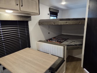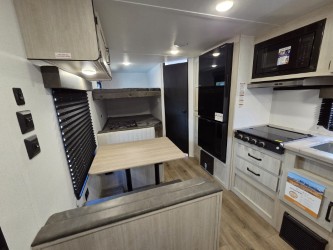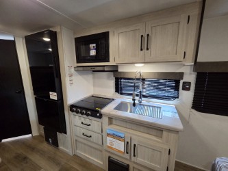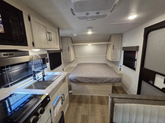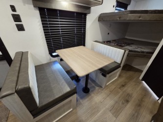 If you're looking for more sleeping space, this double axle unit features double-size bunks with storage under the bunks for your bags. The full kitchen includes a stainless microwave and three burner cooktop to make meals, plus a pantry and 12V refrigerator for food storage. And an optional outside mini kitchen with a griddle can be added if you enjoy cooking outdoors! Up front, you'll find a 60" x 74" queen bed with an optional Murphy bed if you're needing more seating space during the day!