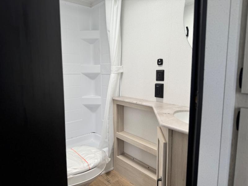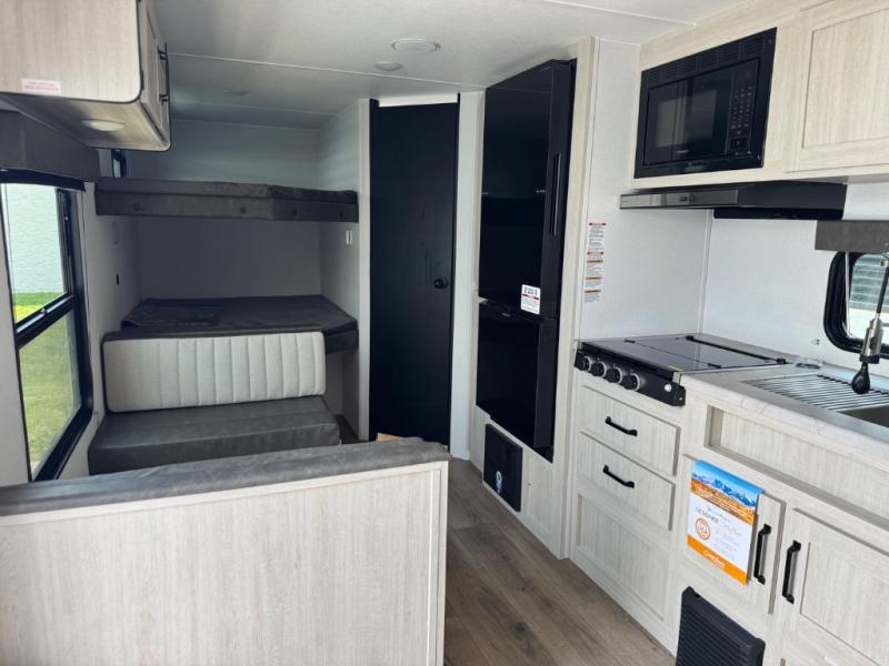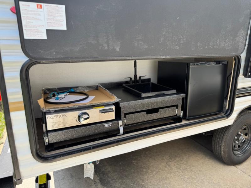 If you're looking for more sleeping space, this double axle unit features double-size bunks with storage under the bunks for your bags. The full kitchen includes a stainless microwave and three burner cooktop to make meals, plus a pantry and 12V refrigerator for food storage. And an optional outside mini kitchen with a griddle can be added if you enjoy cooking outdoors! Up front, you'll find a 60" x 74" queen bed with an optional Murphy bed if you're needing more seating space during the day!