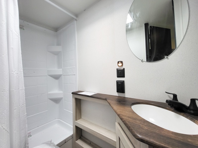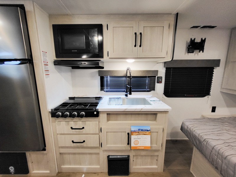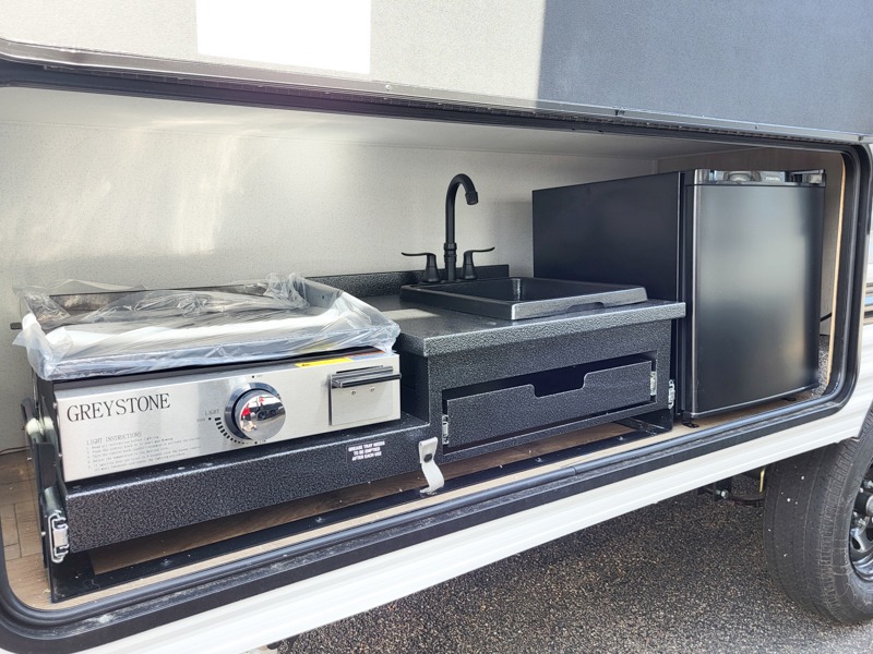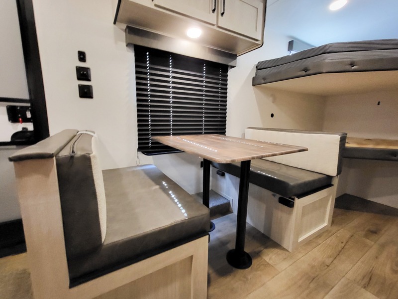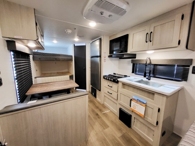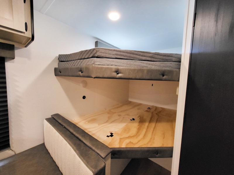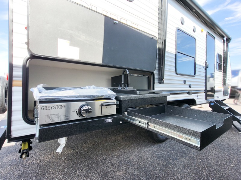 If you're looking for more sleeping space, this double axle unit features double-size bunks with storage under the bunks for your bags. The full kitchen includes a stainless microwave and three burner cooktop to make meals, plus a pantry and 12V refrigerator for food storage. And an optional outside mini kitchen with a griddle can be added if you enjoy cooking outdoors! Up front, you'll find a 60" x 74" queen bed with an optional Murphy bed if you're needing more seating space during the day!