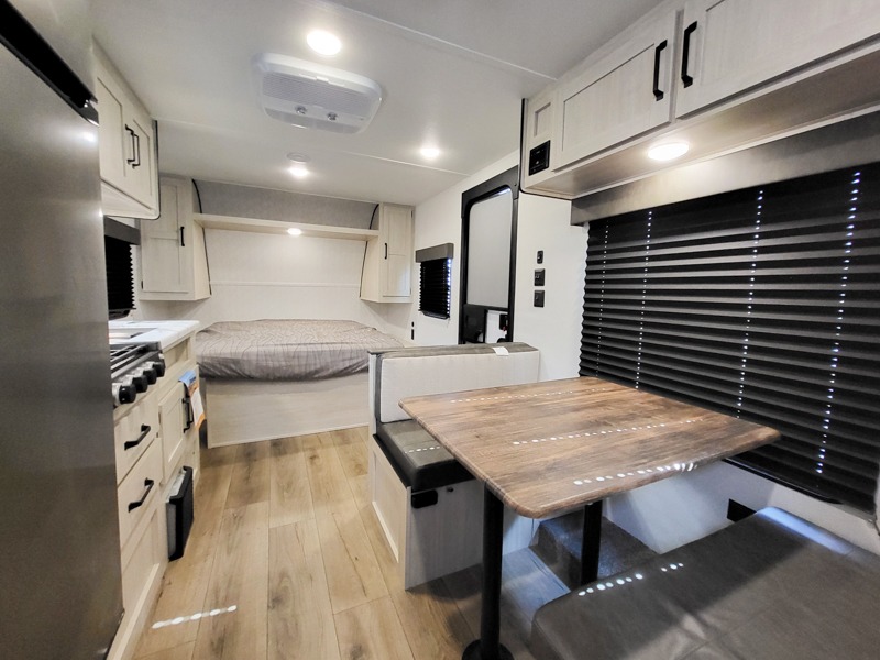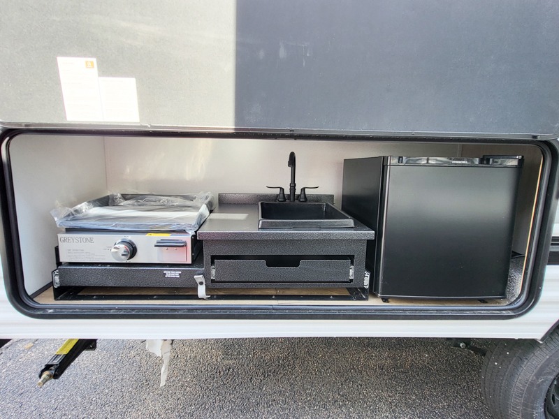 If you're looking for more sleeping space, this double axle unit features double-size bunks with storage under the bunks for your bags. The full kitchen includes a stainless microwave and three burner cooktop to make meals, plus a pantry and 12V refrigerator for food storage. And an optional outside mini kitchen with a griddle can be added if you enjoy cooking outdoors! Up front, you'll find a 60" x 74" queen bed with an optional Murphy bed if you're needing more seating space during the day!