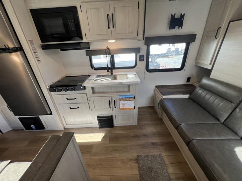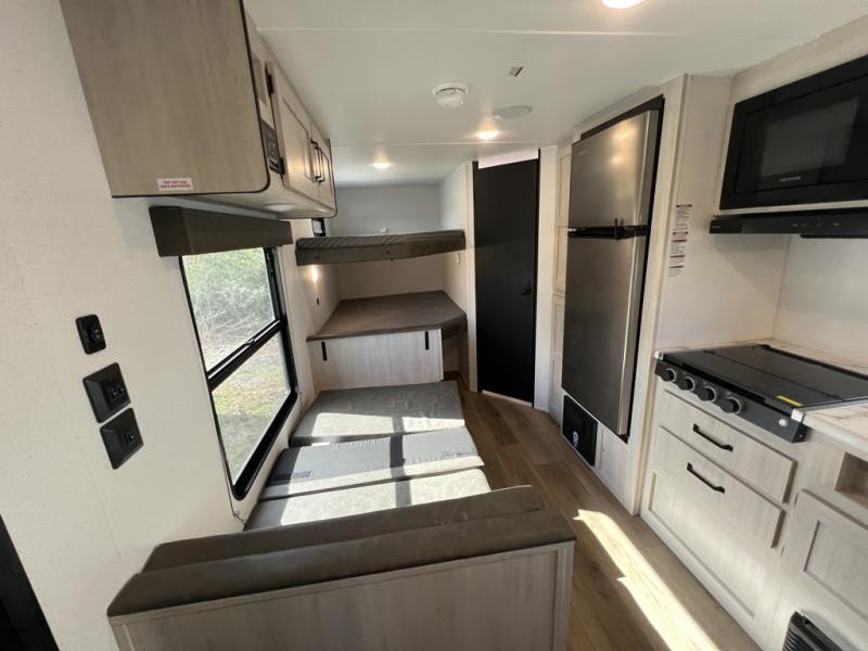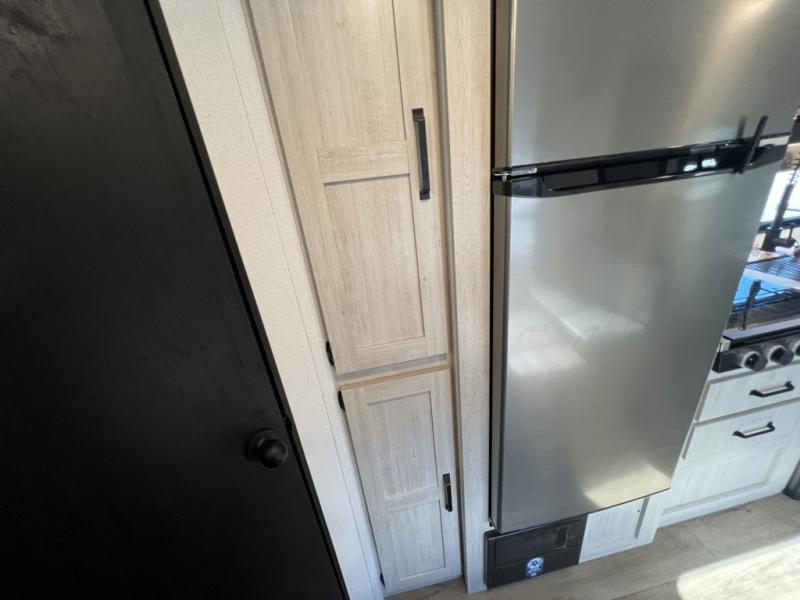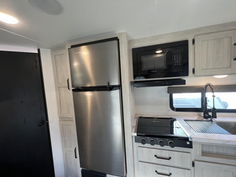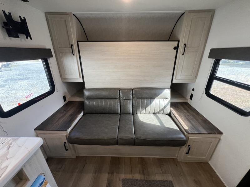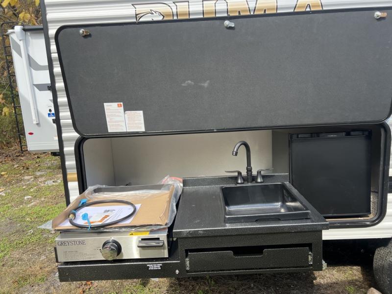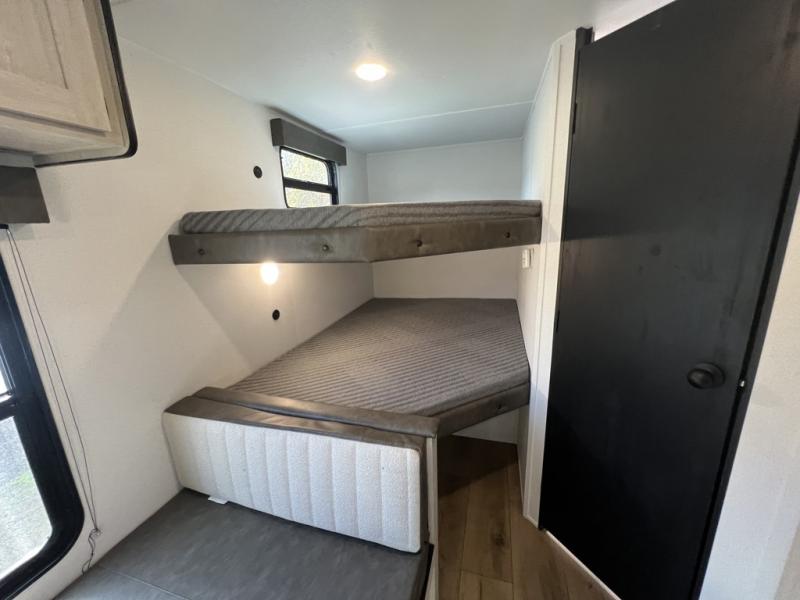 If you're looking for more sleeping space, this double axle unit features double-size bunks with storage under the bunks for your bags. The full kitchen includes a stainless microwave and three burner cooktop to make meals, plus a pantry and 12V refrigerator for food storage. And an optional outside mini kitchen with a griddle can be added if you enjoy cooking outdoors! Up front, you'll find a 60" x 74" queen bed with an optional Murphy bed if you're needing more seating space during the day!