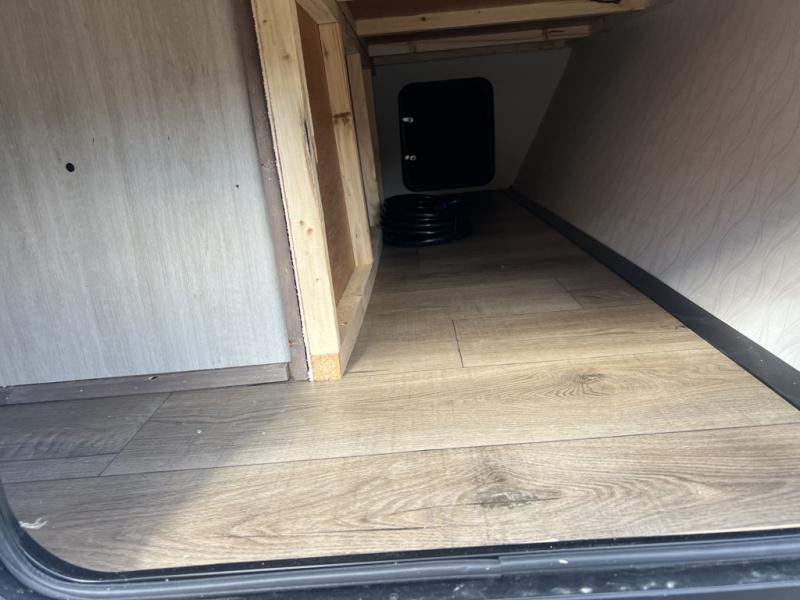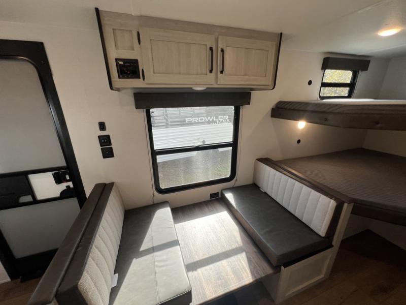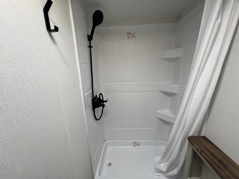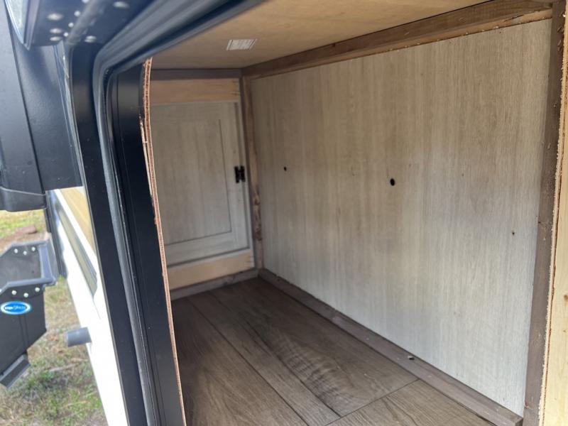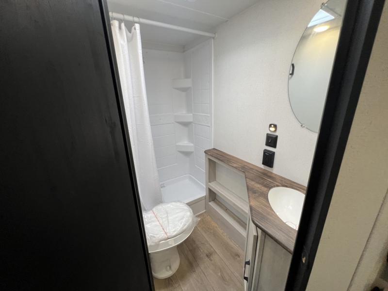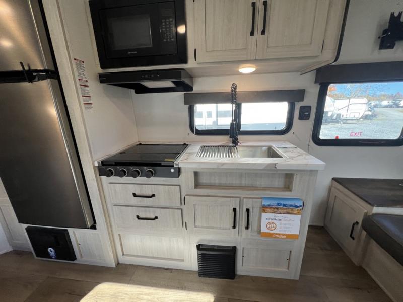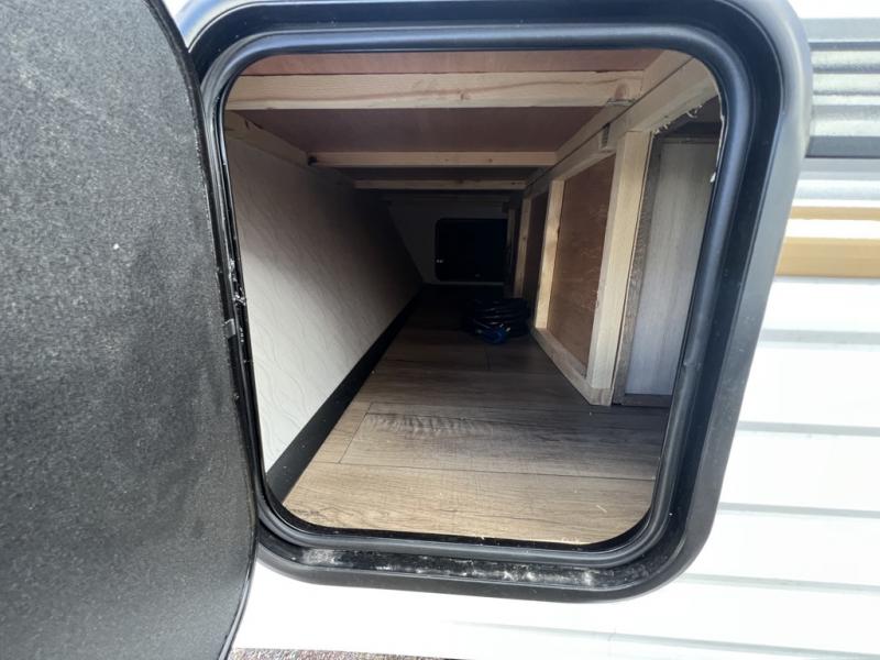 If you're looking for more sleeping space, this double axle unit features double-size bunks with storage under the bunks for your bags. The full kitchen includes a stainless microwave and three burner cooktop to make meals, plus a pantry and 12V refrigerator for food storage. And an optional outside mini kitchen with a griddle can be added if you enjoy cooking outdoors! Up front, you'll find a 60" x 74" queen bed with an optional Murphy bed if you're needing more seating space during the day!