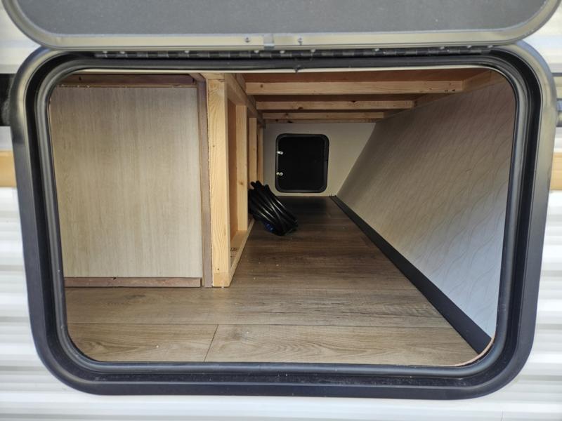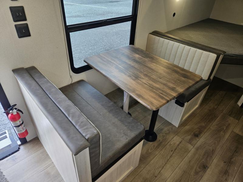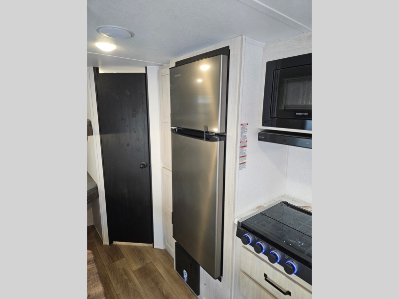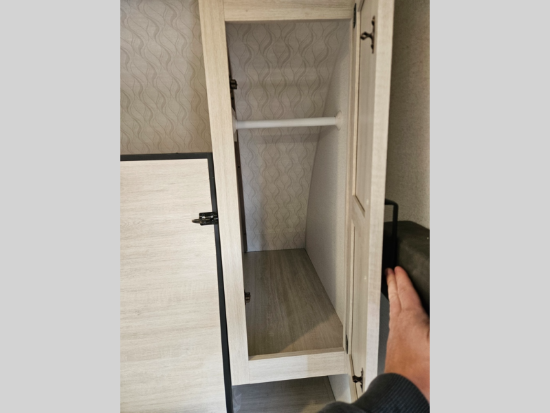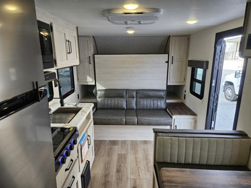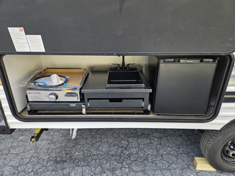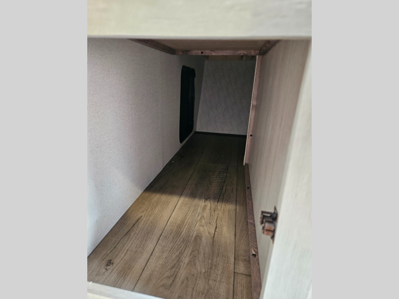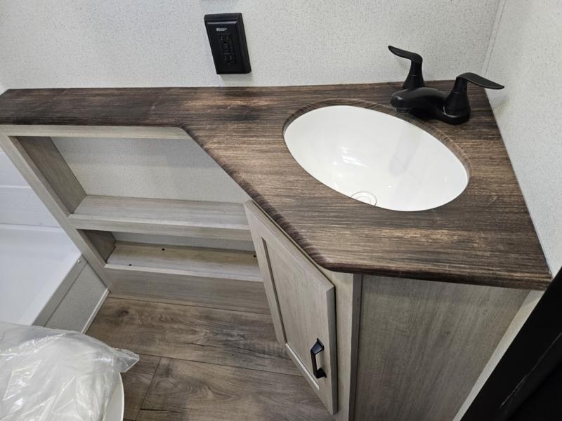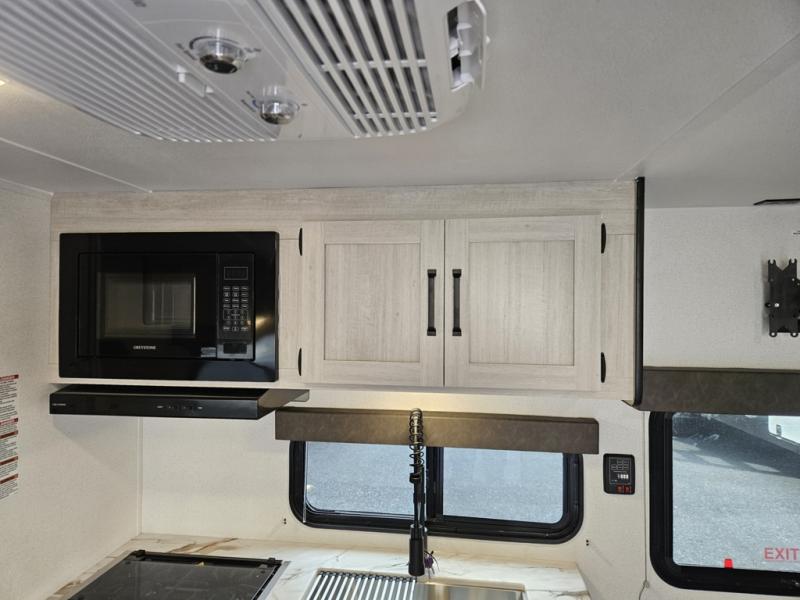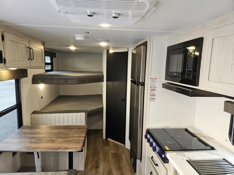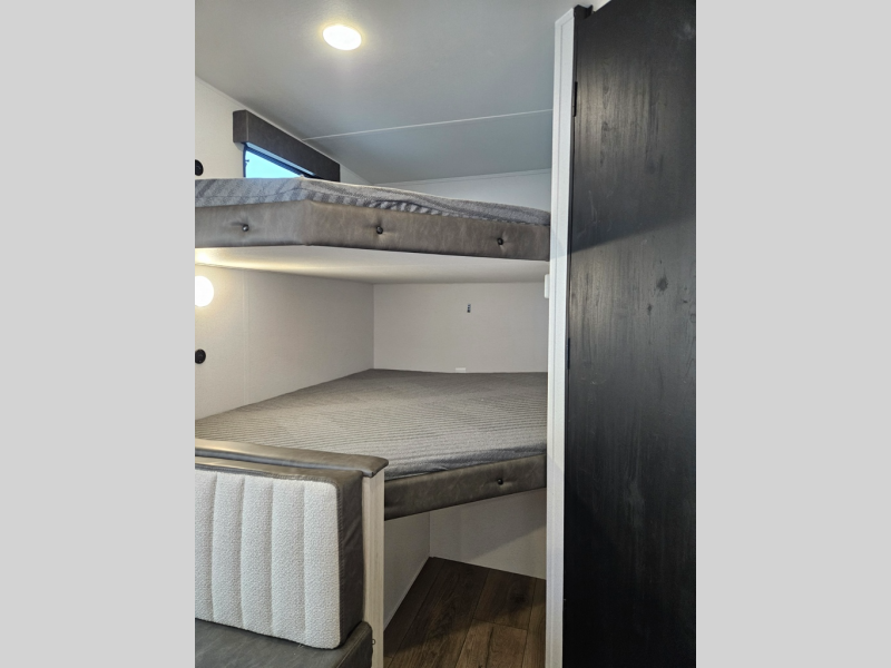 If you're looking for more sleeping space, this double axle unit features double-size bunks with storage under the bunks for your bags. The full kitchen includes a stainless microwave and three burner cooktop to make meals, plus a pantry and 12V refrigerator for food storage. And an optional outside mini kitchen with a griddle can be added if you enjoy cooking outdoors! Up front, you'll find a 60" x 74" queen bed with an optional Murphy bed if you're needing more seating space during the day!