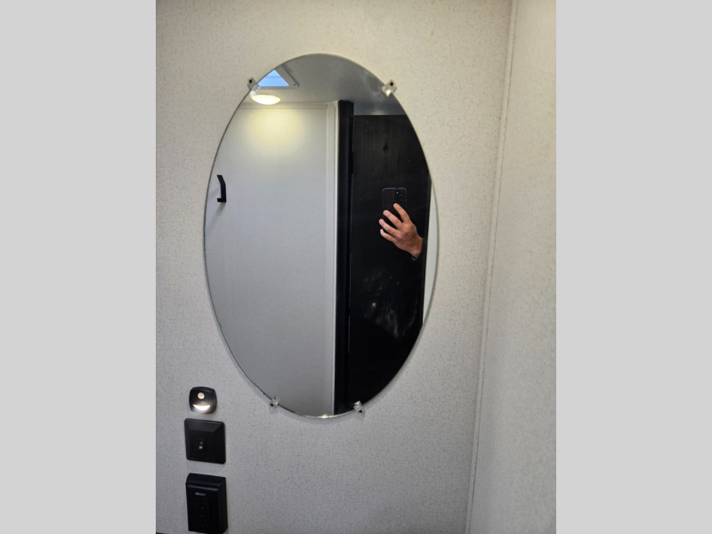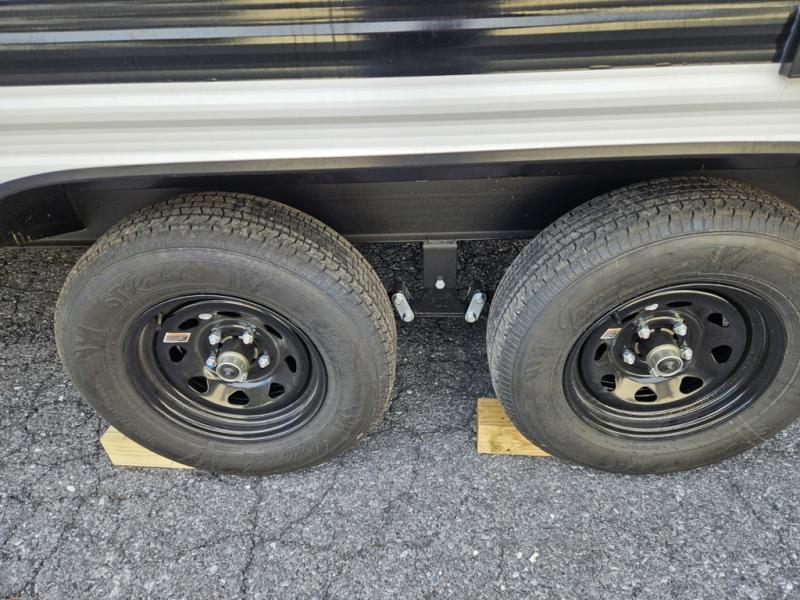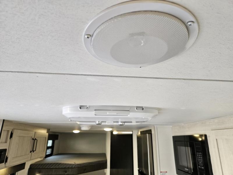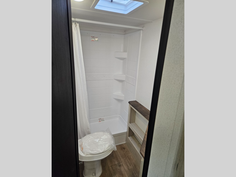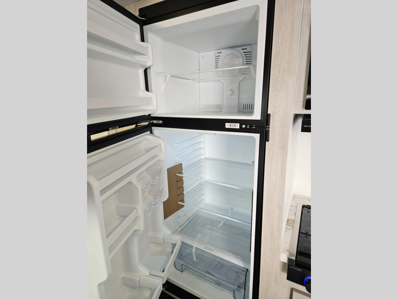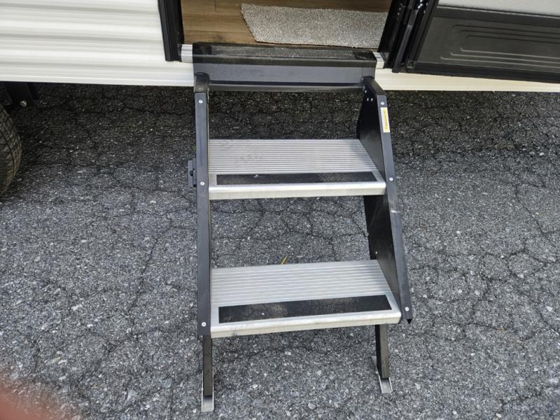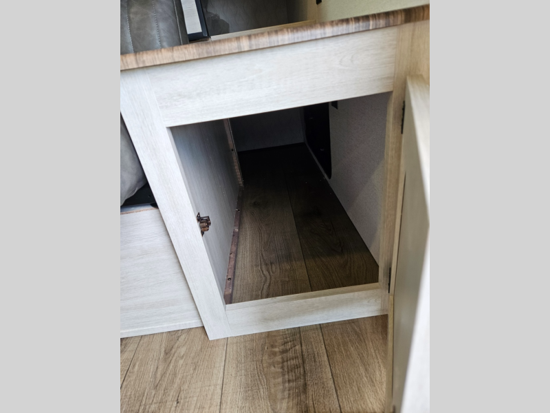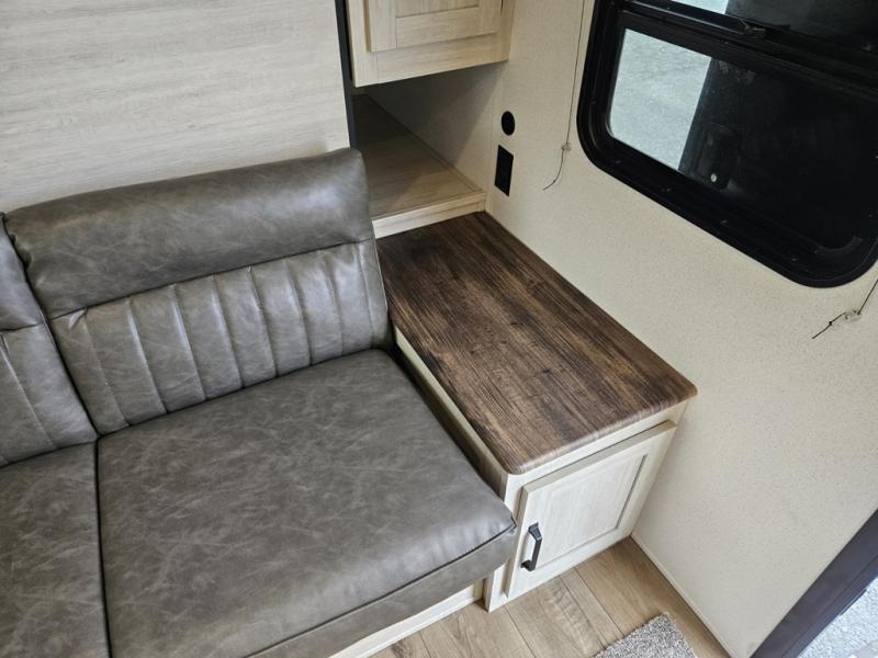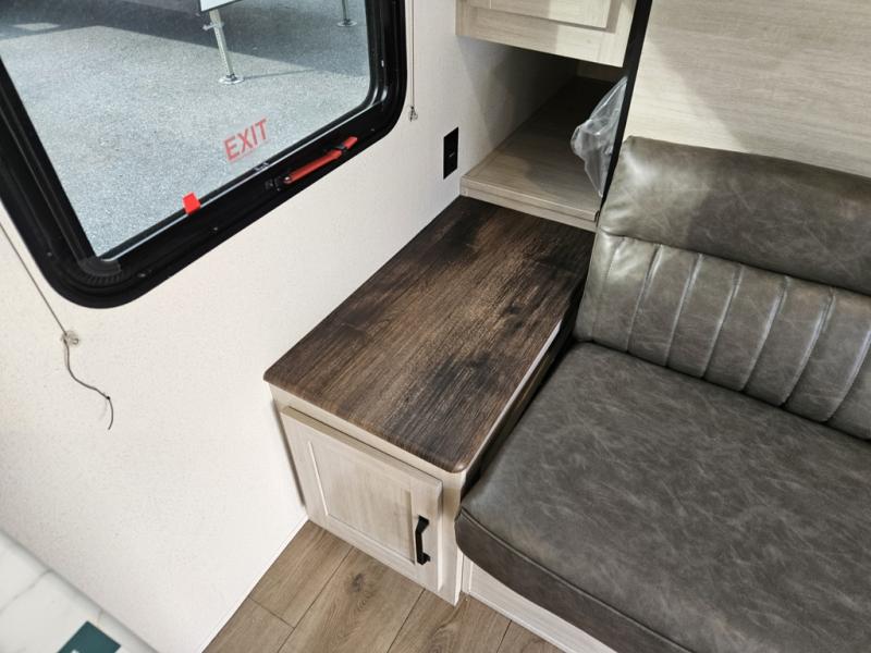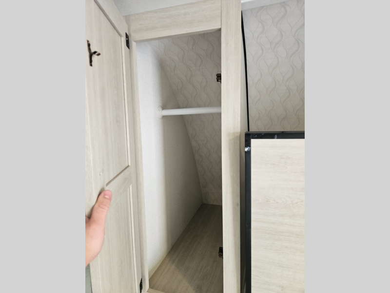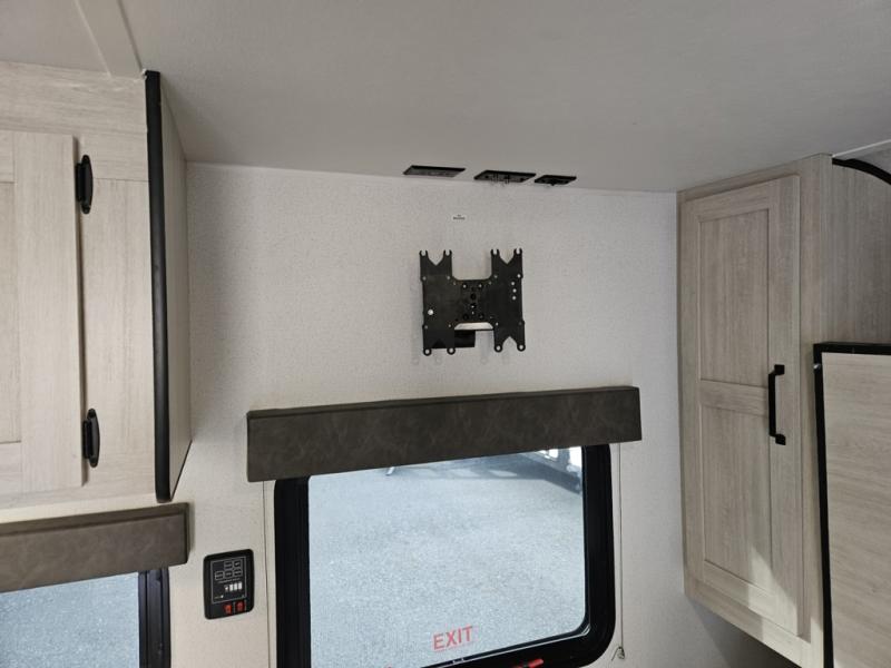If you're looking for more sleeping space, this double axle unit features double-size bunks with storage under the bunks for your bags. The full kitchen includes a stainless microwave and three burner cooktop to make meals, plus a pantry and 12V refrigerator for food storage. And an optional outside mini kitchen with a griddle can be added if you enjoy cooking outdoors! Up front, you'll find a 60" x 74" queen bed with an optional Murphy bed if you're needing more seating space during the day!
