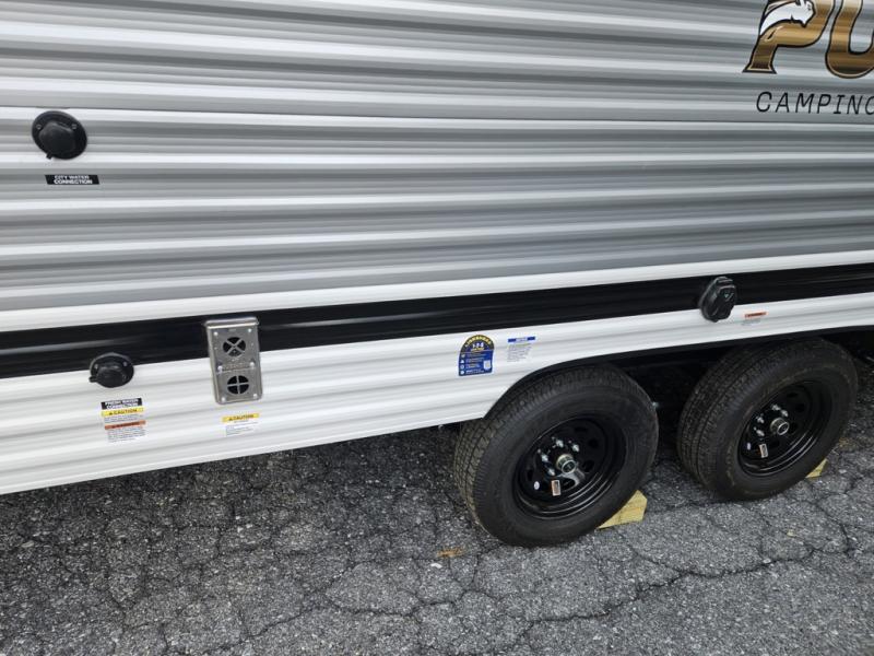 The Puma Camping Edition by Palomino offer an affordable travel trailer for rookie campers or seasoned RVers! They are built with 5/8" tongue and groove plywood flooring and a front diamond plate for added protection. There are also exterior clamp style door latches, back up camera prep, and 20 lb. LP bottles. Head inside to find Thermofoil countertops with a smooth drop edge, bedroom USB ports and outlets, and a GE appliance and kitchen package.