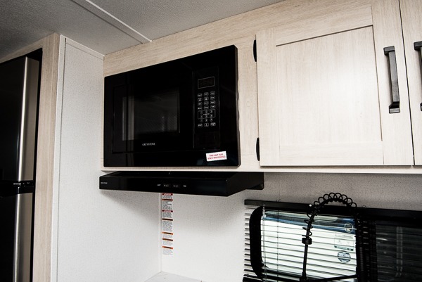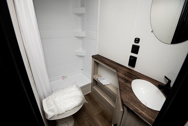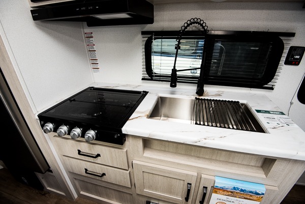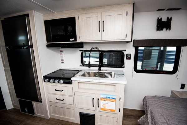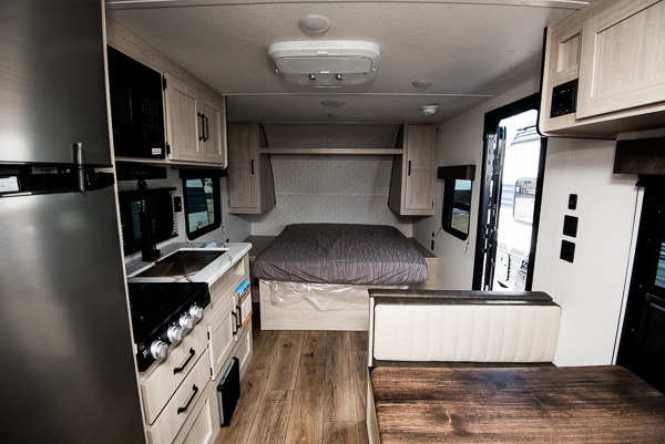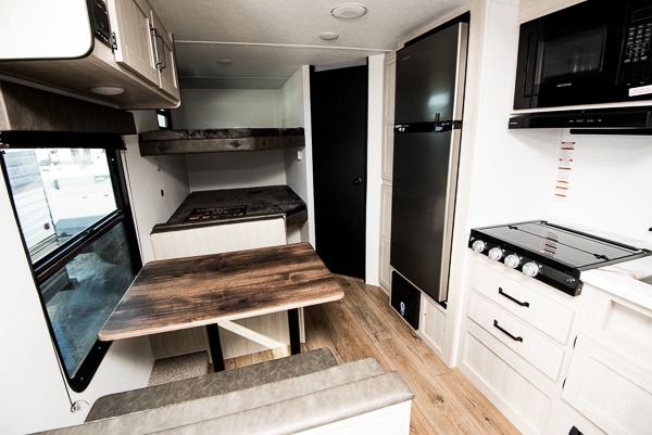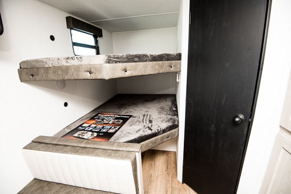 If you're looking for more sleeping space, this double axle unit features double-size bunks with storage under the bunks for your bags. The full kitchen includes a microwave and three burner cooktop to make meals, plus a pantry and 12V refrigerator for food storage. And an optional outside mini kitchen with a griddle can be added if you enjoy cooking outdoors! Up front, you'll find a 60" x 74" queen bed with an optional Murphy bed if you're needing more seating space during the day!