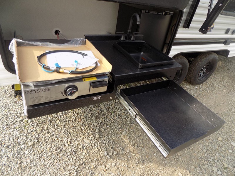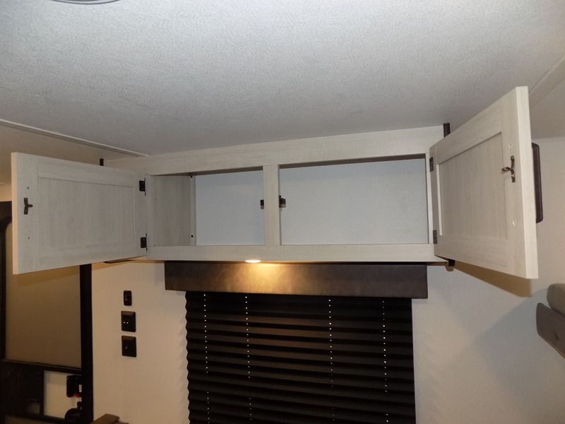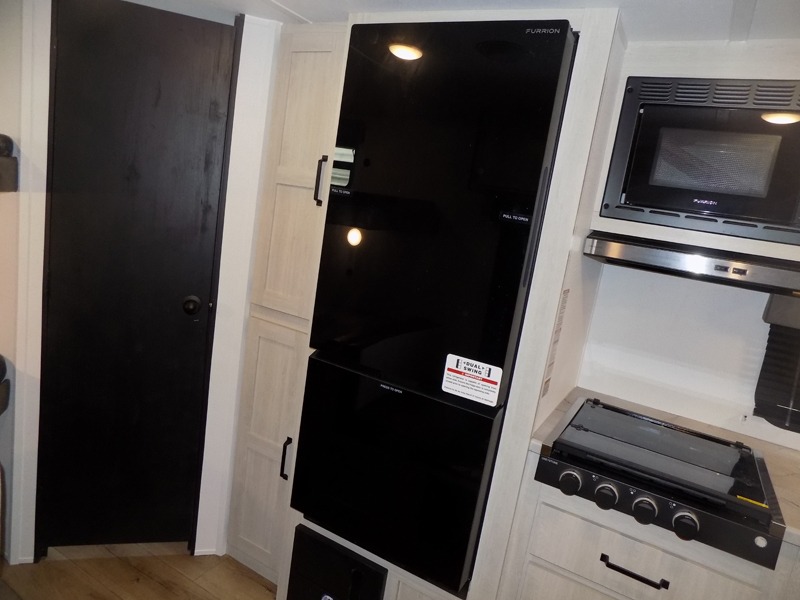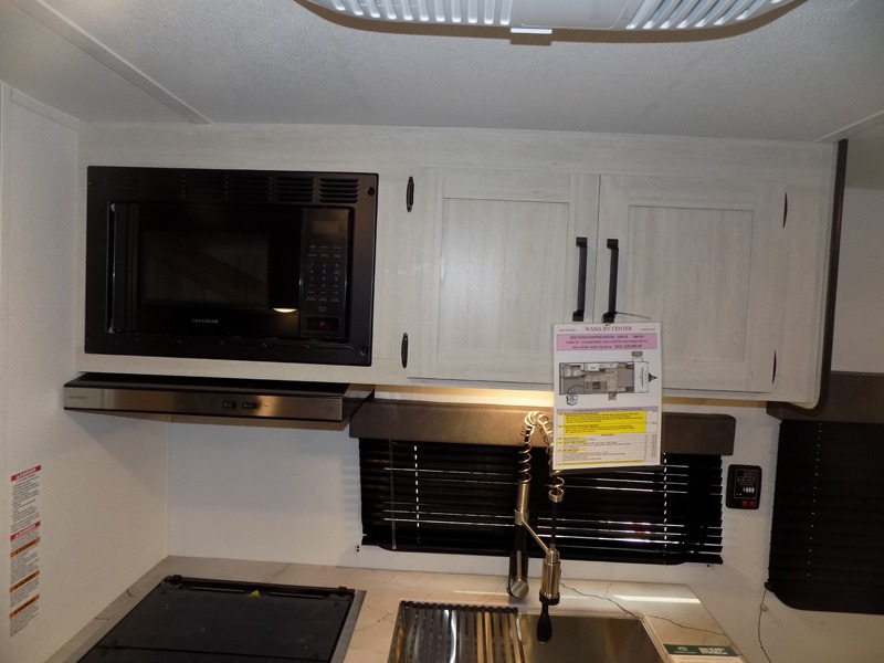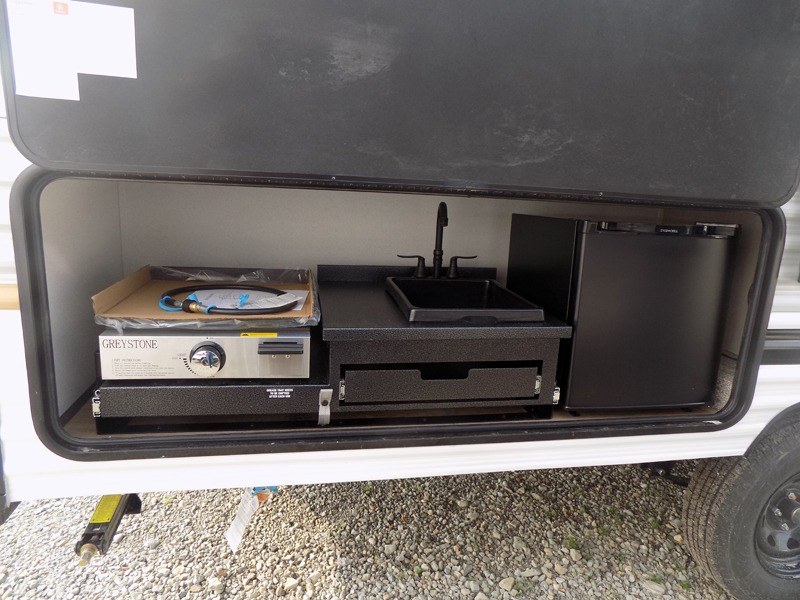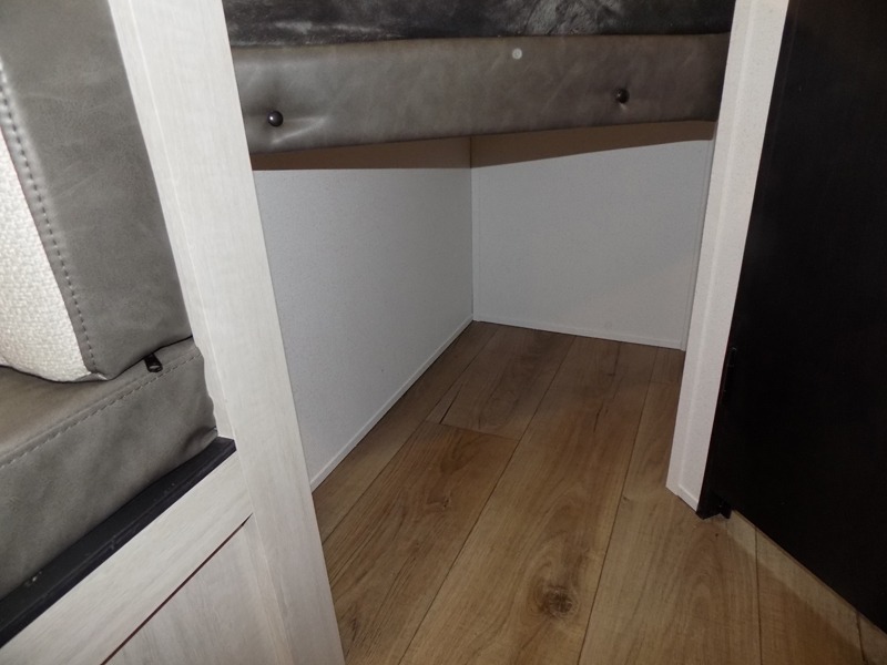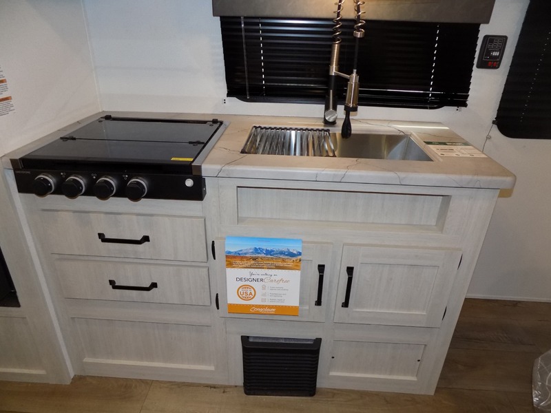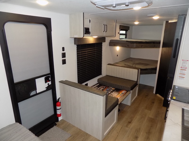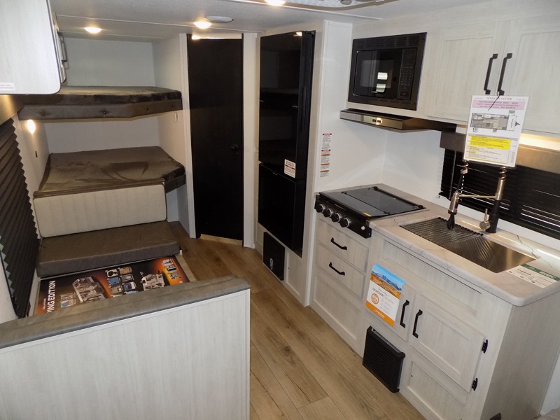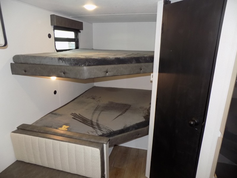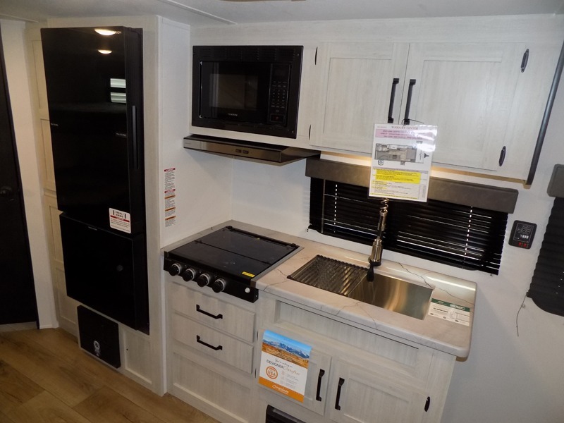 If you're looking for more sleeping space, this double axle unit features double-size bunks with storage under the bunks for your bags. The full kitchen includes a stainless microwave and three burner cooktop to make meals, plus a pantry and 12V refrigerator for food storage. And an optional outside mini kitchen with a griddle can be added if you enjoy cooking outdoors! Up front, you'll find a 60" x 74" queen bed with an optional Murphy bed if you're needing more seating space during the day!
