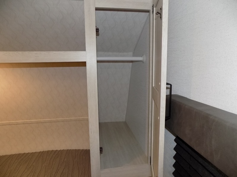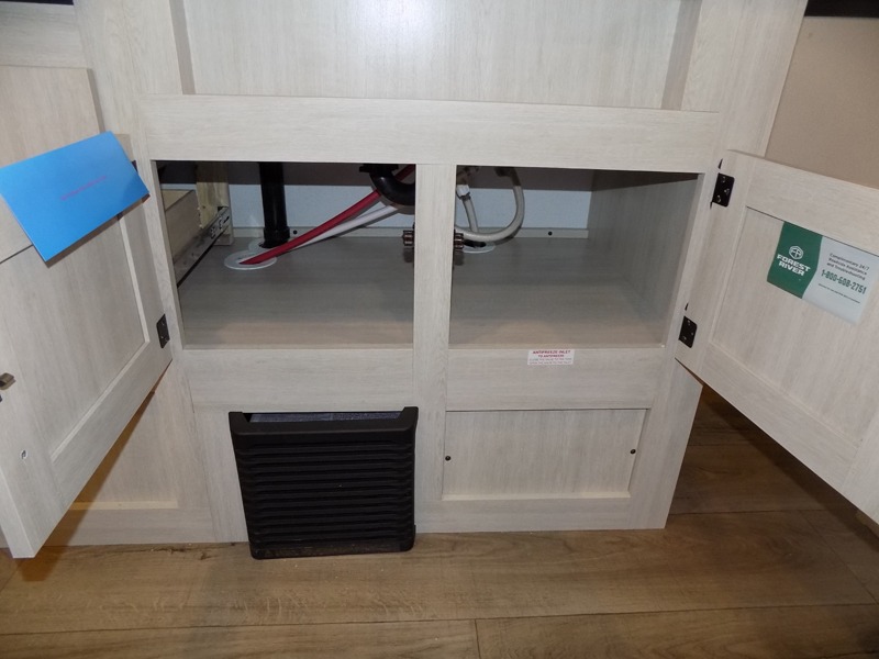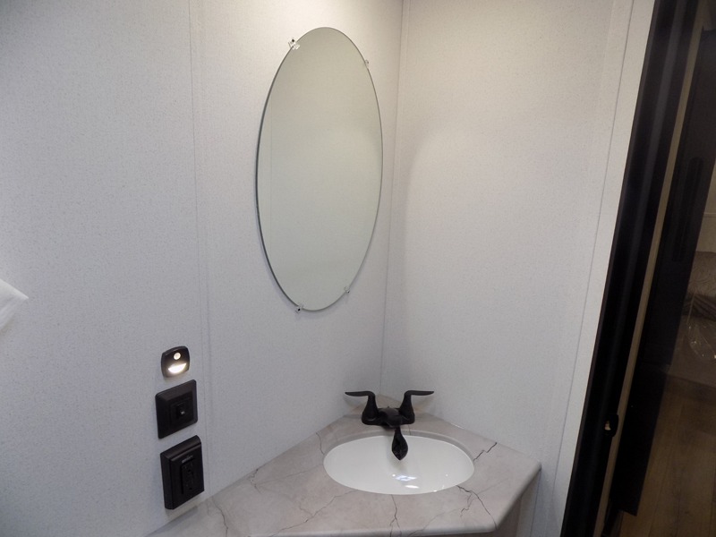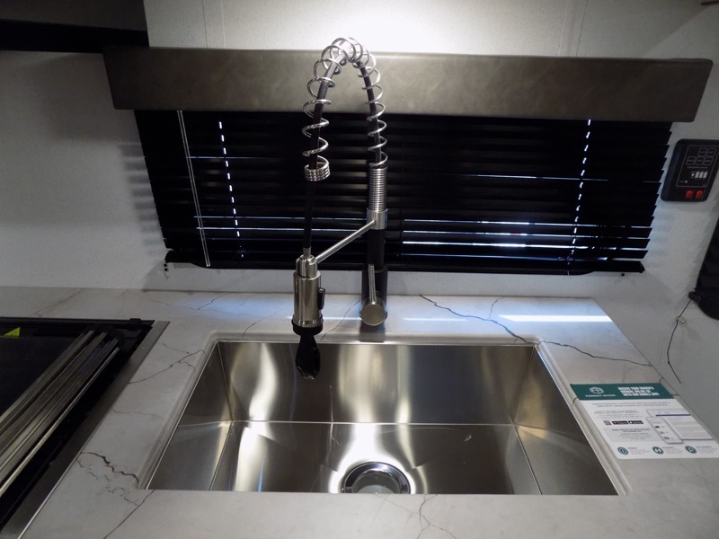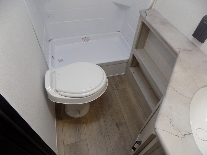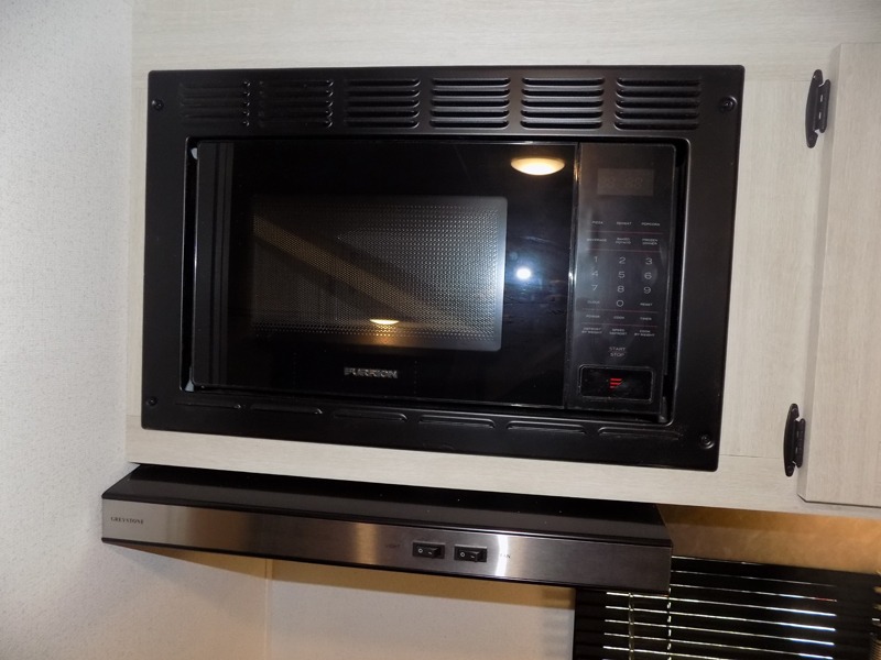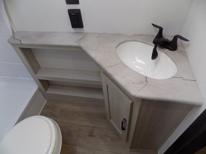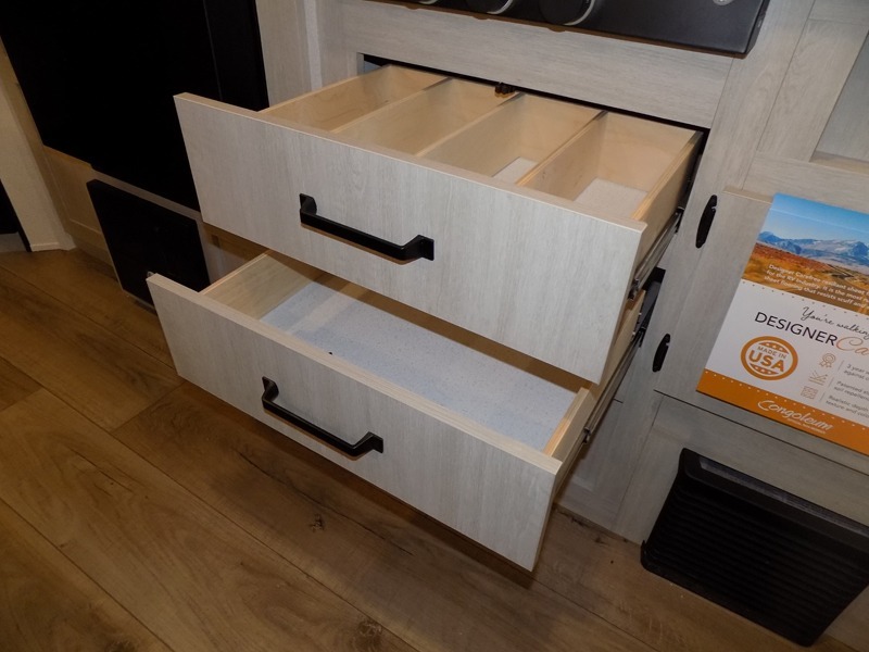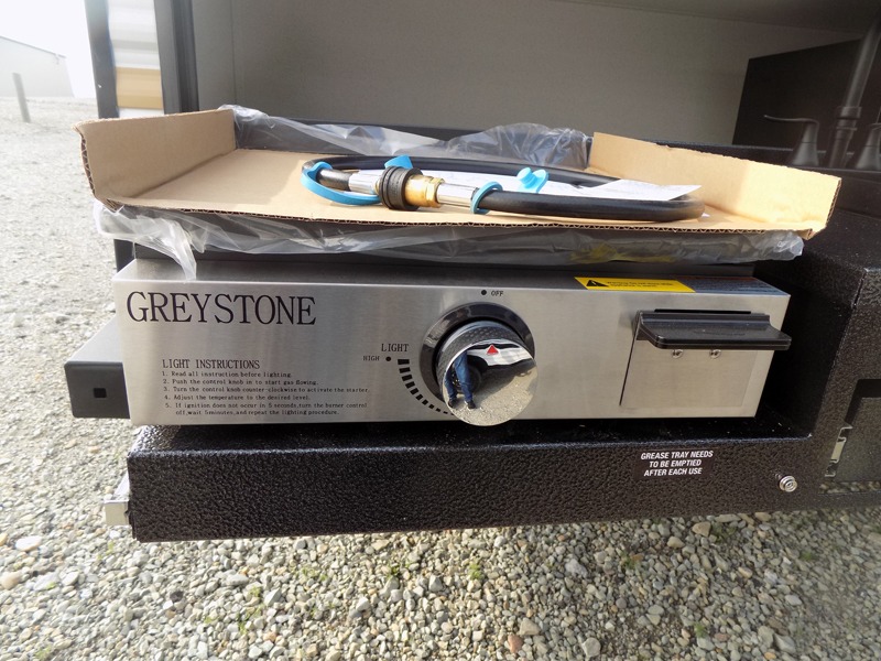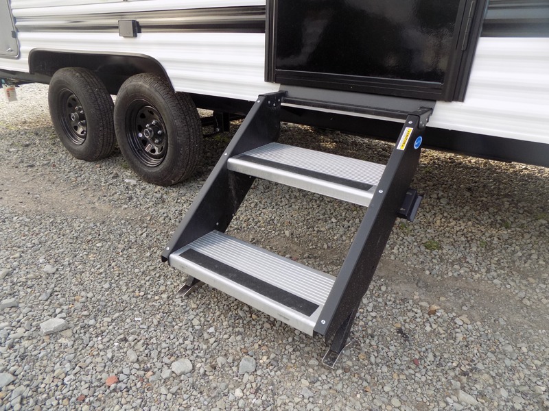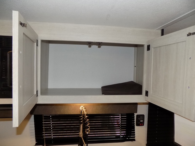 If you're looking for more sleeping space, this double axle unit features double-size bunks with storage under the bunks for your bags. The full kitchen includes a stainless microwave and three burner cooktop to make meals, plus a pantry and 12V refrigerator for food storage. And an optional outside mini kitchen with a griddle can be added if you enjoy cooking outdoors! Up front, you'll find a 60" x 74" queen bed with an optional Murphy bed if you're needing more seating space during the day!
