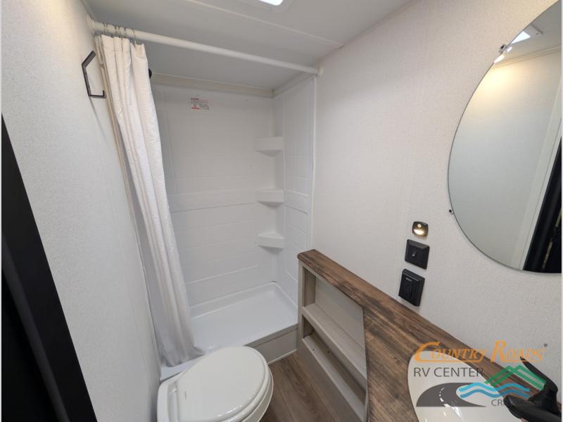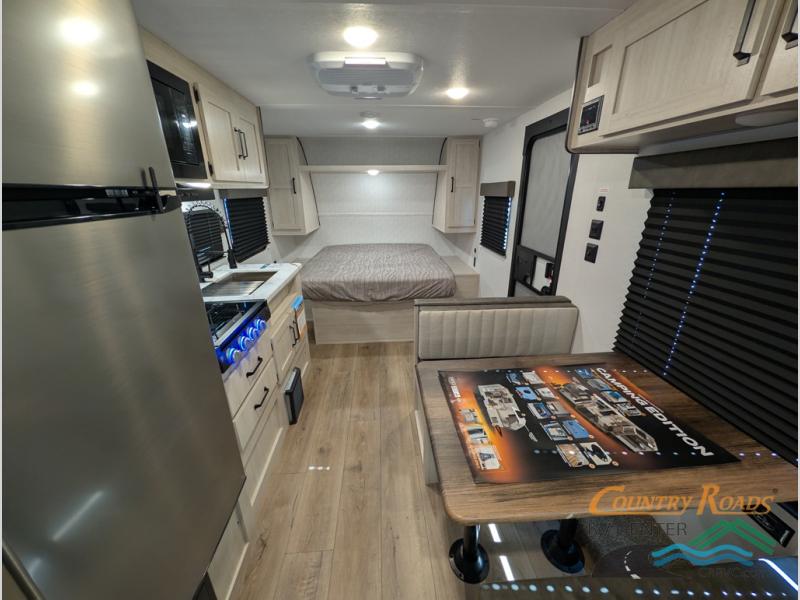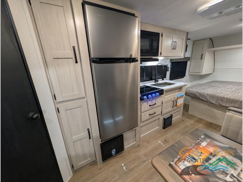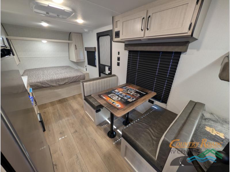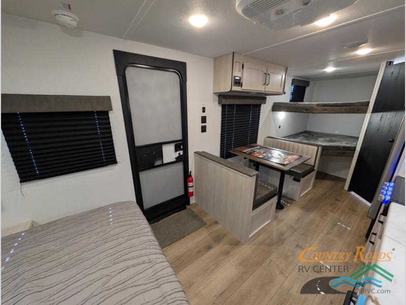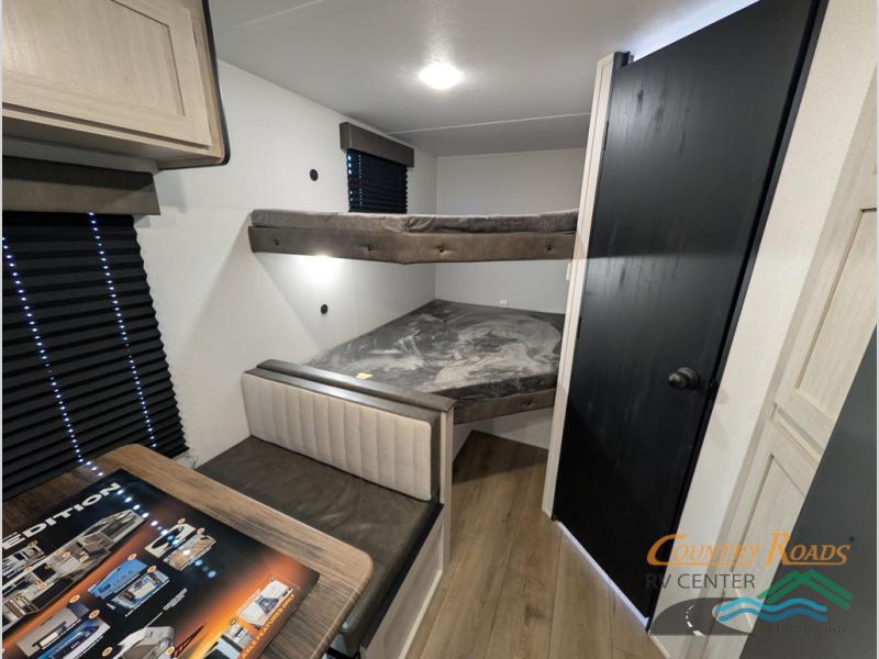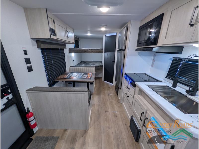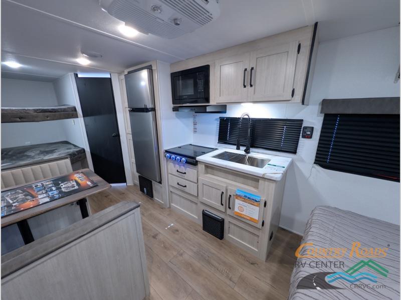 If you're looking for more sleeping space, this double axle unit features double-size bunks with storage under the bunks for your bags. The full kitchen includes a microwave and three burner cooktop to make meals, plus a pantry and 12V refrigerator for food storage. And an optional outside mini kitchen with a griddle can be added if you enjoy cooking outdoors! Up front, you'll find a 60" x 74" queen bed with an optional Murphy bed if you're needing more seating space during the day!