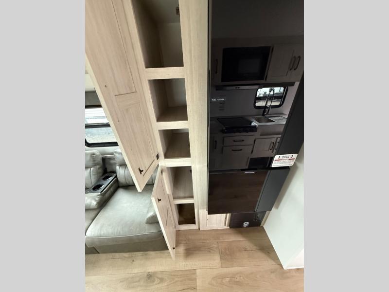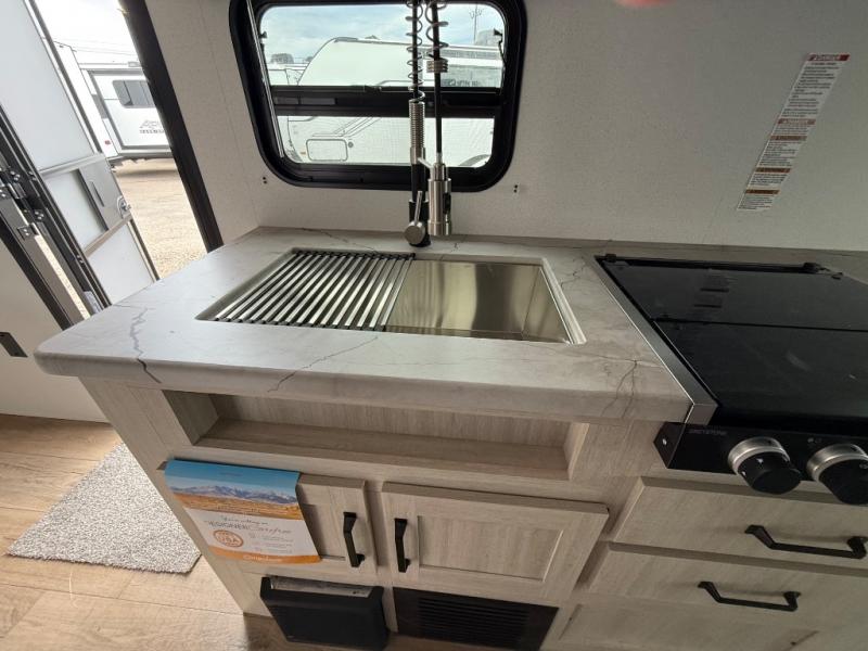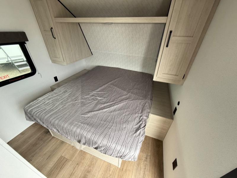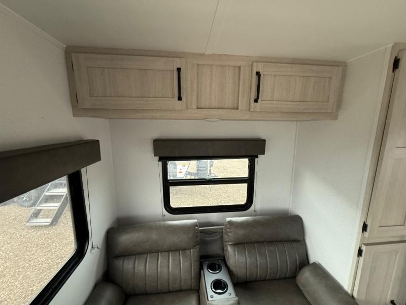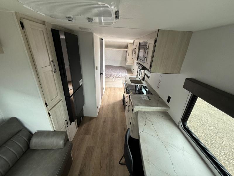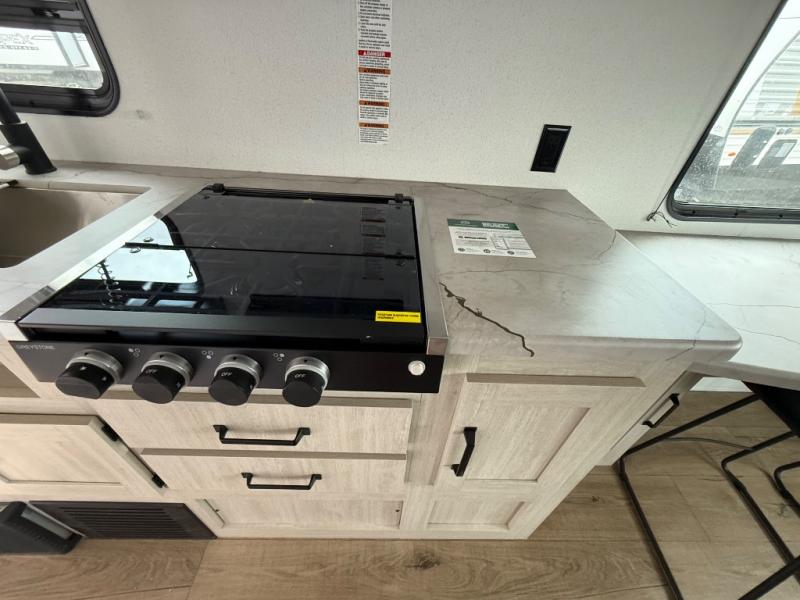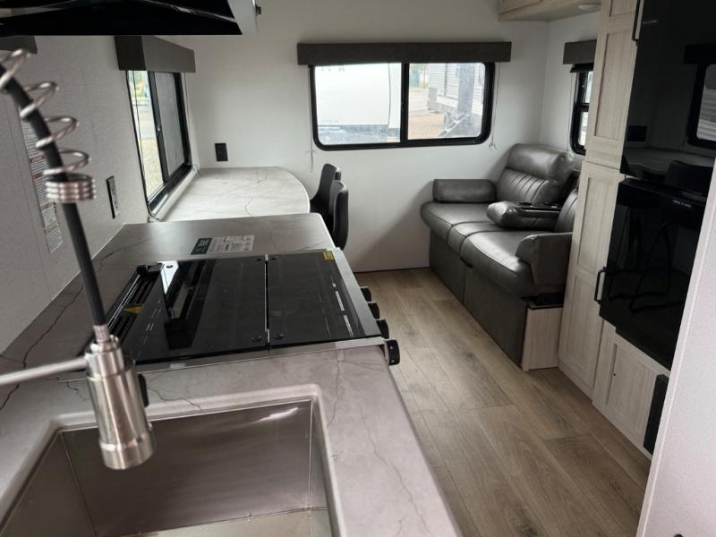 Escape the hustle and bustle of city life for weekends at the campground in this rear living travel trailer. There is a sofa to relax on across from a bar table, or you can choose the optional booth dinette if you prefer this type of dining space. Prepare all your meals on the three burner cooktop or in the stainless microwave, then keep leftovers in the 10. cu. ft. 12V refrigerator. When you're ready to get some shut-eye, the front 60" x 74" RV queen bed is sure to bring a great night's rest, and you'll find dual shirt closets to keep your clothes organized.