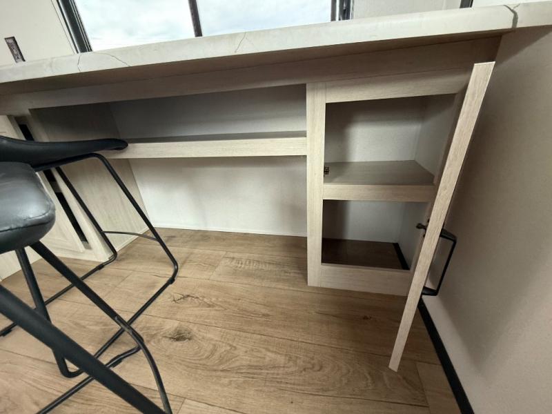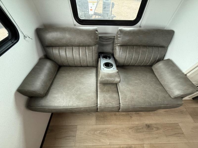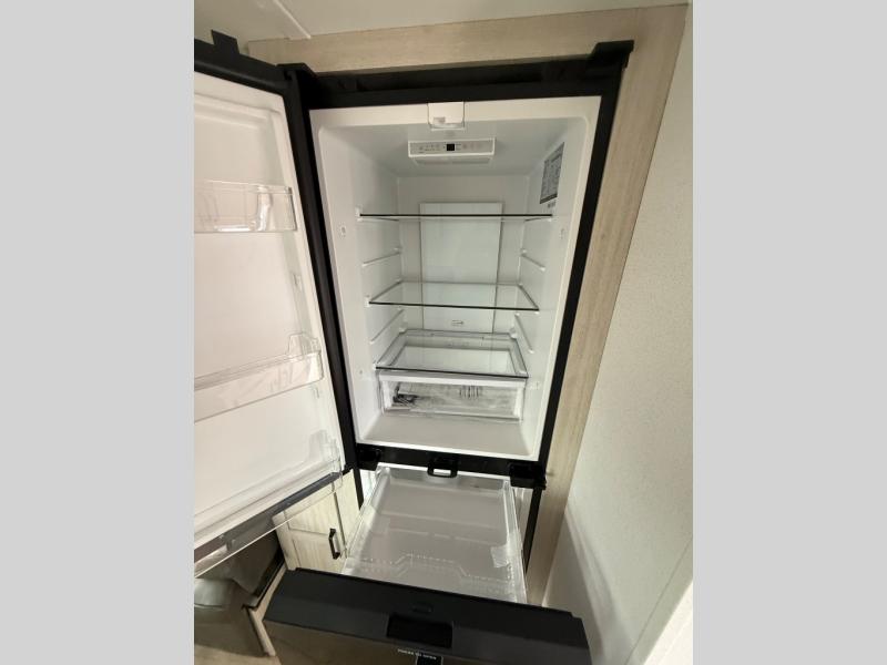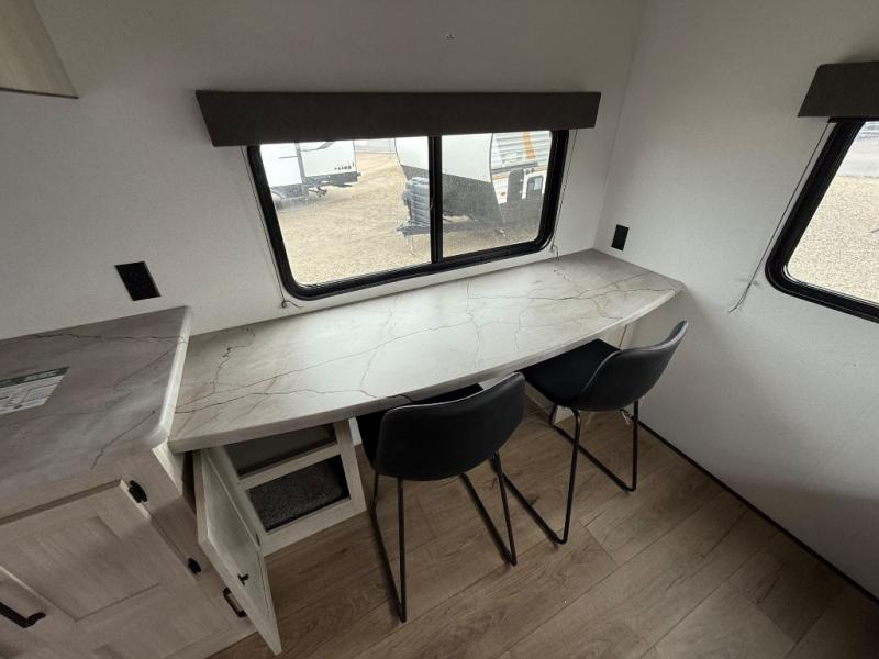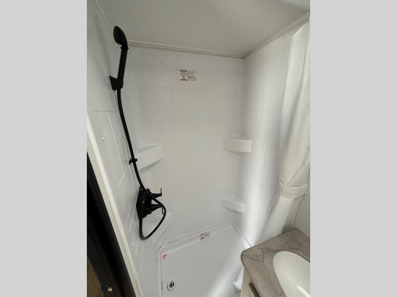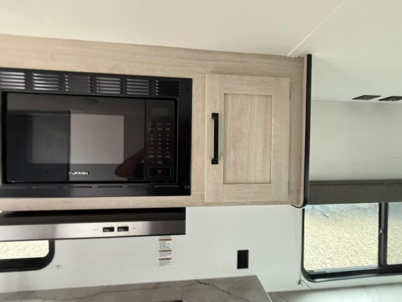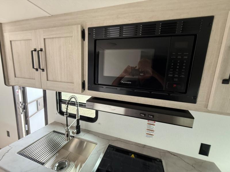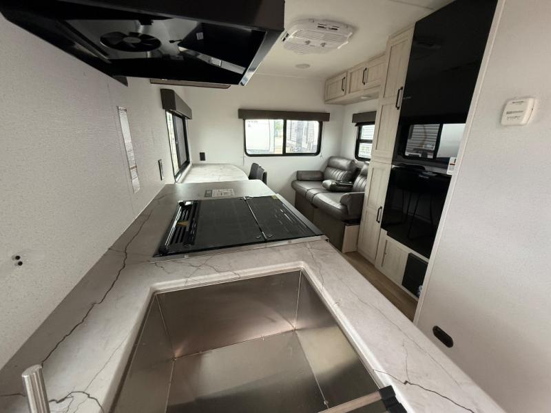 Escape the hustle and bustle of city life for weekends at the campground in this rear living travel trailer. There is a sofa to relax on across from a bar table, or you can choose the optional booth dinette if you prefer this type of dining space. Prepare all your meals on the three burner cooktop or in the stainless microwave, then keep leftovers in the 10. cu. ft. 12V refrigerator. When you're ready to get some shut-eye, the front 60" x 74" RV queen bed is sure to bring a great night's rest, and you'll find dual shirt closets to keep your clothes organized.