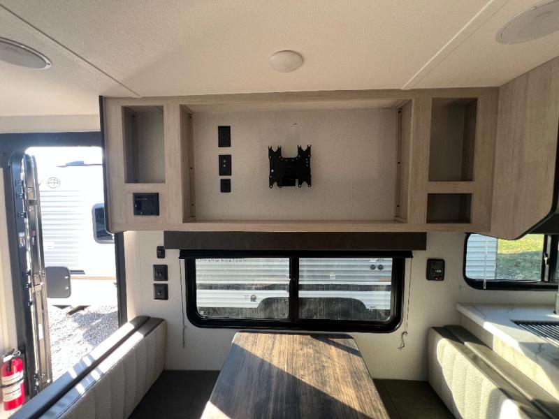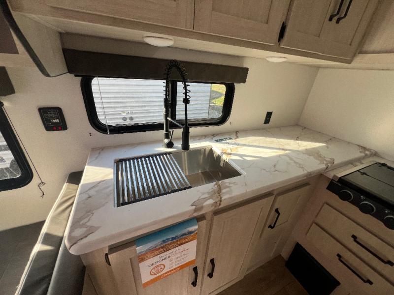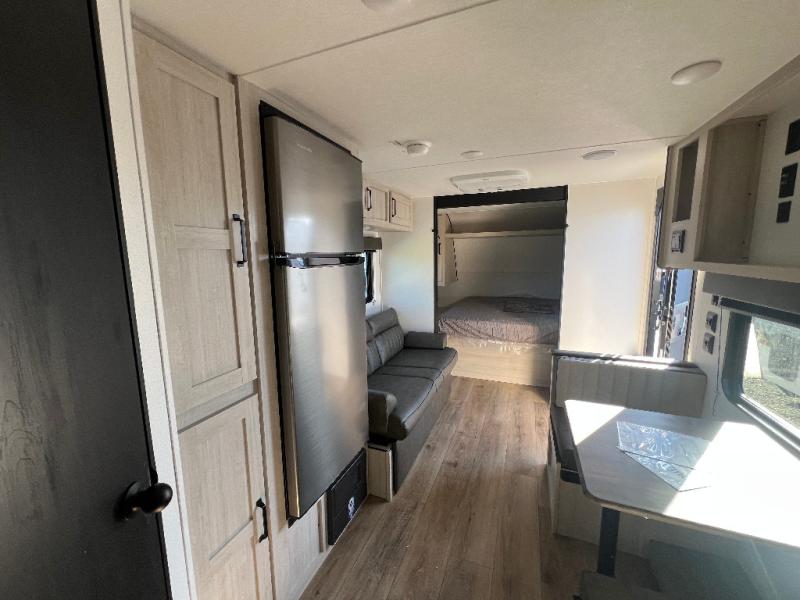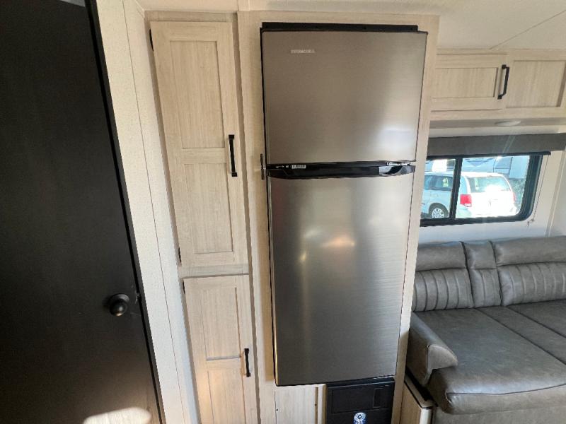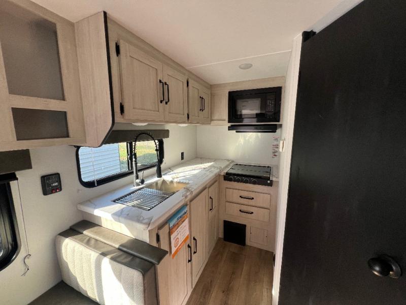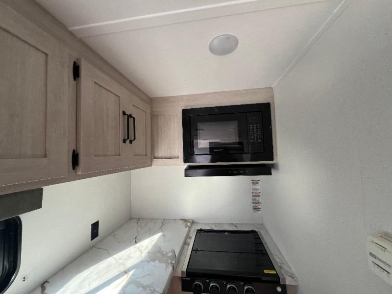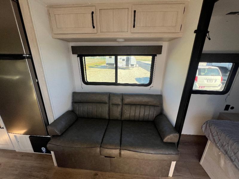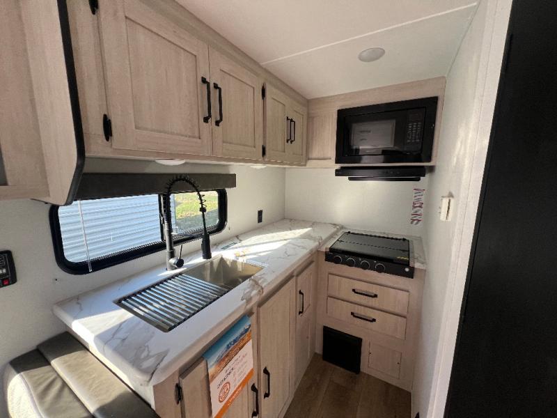 Escape the hustle and bustle of city life for weekends at the campground in this rear living travel trailer. There is a sofa to relax on across from a booth dinette, both of which will provide sleeping space for guests. Prepare all your meals on the three-burner cooktop or in the microwave in the rear corner kitchen, then keep leftovers in the 12V refrigerator. When you're ready to get some shut eye, the front 60" x 74" RV queen bed is sure to bring a great night's rest, and you'll find dual shirt closets to keep your clothes organized. This unit also includes outside storage plus an optional micro kitchen with a refrigerator and grill!