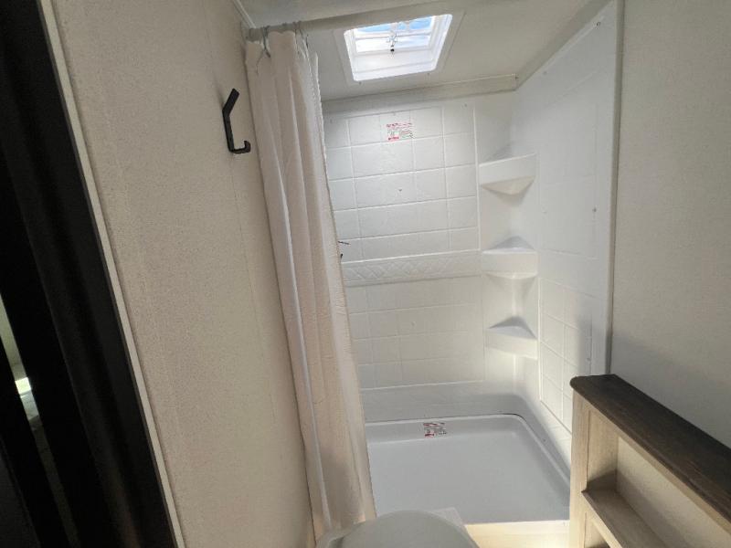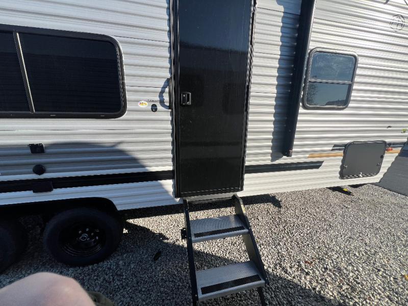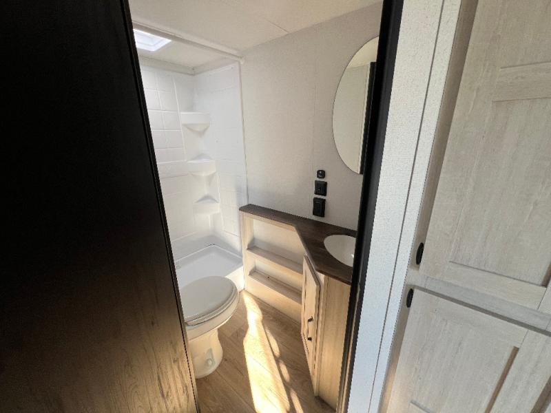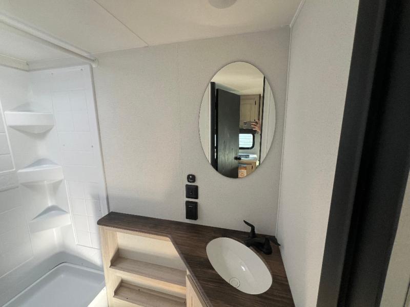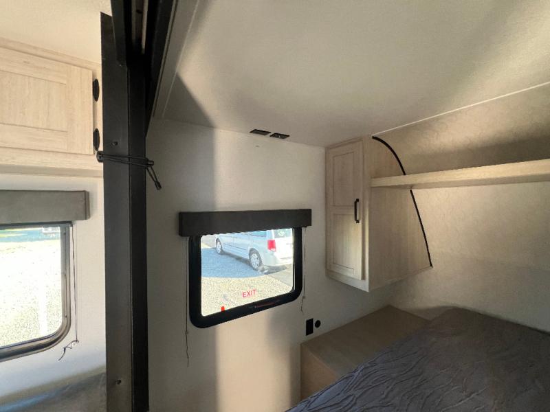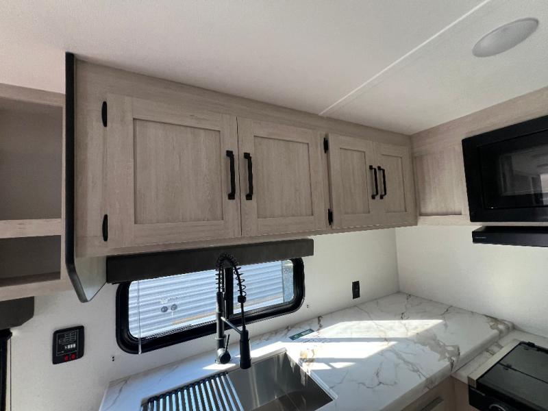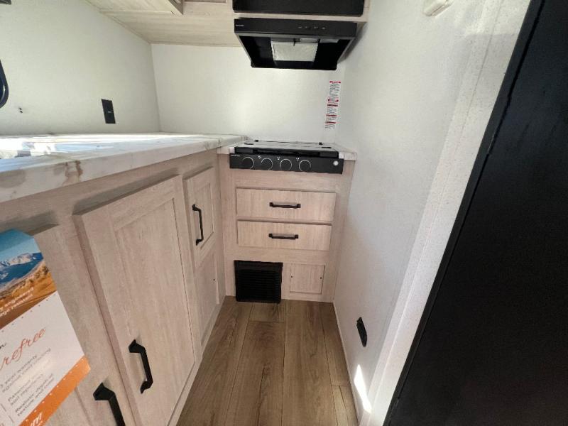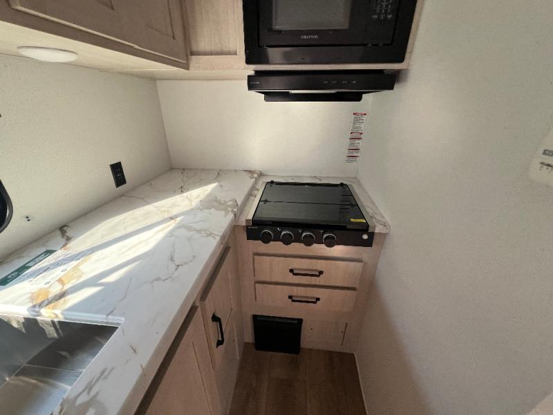 Escape the hustle and bustle of city life for weekends at the campground in this rear living travel trailer. There is a sofa to relax on across from a booth dinette, both of which will provide sleeping space for guests. Prepare all your meals on the three-burner cooktop or in the microwave in the rear corner kitchen, then keep leftovers in the 12V refrigerator. When you're ready to get some shut eye, the front 60" x 74" RV queen bed is sure to bring a great night's rest, and you'll find dual shirt closets to keep your clothes organized. This unit also includes outside storage plus an optional micro kitchen with a refrigerator and grill!