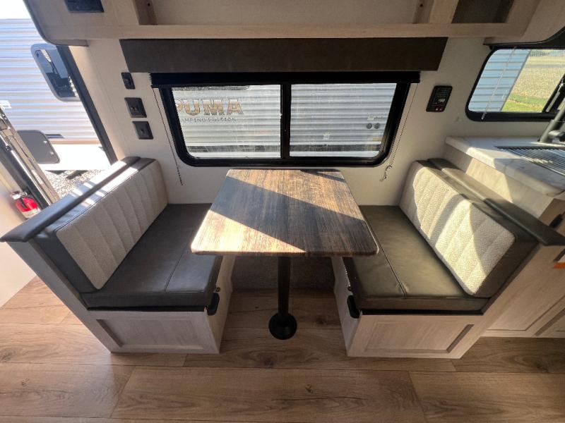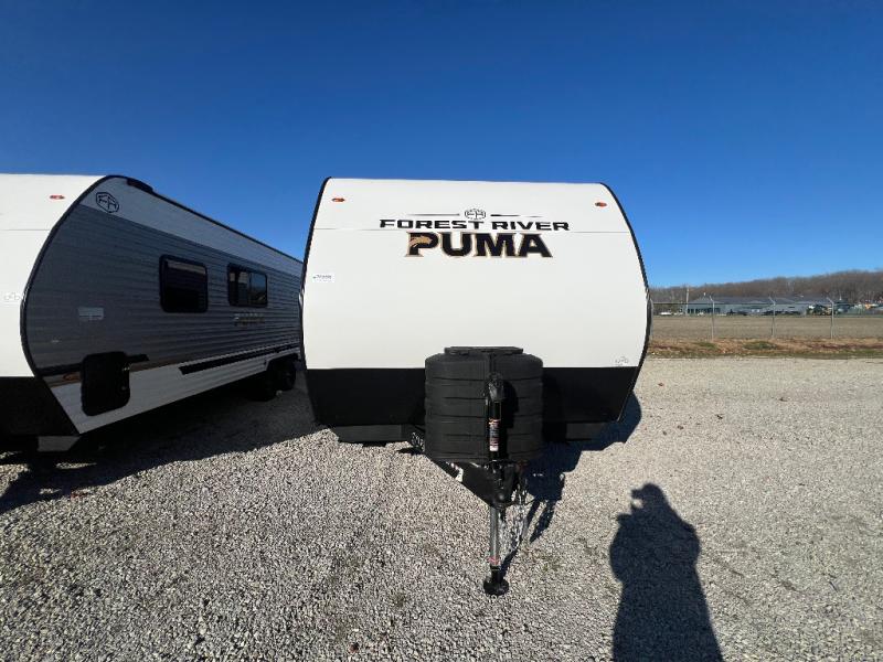 The Puma Camping Edition by Forest River offer an affordable travel trailer for rookie campers or seasoned RVers! They are built with 5/8" tongue and groove plywood flooring and a front diamond plate for added protection. There are also exterior magnetic baggage door latches, back up camera prep, a battery disconnect. Head inside to find Thermofoil countertops with a smooth drop edge, bedroom USB ports and outlets, and pleated shades in the living room.