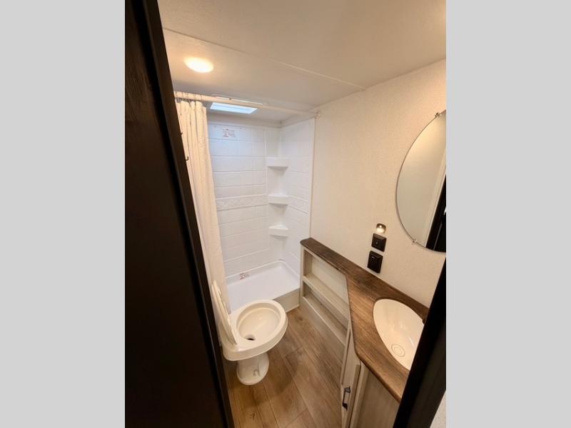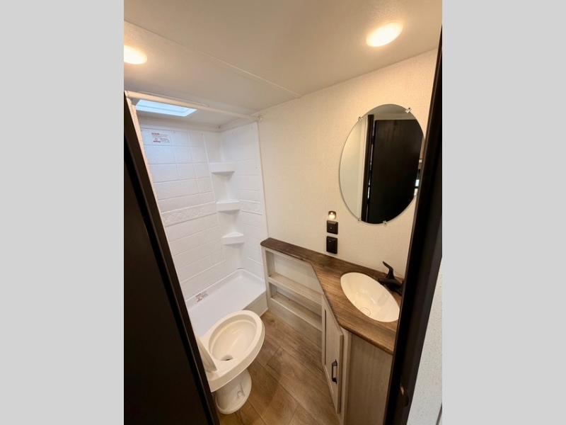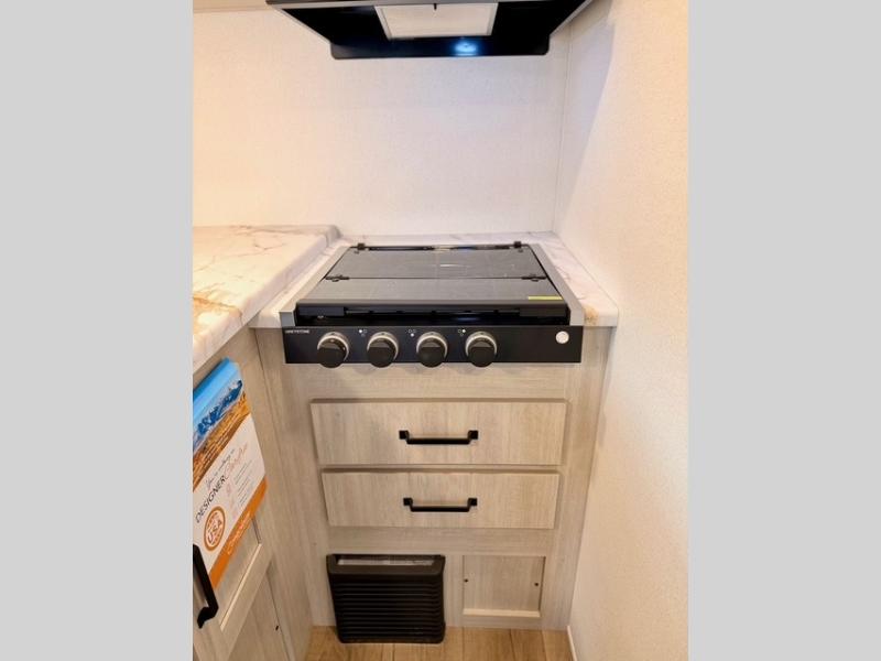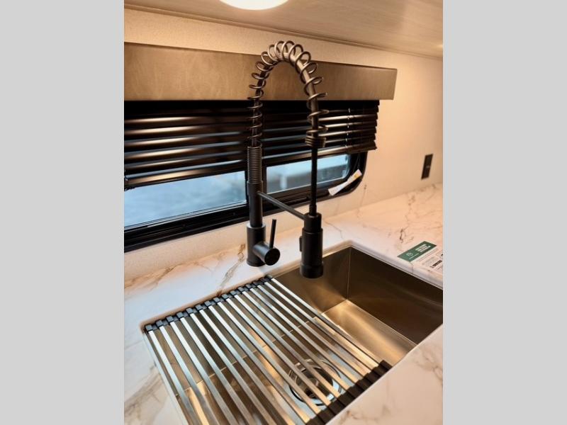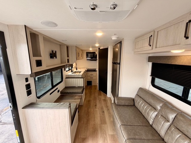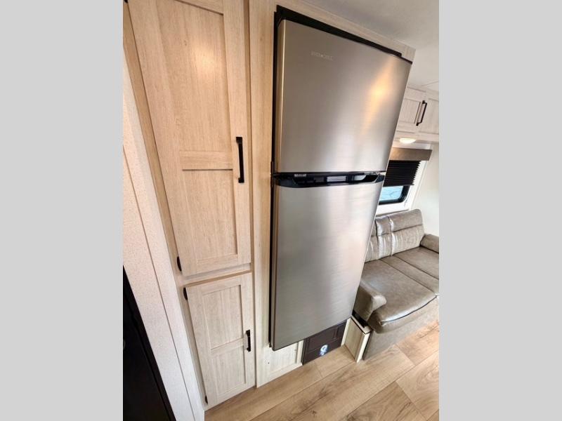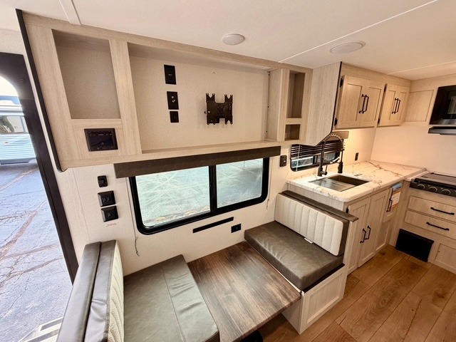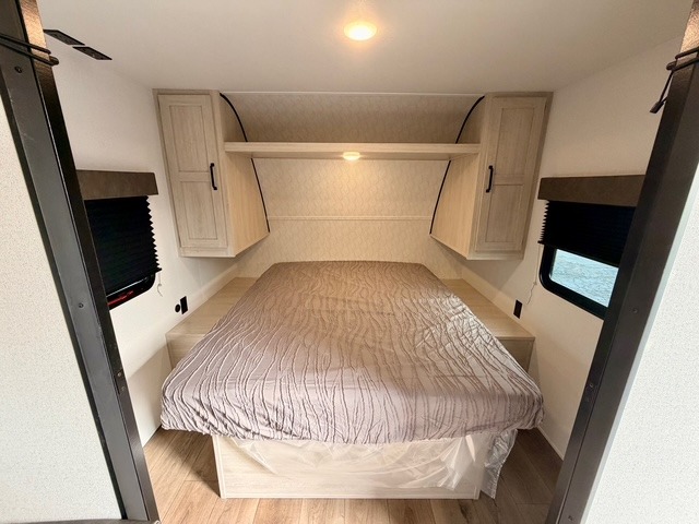 The rear corner kitchen maximizes every inch of counter space, coming fully equipped with a three-burner cooktop, microwave, and a modern 12V refrigerator to keep your supplies fresh. When you're ready to recharge, the front private bedroom offers a quiet retreat with a residential-sized queen bed and dual shirt closets to keep your travel wardrobe organized. For those who love "al fresco" dining, the optional micro kitchen adds a secondary refrigerator and grill to your exterior setup, perfect for lakeside cookouts.