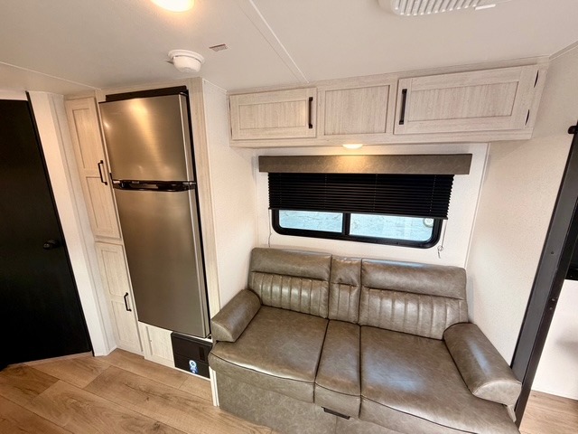 Escape the hustle and bustle of city life for a relaxing weekend at the campground in this expertly laid-out rear living travel trailer. The floorplan is designed for socializing, featuring a plush sofa positioned directly across from a booth dinette, creating an open and inviting central hub. Both seating areas easily convert into additional sleeping berths, making it simple to host friends or family.