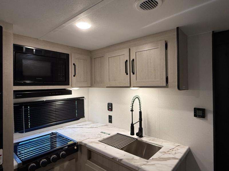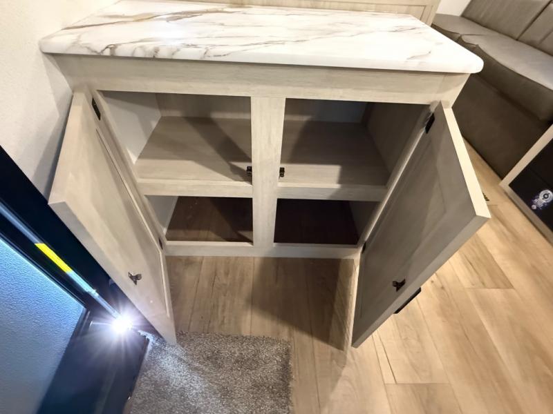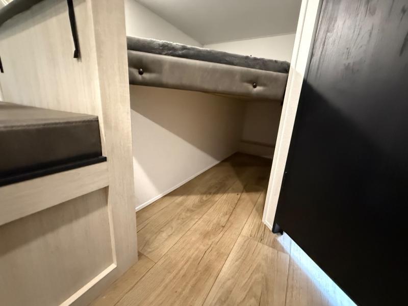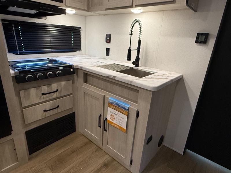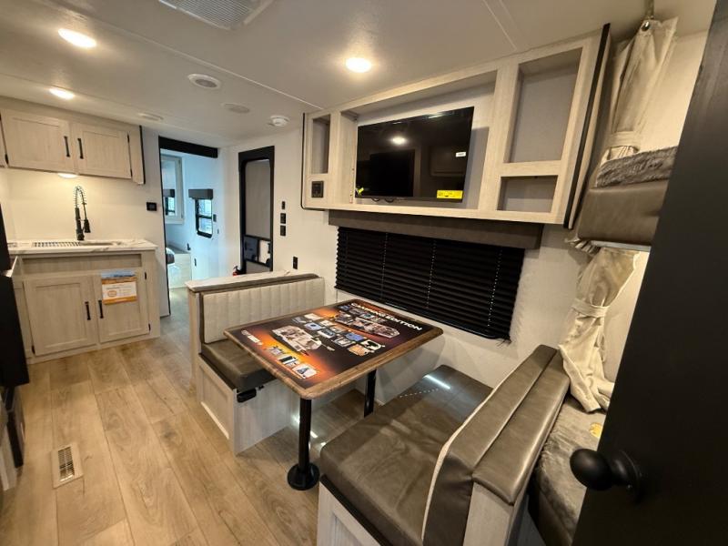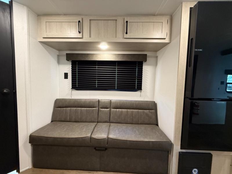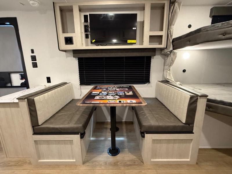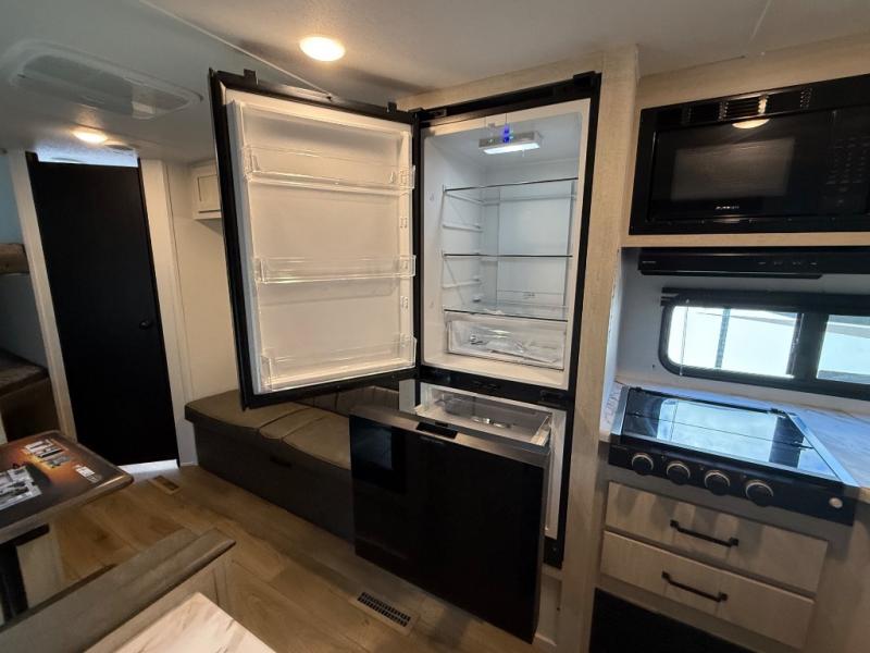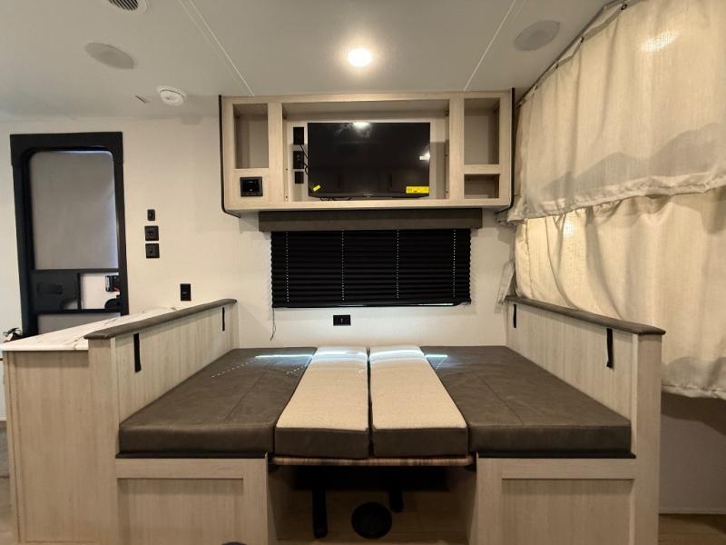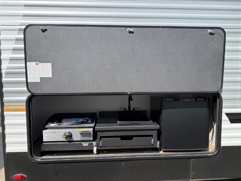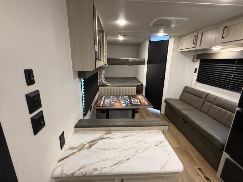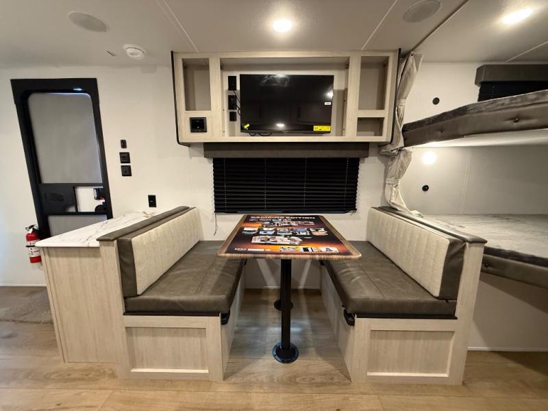 If you're looking for more sleeping space, this double axle unit features double-size bunks, an RV queen bed in the front bedroom, plus a sofa and booth dinette in the combined kitchen and living area. The full kitchen includes a microwave and three burner cooktop to make meals, plus a pantry and 12V refrigerator for food storage. And an optional outside mini kitchen with a griddle can be added if you enjoy cooking outdoors!