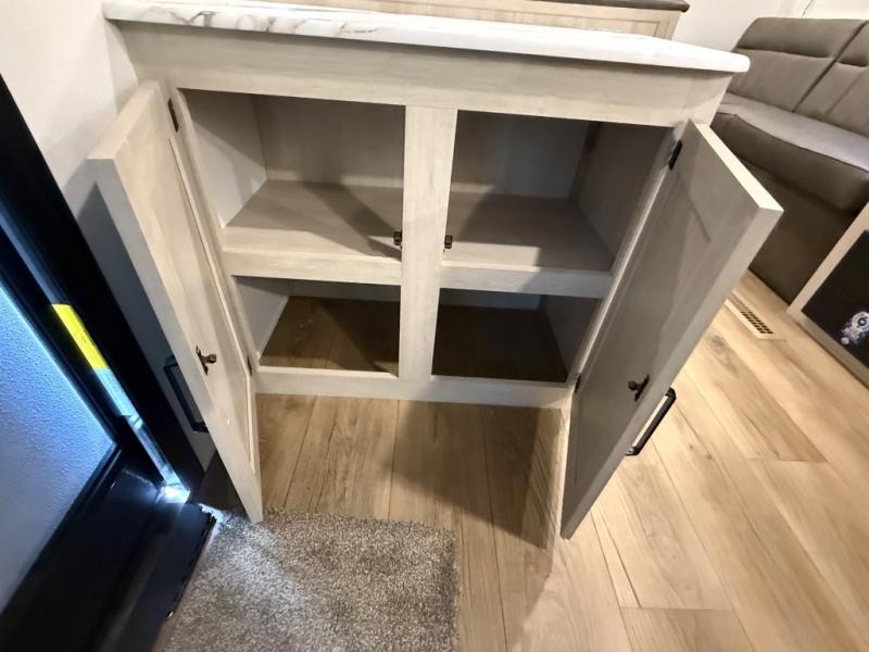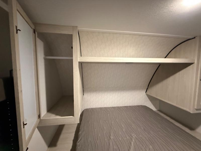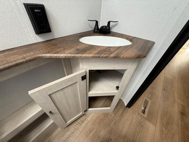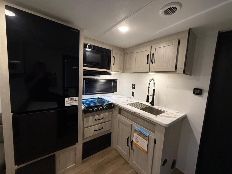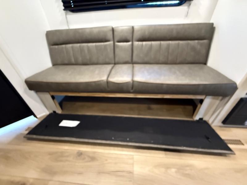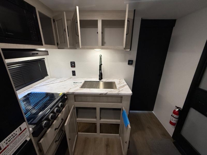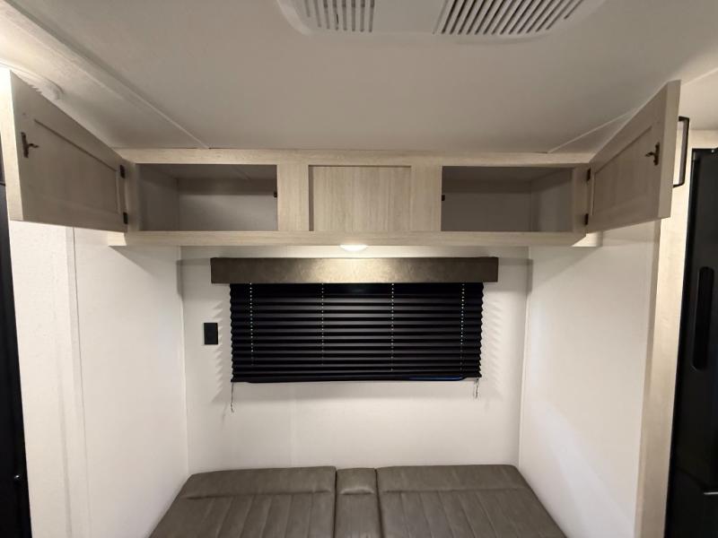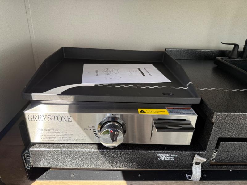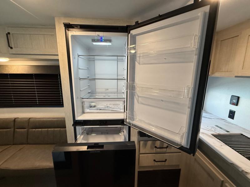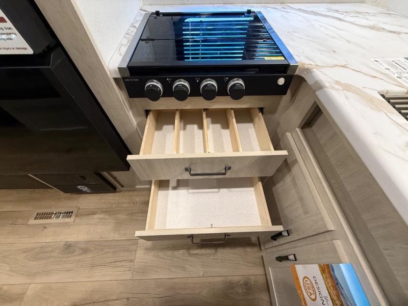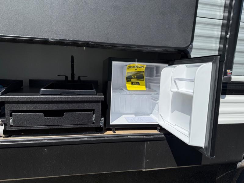 If you're looking for more sleeping space, this double axle unit features double-size bunks, an RV queen bed in the front bedroom, plus a sofa and booth dinette in the combined kitchen and living area. The full kitchen includes a microwave and three burner cooktop to make meals, plus a pantry and 12V refrigerator for food storage. And an optional outside mini kitchen with a griddle can be added if you enjoy cooking outdoors!