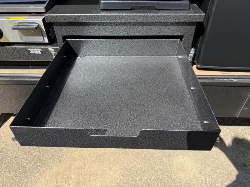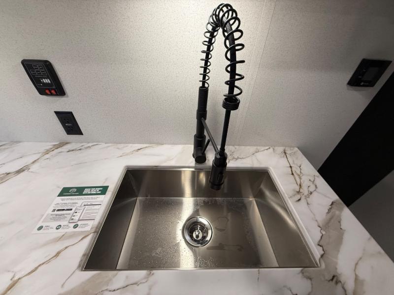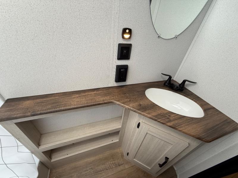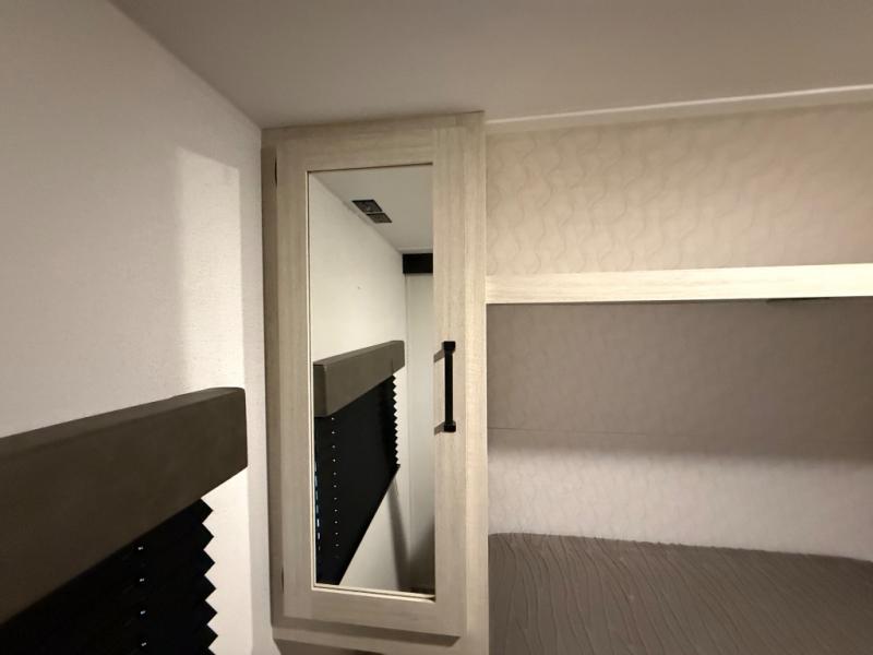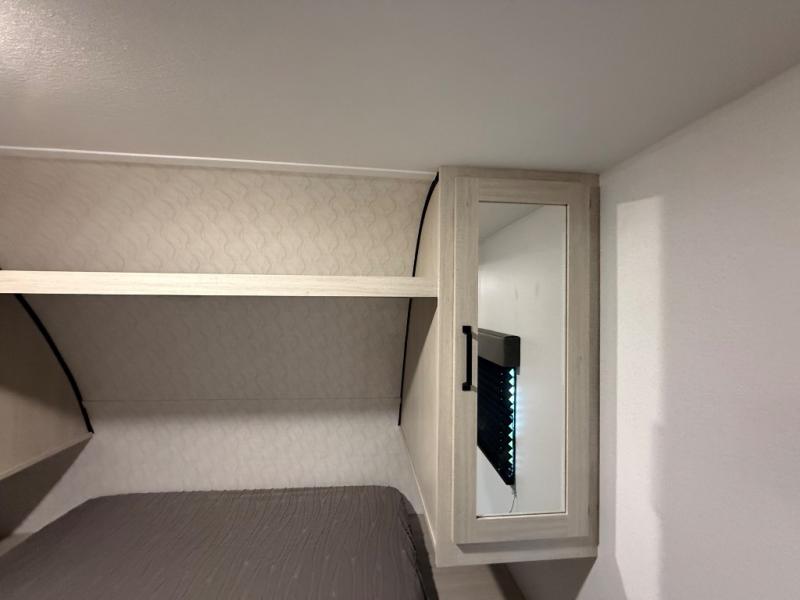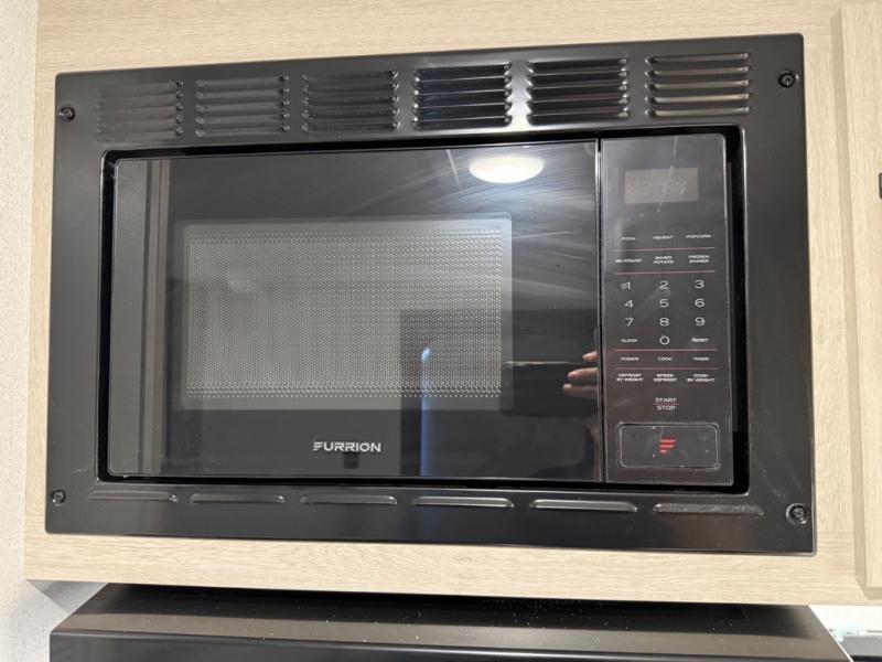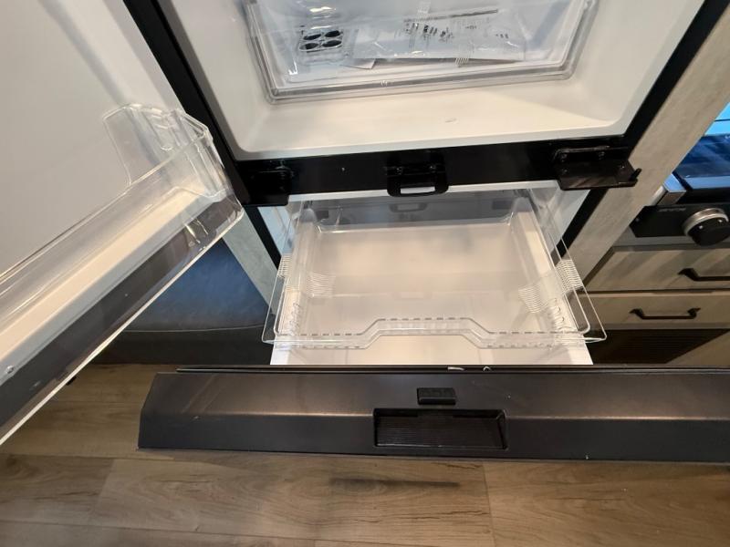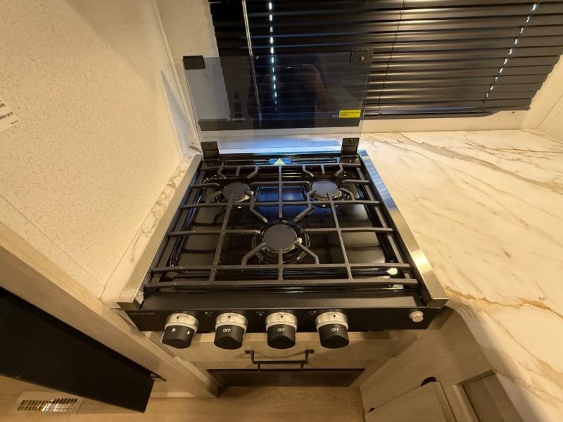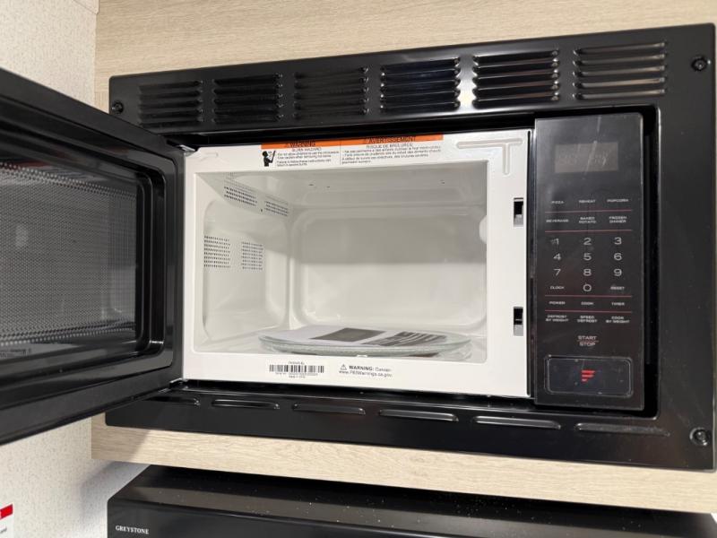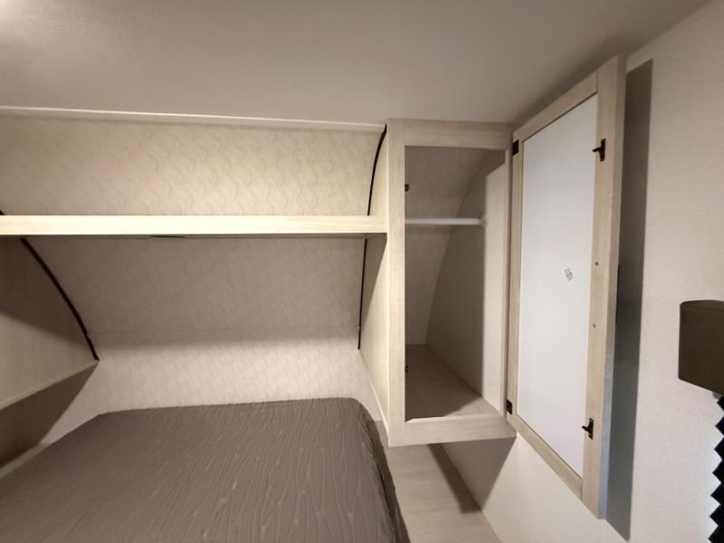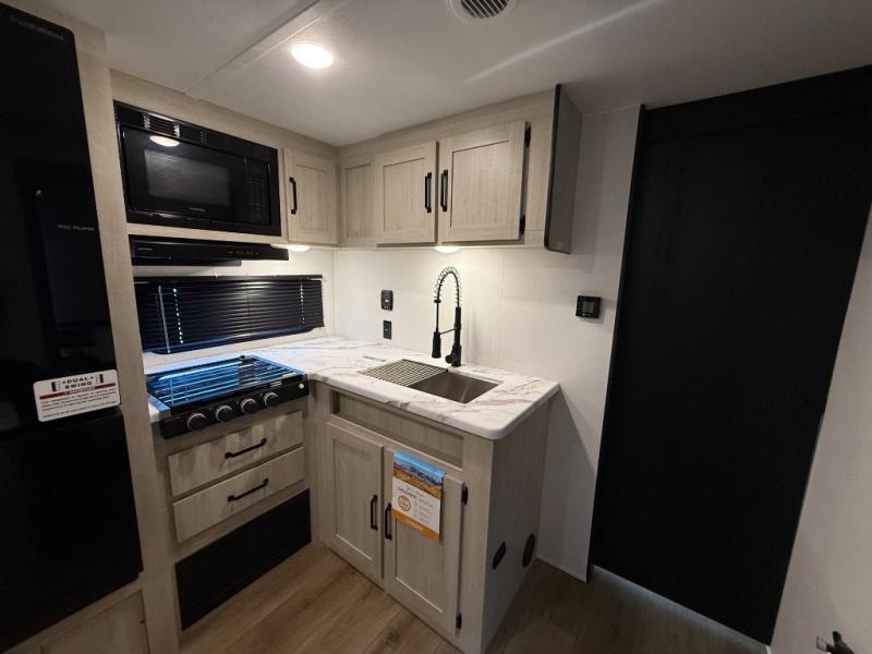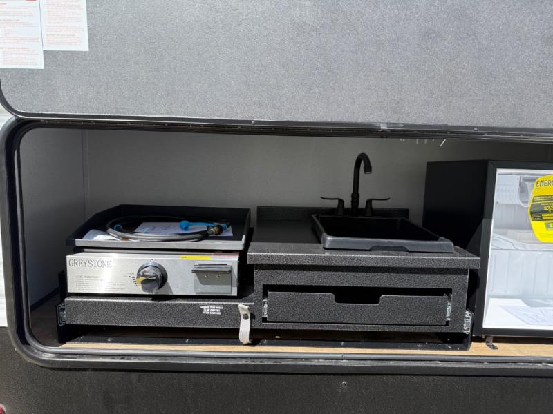 If you're looking for more sleeping space, this double axle unit features double-size bunks, an RV queen bed in the front bedroom, plus a sofa and booth dinette in the combined kitchen and living area. The full kitchen includes a microwave and three burner cooktop to make meals, plus a pantry and 12V refrigerator for food storage. And an optional outside mini kitchen with a griddle can be added if you enjoy cooking outdoors!