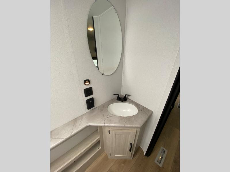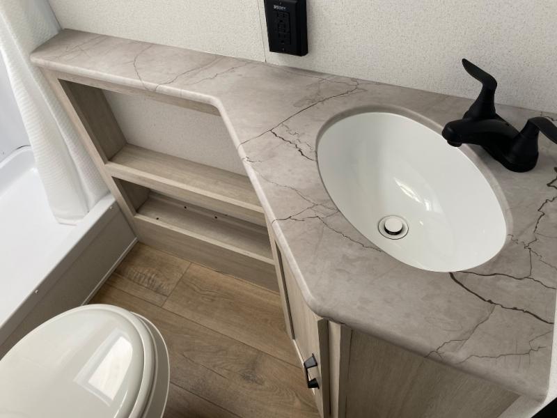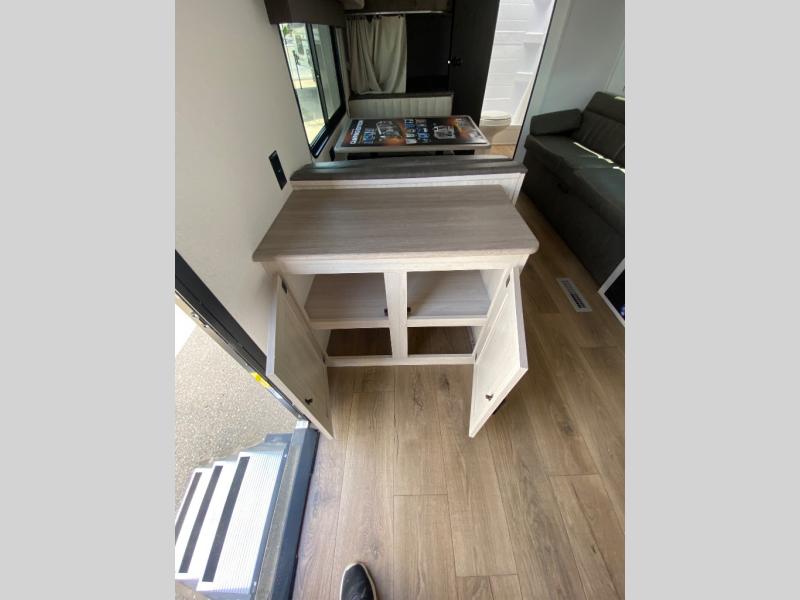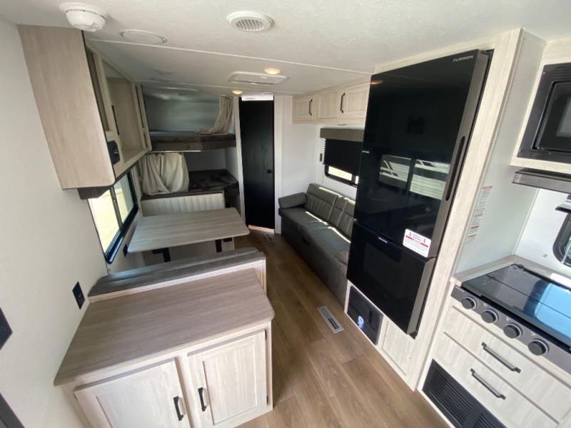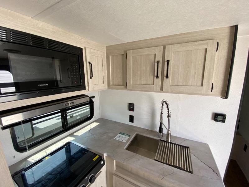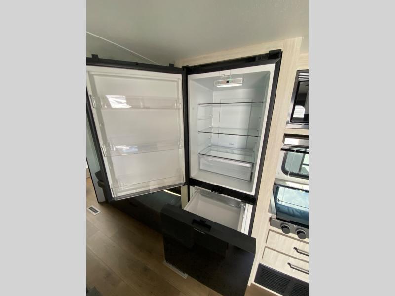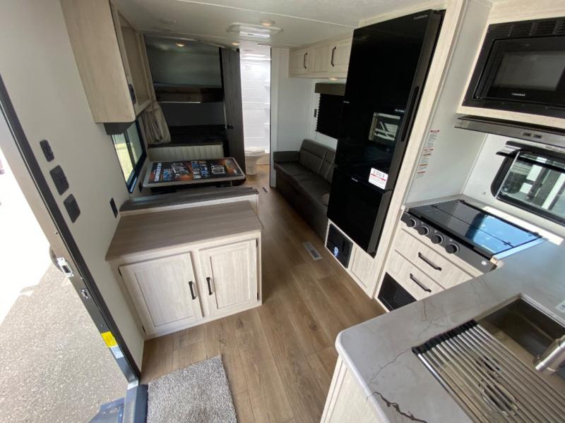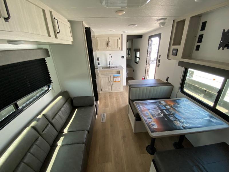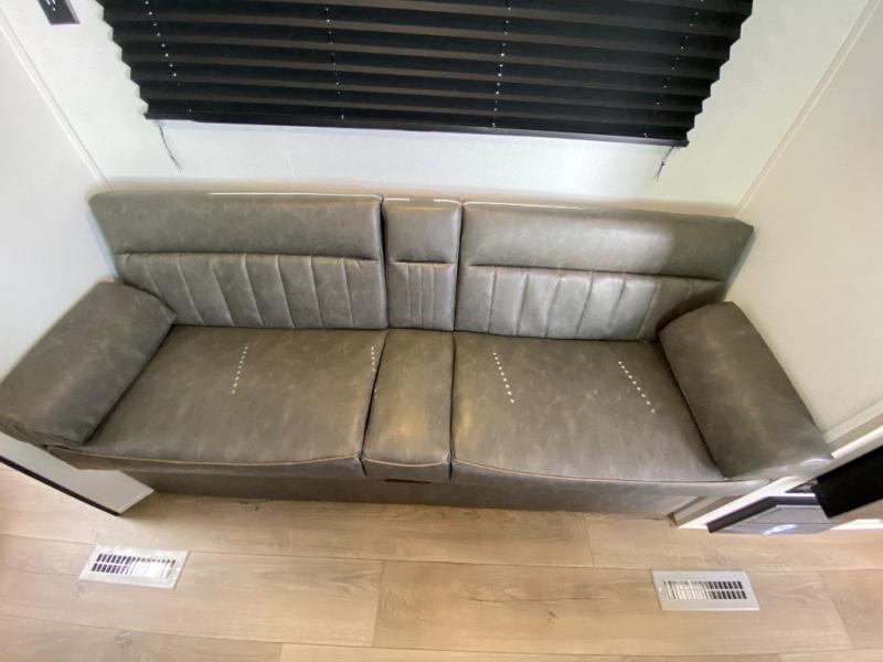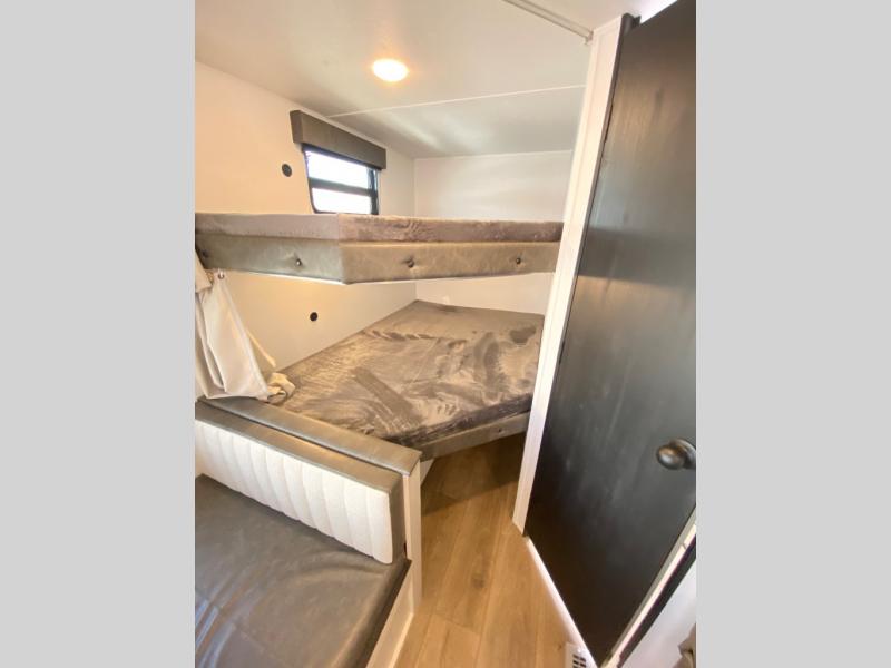 If you're looking for more sleeping space, this double axle unit features double-size bunks, an RV queen bed in the front bedroom, plus a sofa and booth dinette in the combined kitchen and living area. The full kitchen includes a stainless microwave and three burner cooktop to make meals, plus a pantry and 12V refrigerator for food storage. And an optional outside mini kitchen with a griddle can be added if you enjoy cooking outdoors!