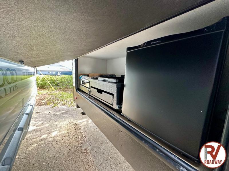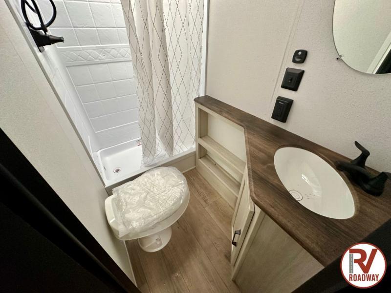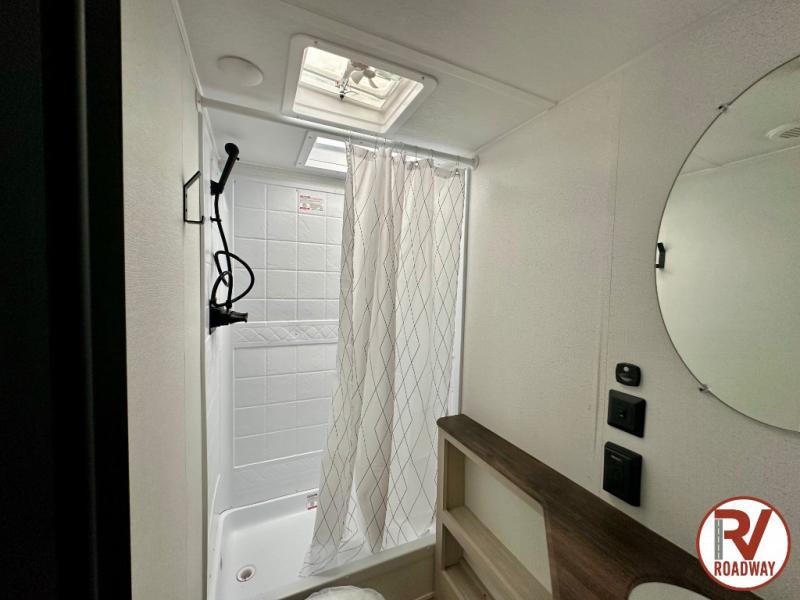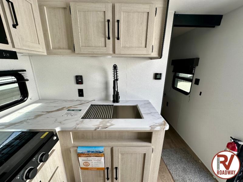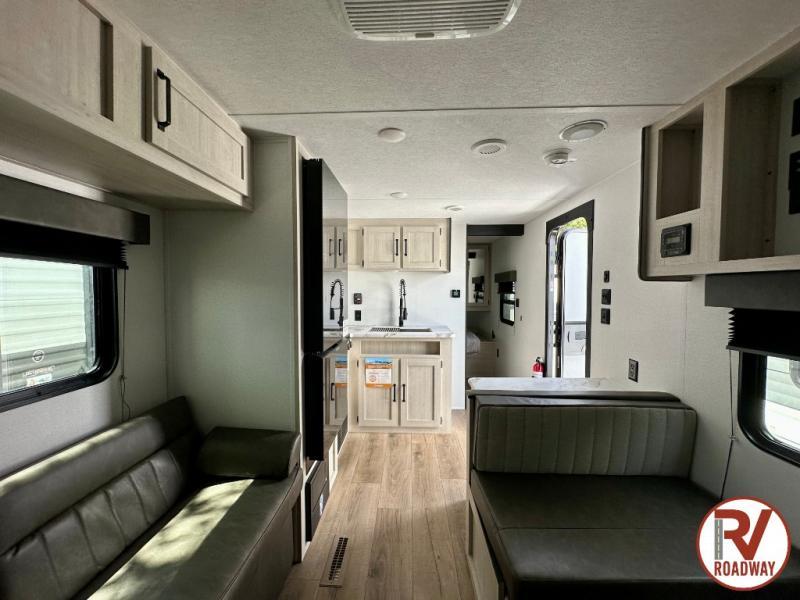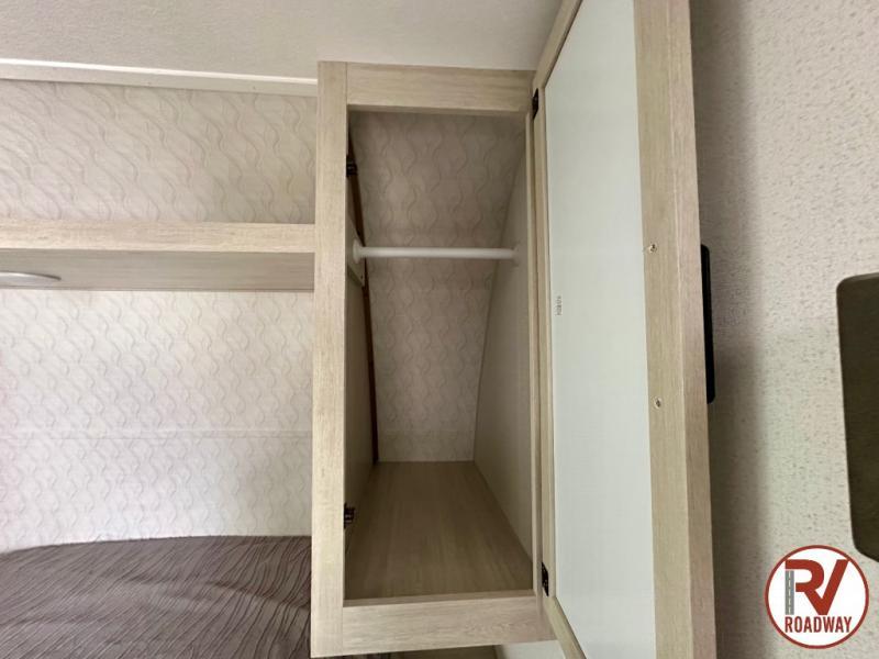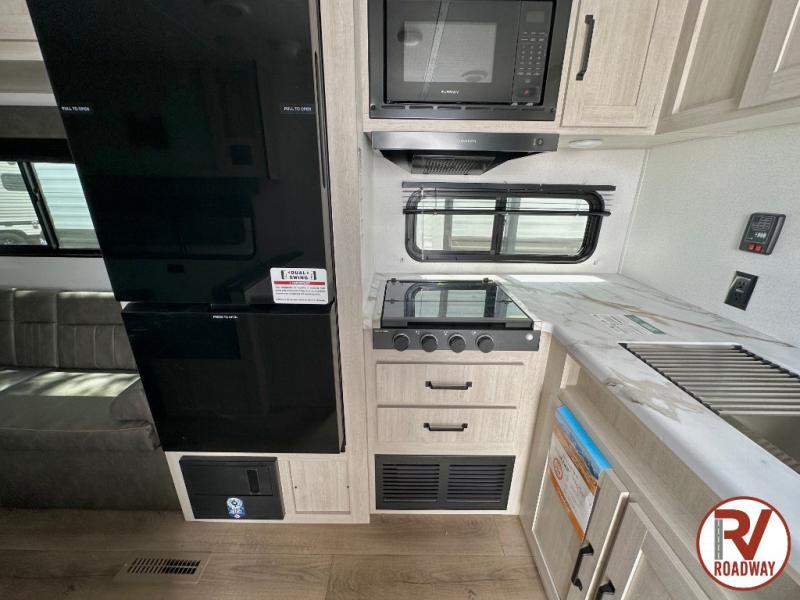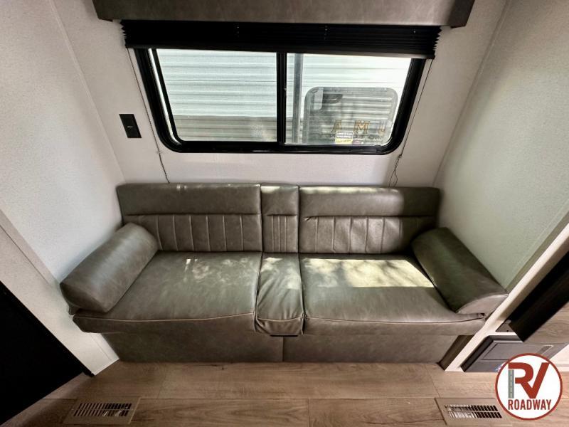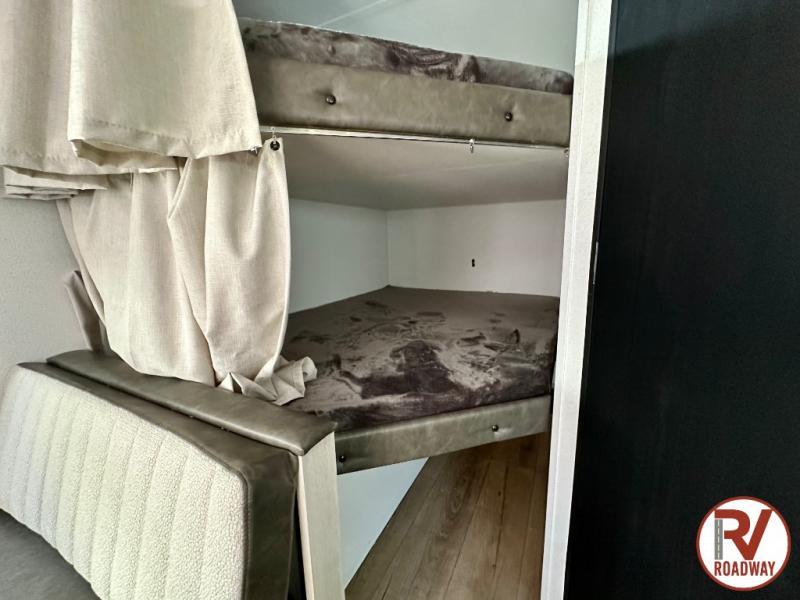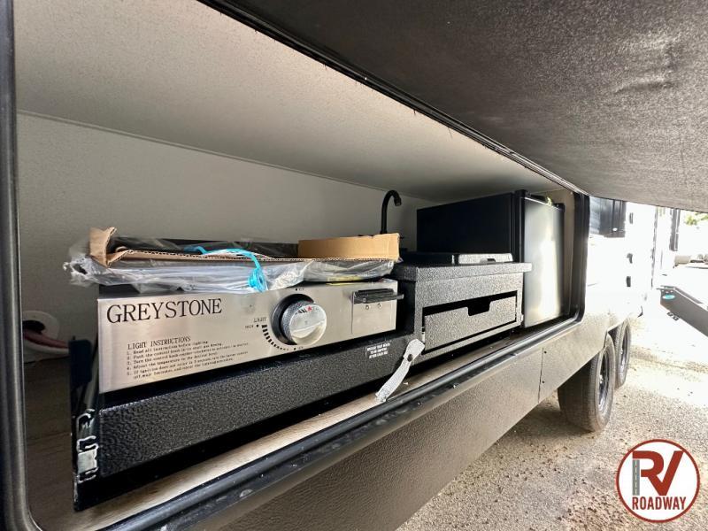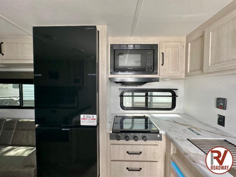 If you're looking for more sleeping space, this double axle unit features double-size bunks, an RV queen bed in the front bedroom, plus a sofa and booth dinette in the combined kitchen and living area. The full kitchen includes a stainless microwave and three burner cooktop to make meals, plus a pantry and 12V refrigerator for food storage. And an optional outside mini kitchen with a griddle can be added if you enjoy cooking outdoors!