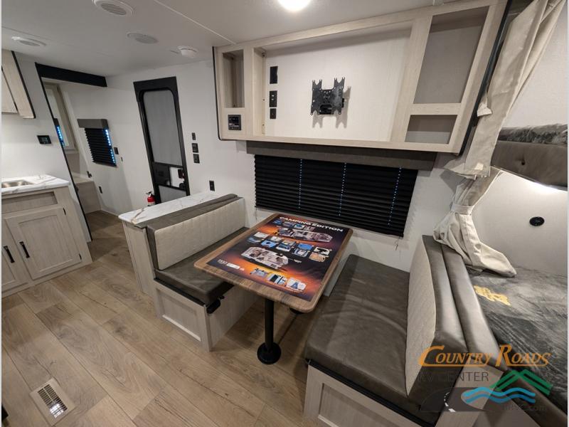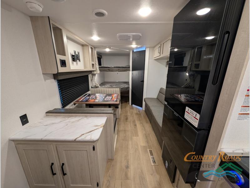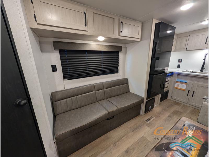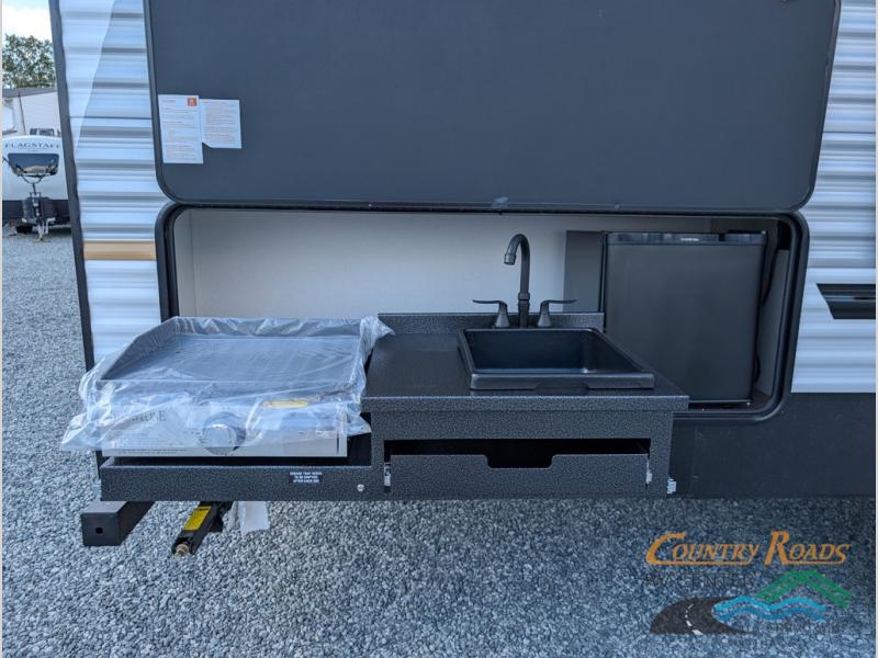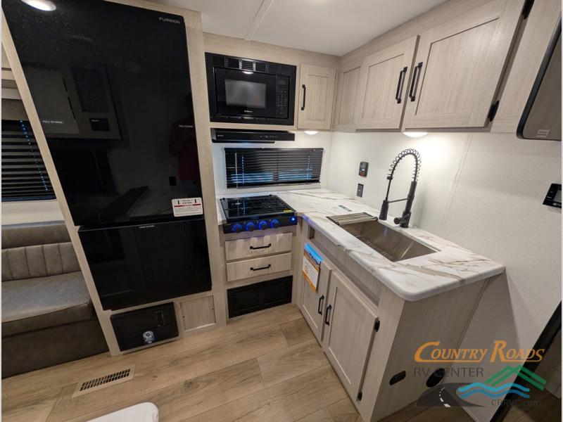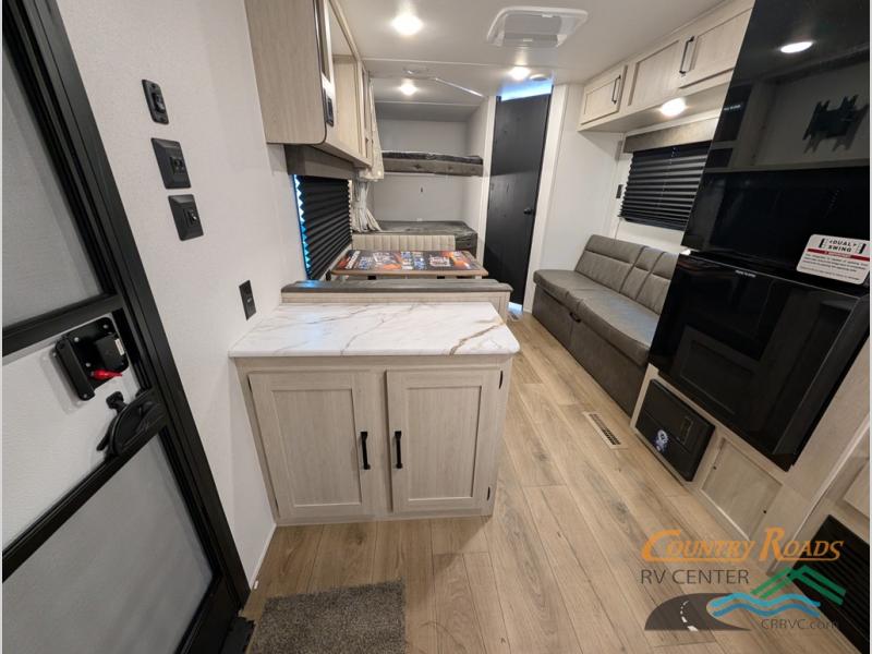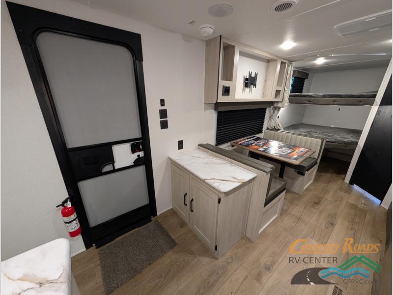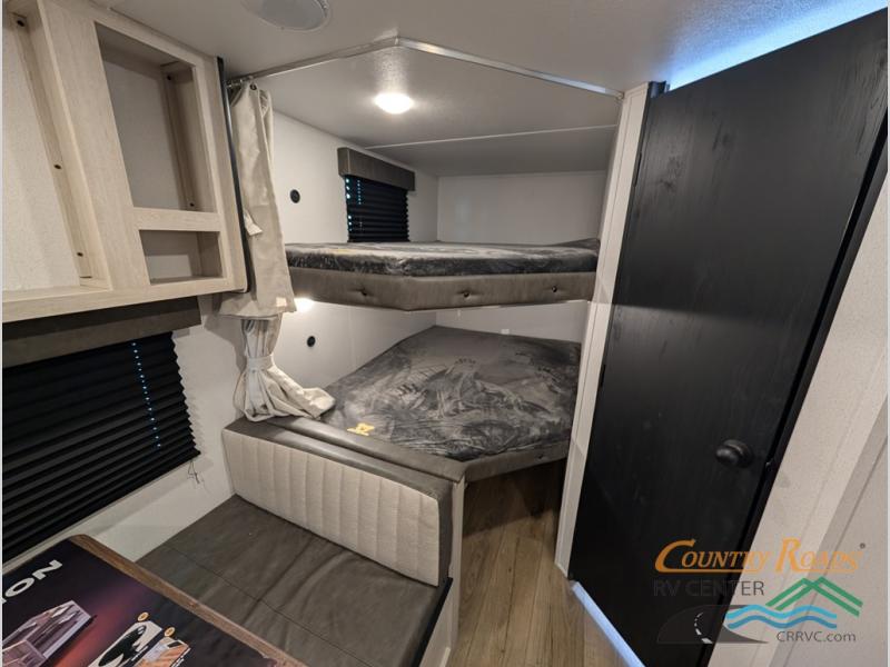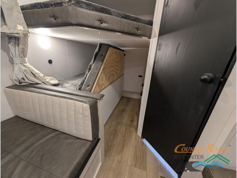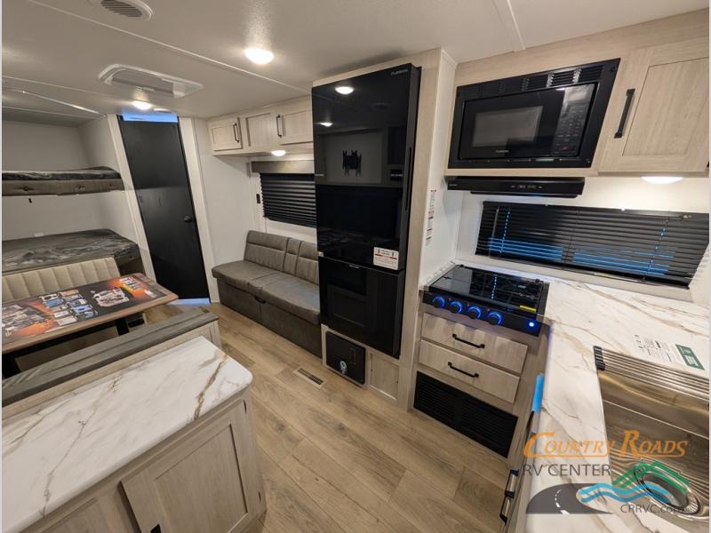 If you're looking for more sleeping space, this double axle unit features double-size bunks, an RV queen bed in the front bedroom, plus a sofa and booth dinette in the combined kitchen and living area. The full kitchen includes a stainless microwave and three burner cooktop to make meals, plus a pantry and 12V refrigerator for food storage. And an optional outside mini kitchen with a griddle can be added if you enjoy cooking outdoors!