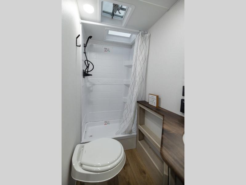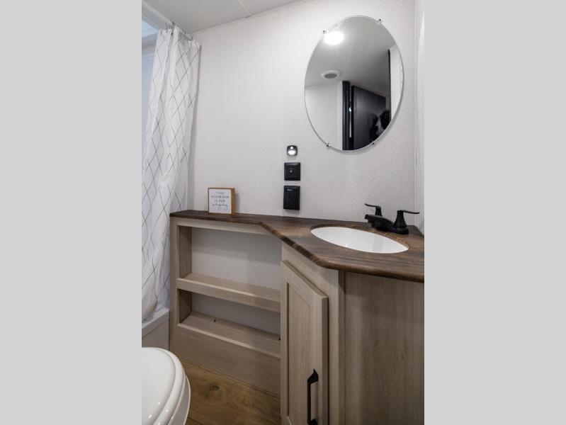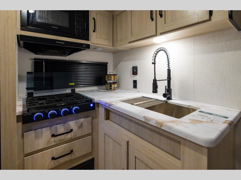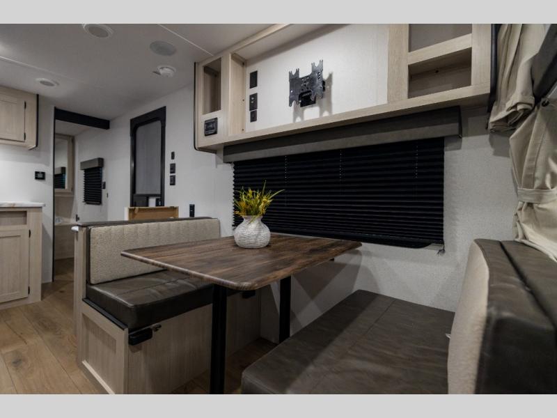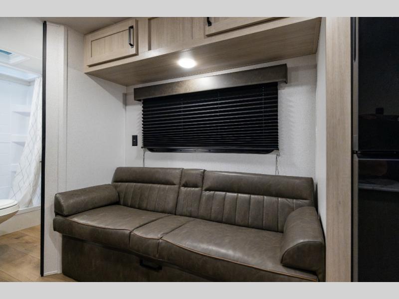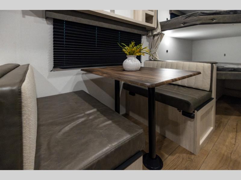 If you're looking for more sleeping space, this double axle unit features double-size bunks, an RV queen bed in the front bedroom, plus a sofa and booth dinette in the combined kitchen and living area. The full kitchen includes a microwave and three burner cooktop to make meals, plus a pantry and 12V refrigerator for food storage. And an optional outside mini kitchen with a griddle can be added if you enjoy cooking outdoors!