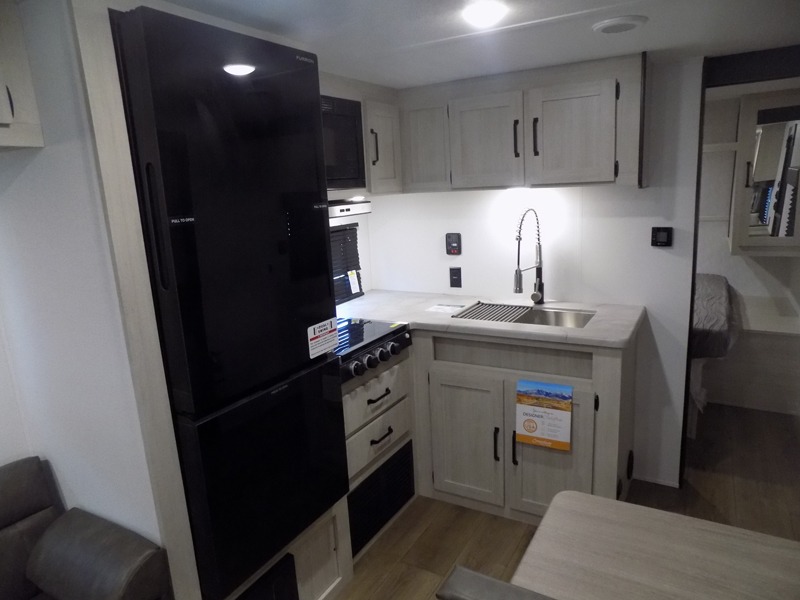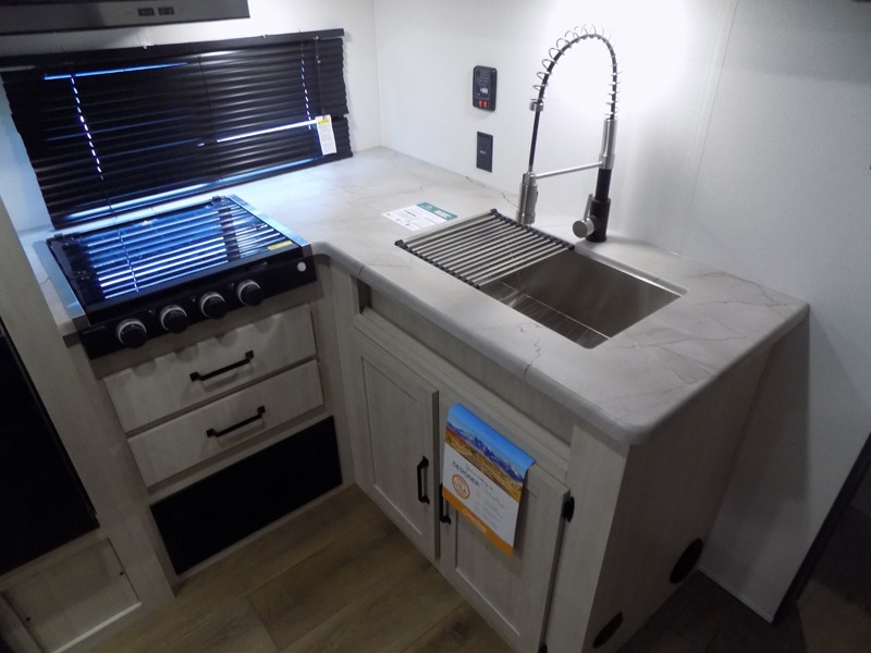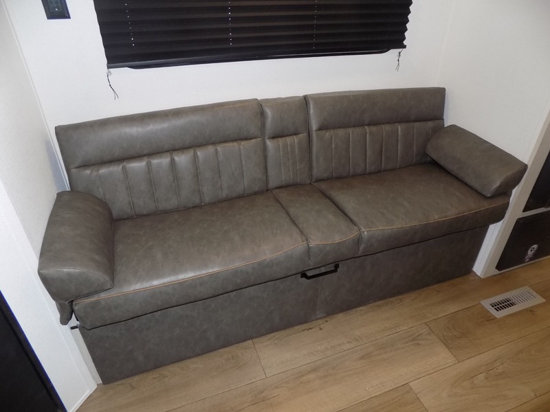 If you're looking for more sleeping space, this double axle unit features double-size bunks, an RV queen bed in the front bedroom, plus a sofa and booth dinette in the combined kitchen and living area. The full kitchen includes a stainless microwave and three burner cooktop to make meals, plus a pantry and 12V refrigerator for food storage. And an optional outside mini kitchen with a griddle can be added if you enjoy cooking outdoors!