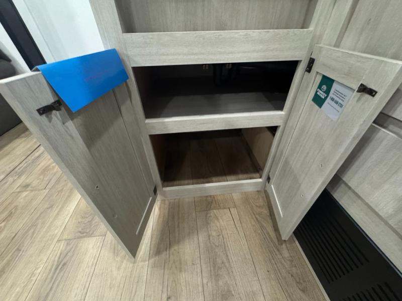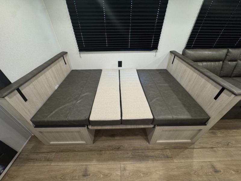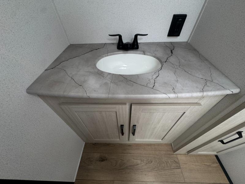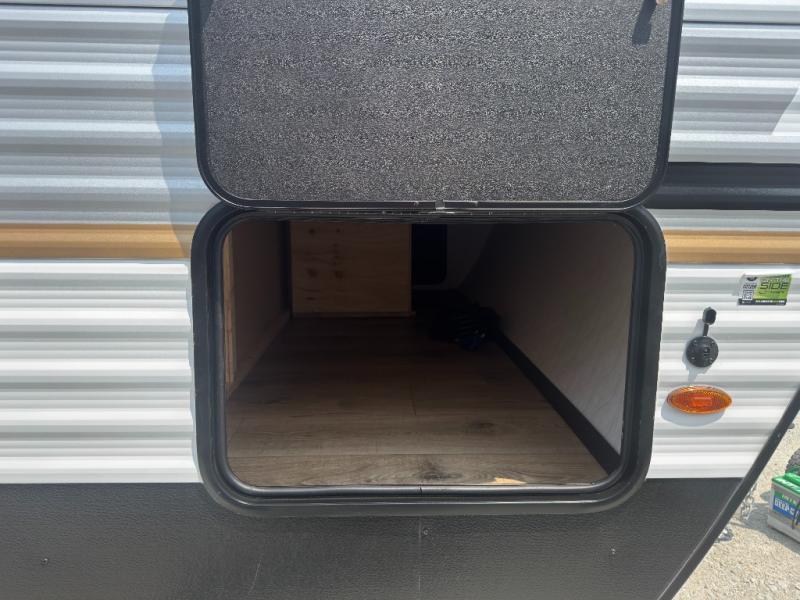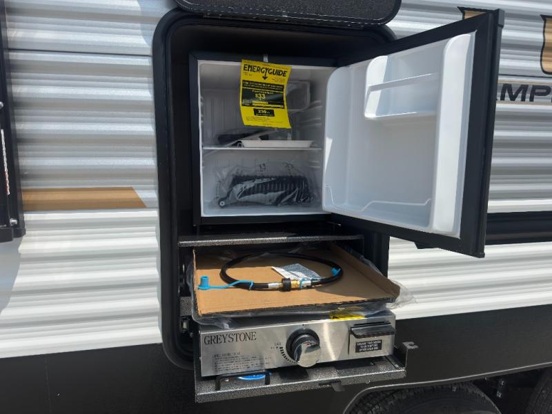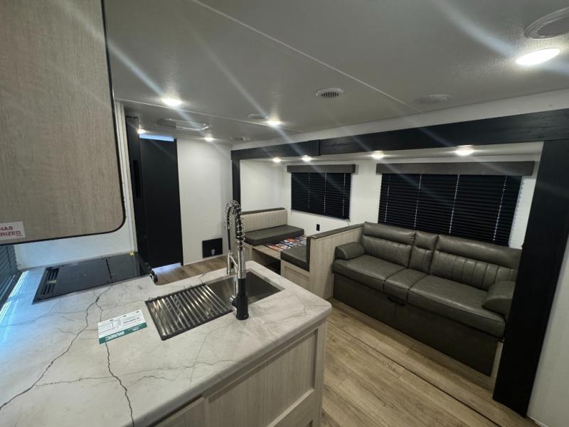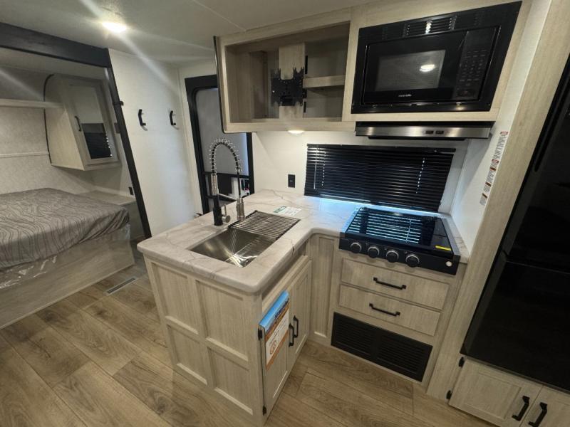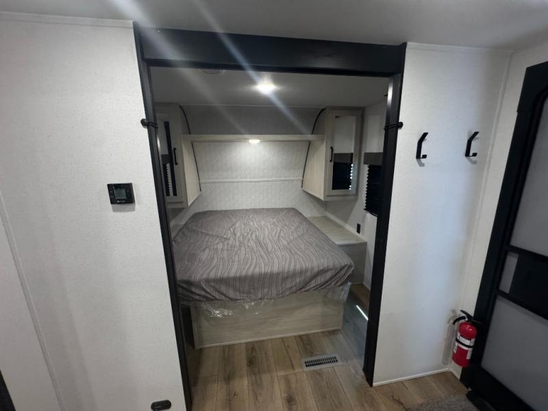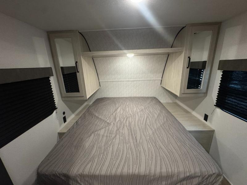 Wherever you decide to camp, you can be sure to have a great time in this rear bath travel trailer! The combined kitchen and living area is made spacious thanks to the large slide out. Here, you can relax on the sofa and dine at the booth dinette, and an optional TV can be added if you want the option for movie night. The full kitchen will allow you to make meals each day, and you can choose to add the optional outside mini kitchen with a griddle if you want to cook with fresh air. This unit also includes a front private bedroom, complete with an RV queen bed, an overhead shelf and dual shirt closets to keep clothes wrinkle-free.