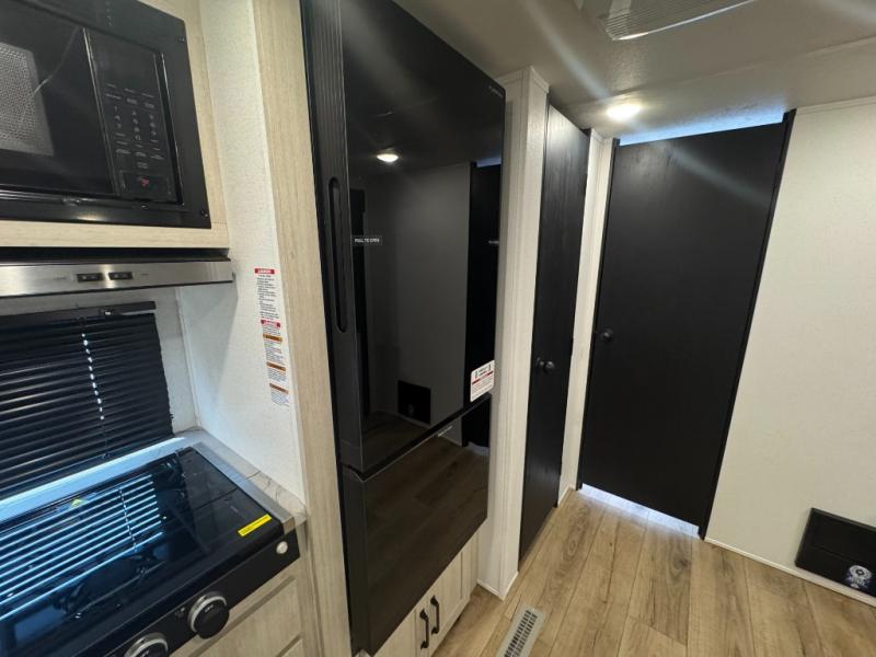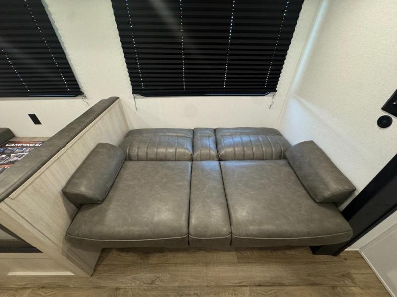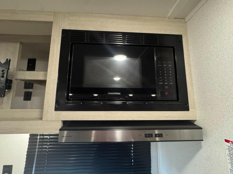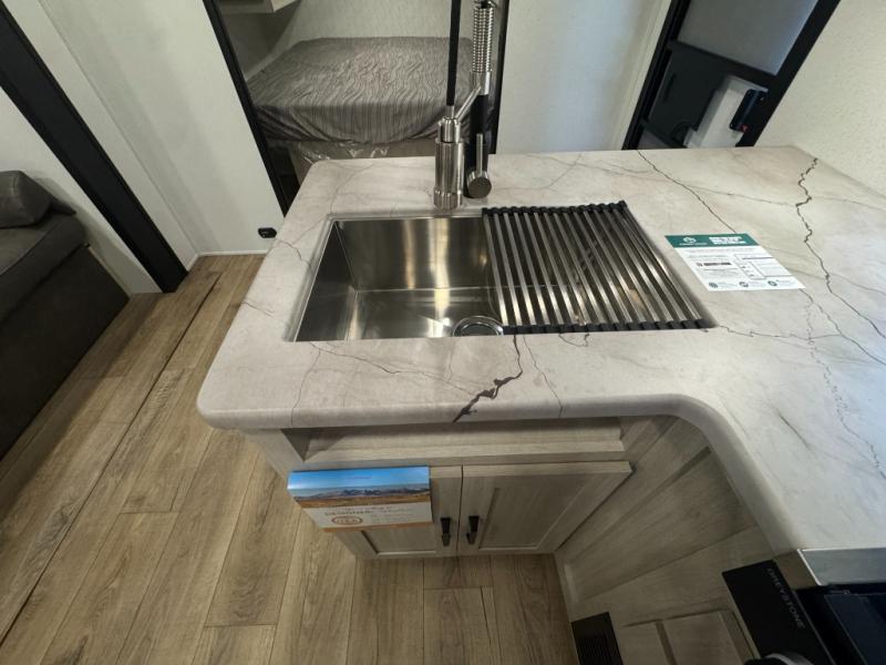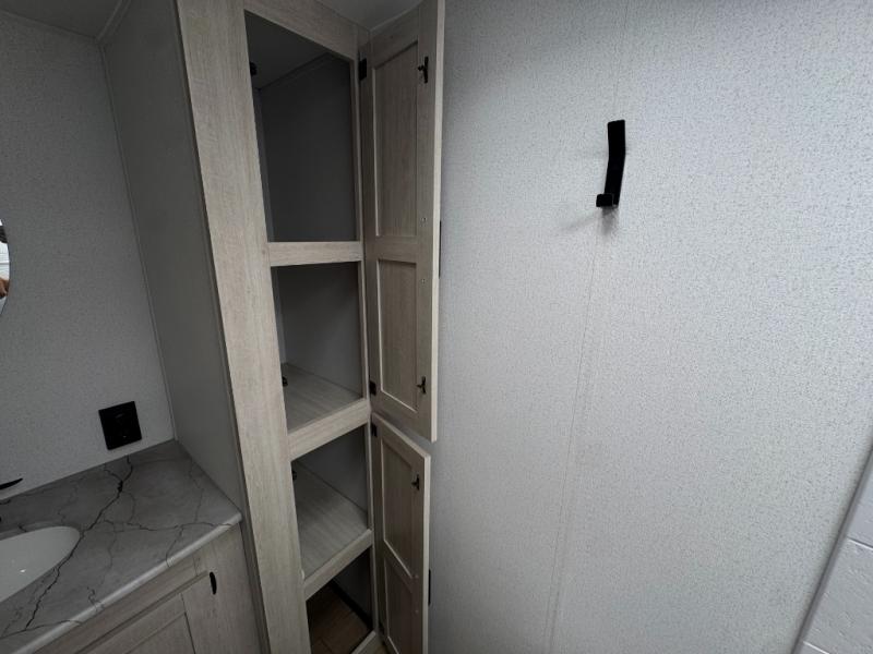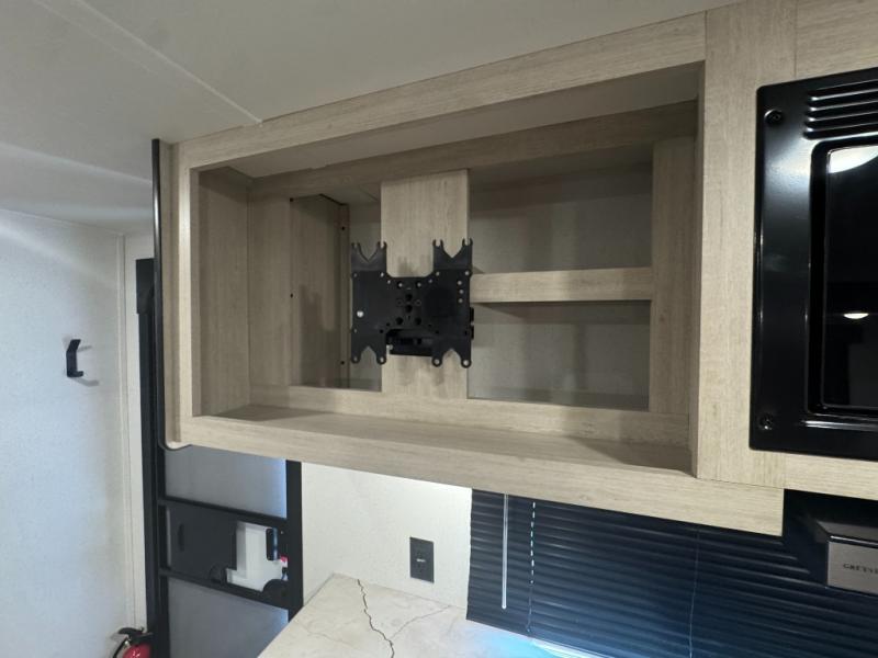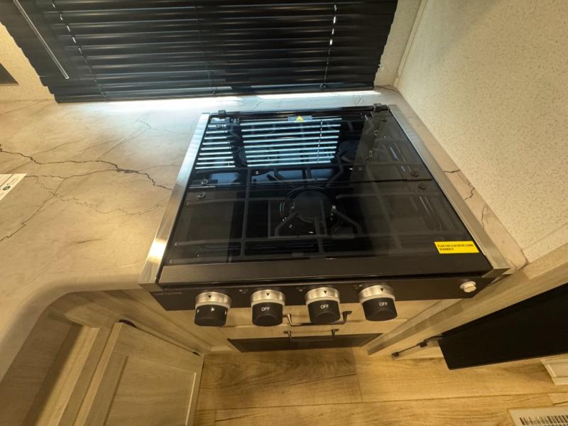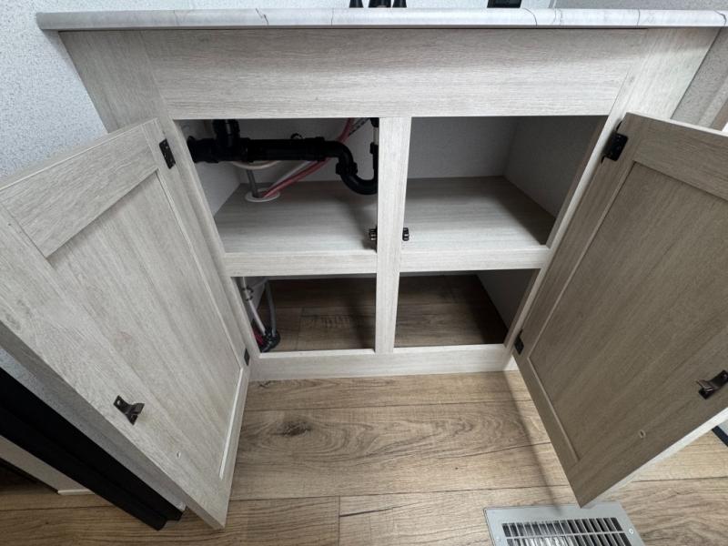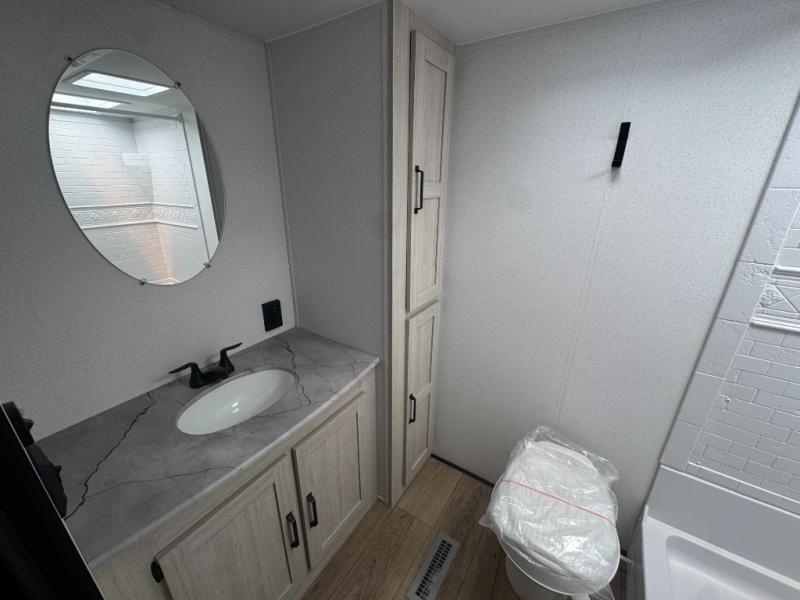 Wherever you decide to camp, you can be sure to have a great time in this rear bath travel trailer! The combined kitchen and living area is made spacious thanks to the large slide out. Here, you can relax on the sofa and dine at the booth dinette, and an optional TV can be added if you want the option for movie night. The full kitchen will allow you to make meals each day, and you can choose to add the optional outside mini kitchen with a griddle if you want to cook with fresh air. This unit also includes a front private bedroom, complete with an RV queen bed, an overhead shelf and dual shirt closets to keep clothes wrinkle-free.