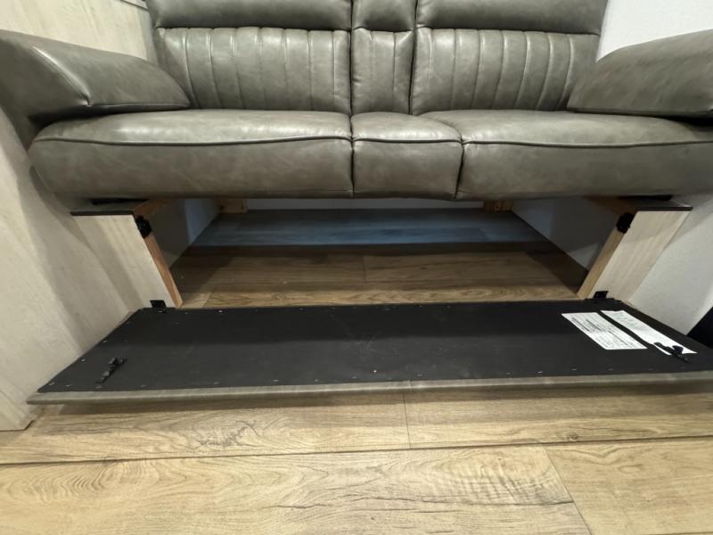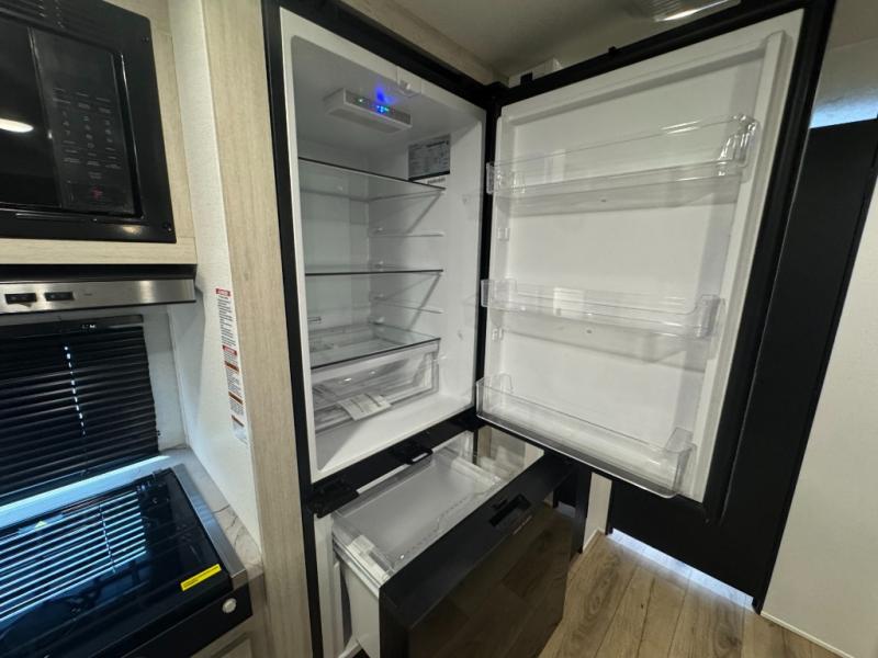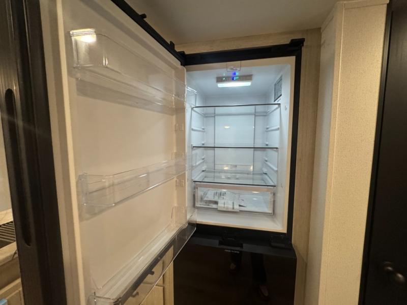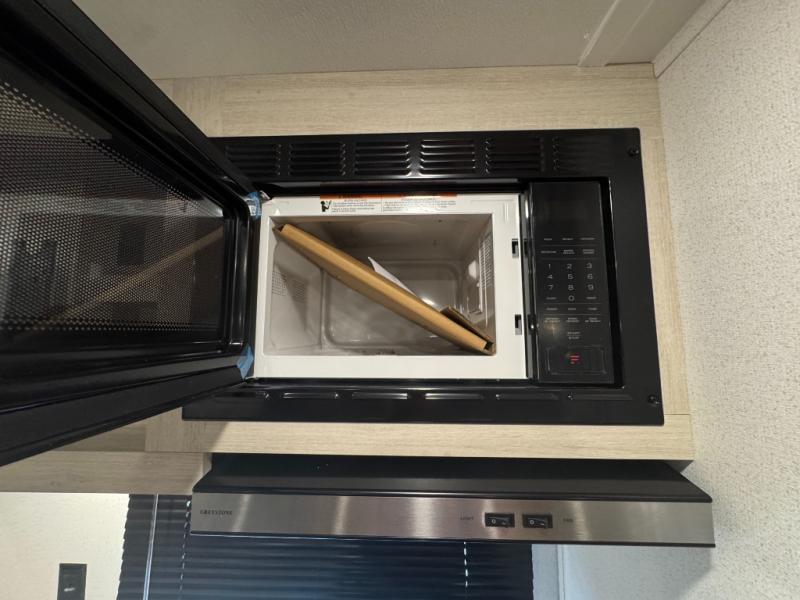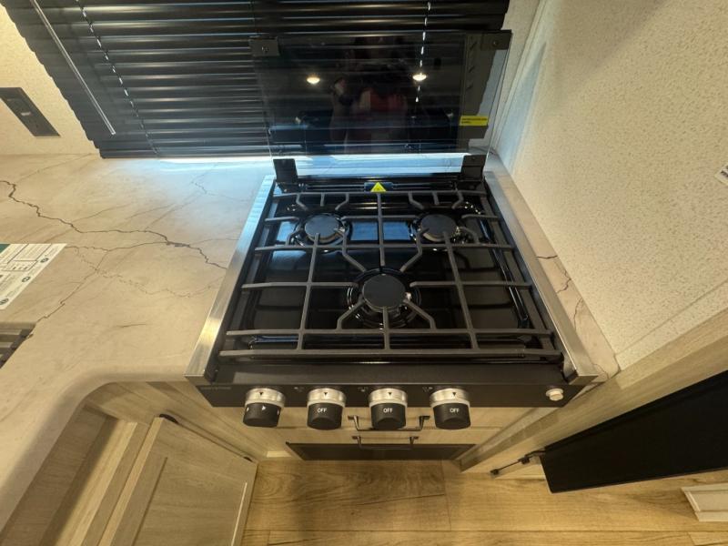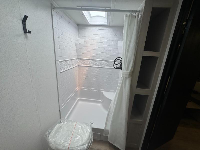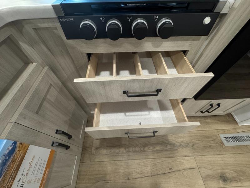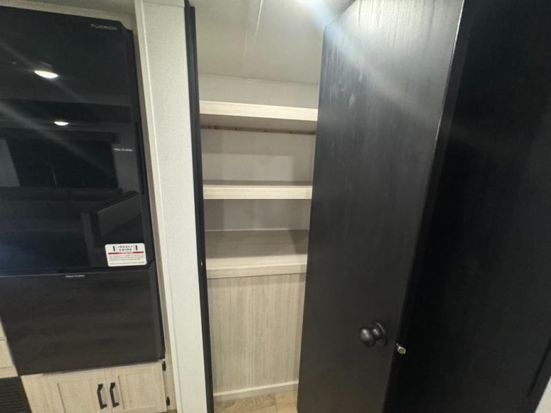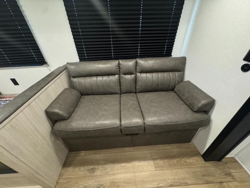 Wherever you decide to camp, you can be sure to have a great time in this rear bath travel trailer! The combined kitchen and living area is made spacious thanks to the large slide out. Here, you can relax on the sofa and dine at the booth dinette, and an optional TV can be added if you want the option for movie night. The full kitchen will allow you to make meals each day, and you can choose to add the optional outside mini kitchen with a griddle if you want to cook with fresh air. This unit also includes a front private bedroom, complete with an RV queen bed, an overhead shelf and dual shirt closets to keep clothes wrinkle-free.