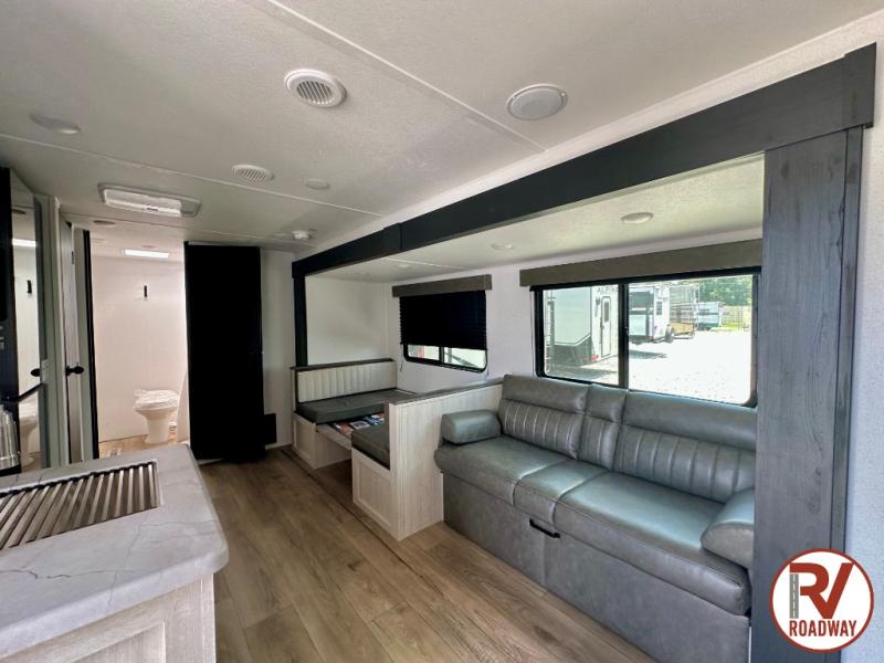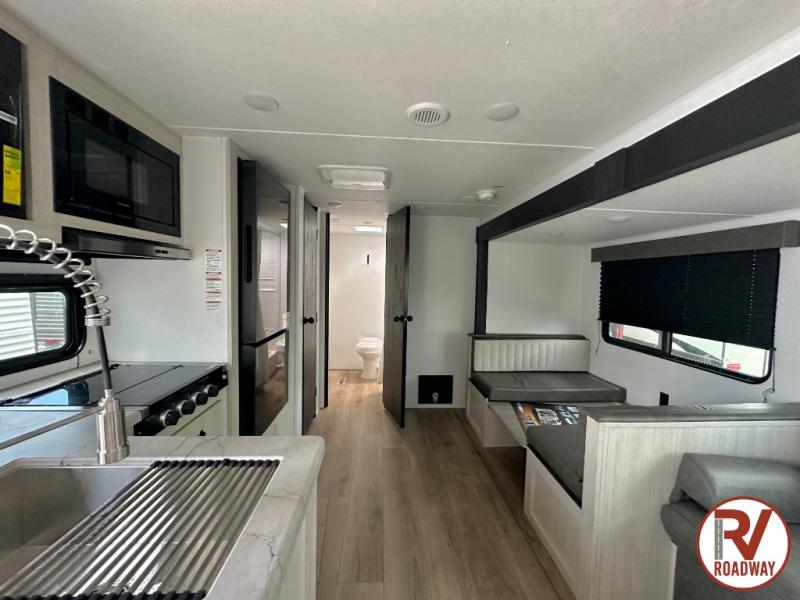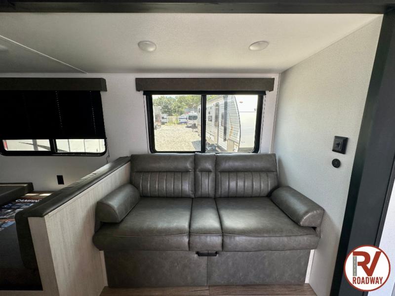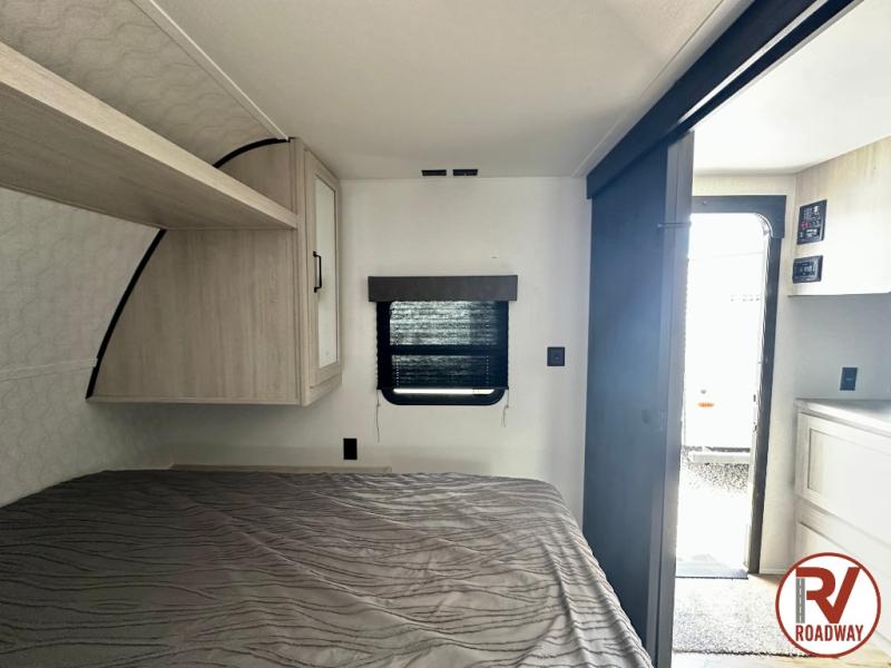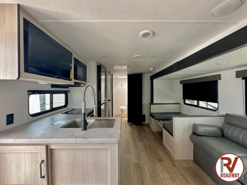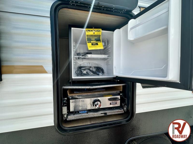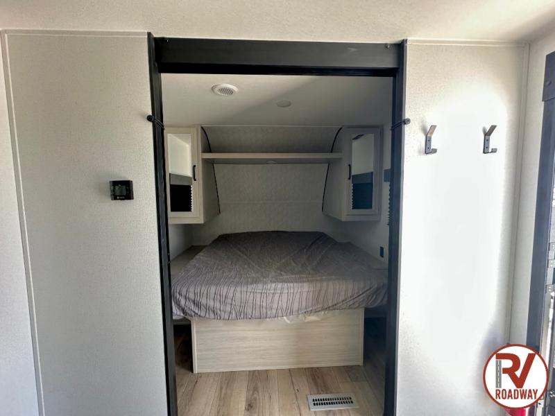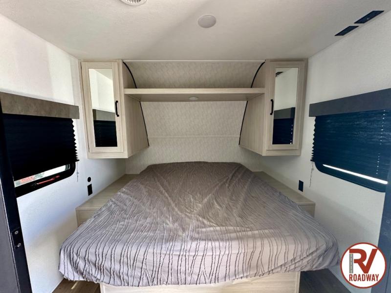 Wherever you decide to camp, you can be sure to have a great time in this rear bath travel trailer! The combined kitchen and living area is made spacious thanks to the large slide out. Here, you can relax on the sofa and dine at the booth dinette, and an optional TV can be added if you want the option for movie night. The full kitchen will allow you to make meals each day, and you can choose to add the optional outside mini kitchen with a griddle if you want to cook with fresh air. This unit also includes a front private bedroom, complete with an RV queen bed, an overhead shelf and dual shirt closets to keep clothes wrinkle-free.