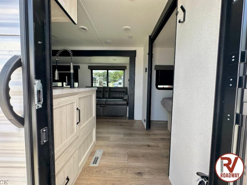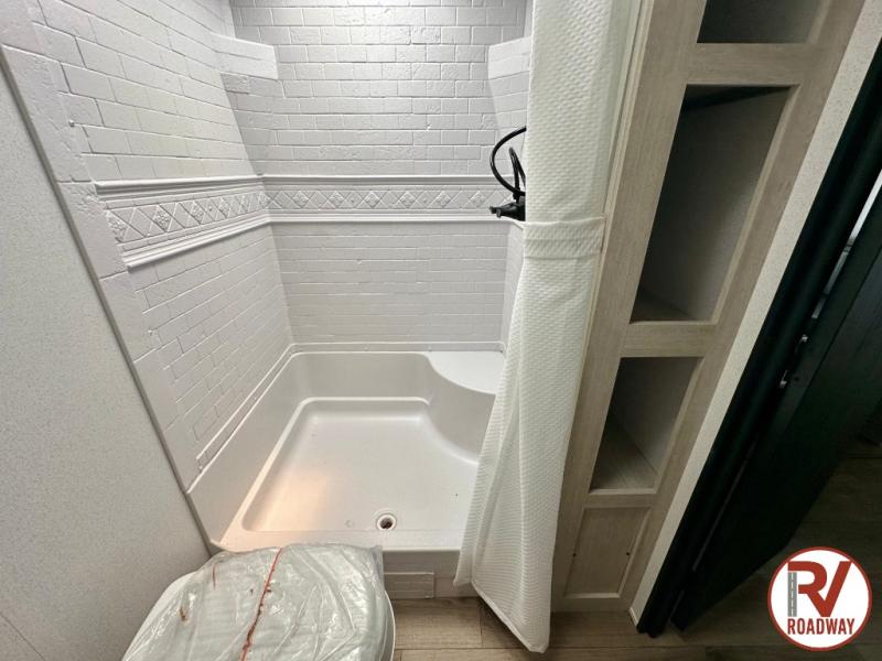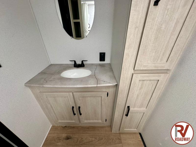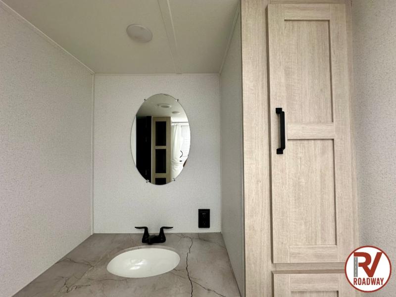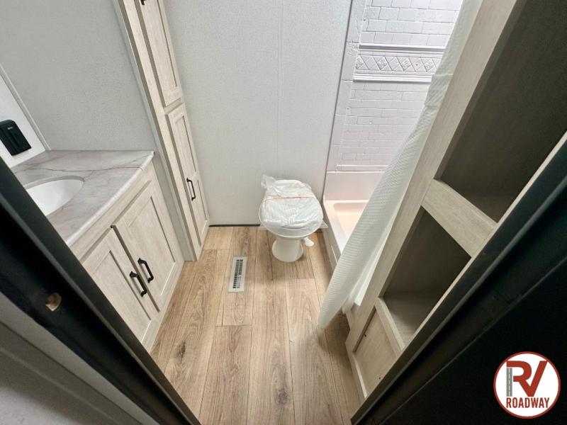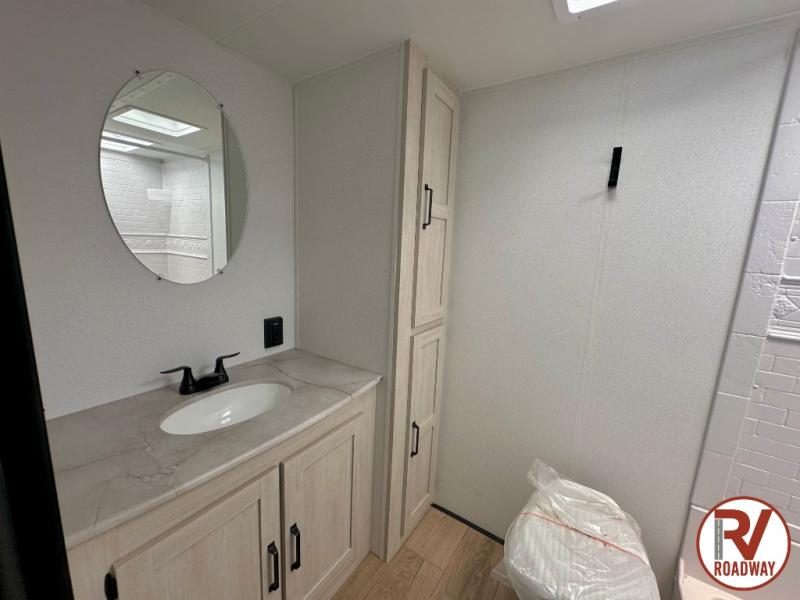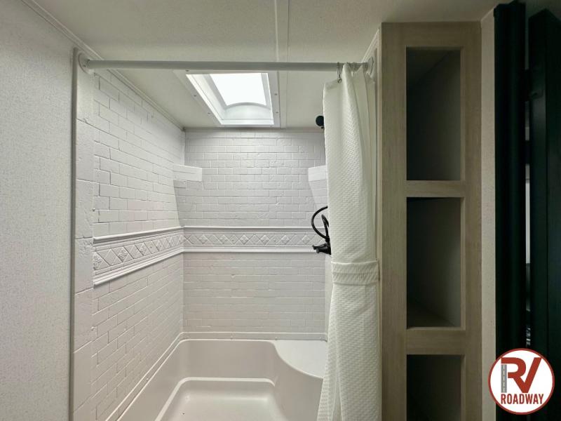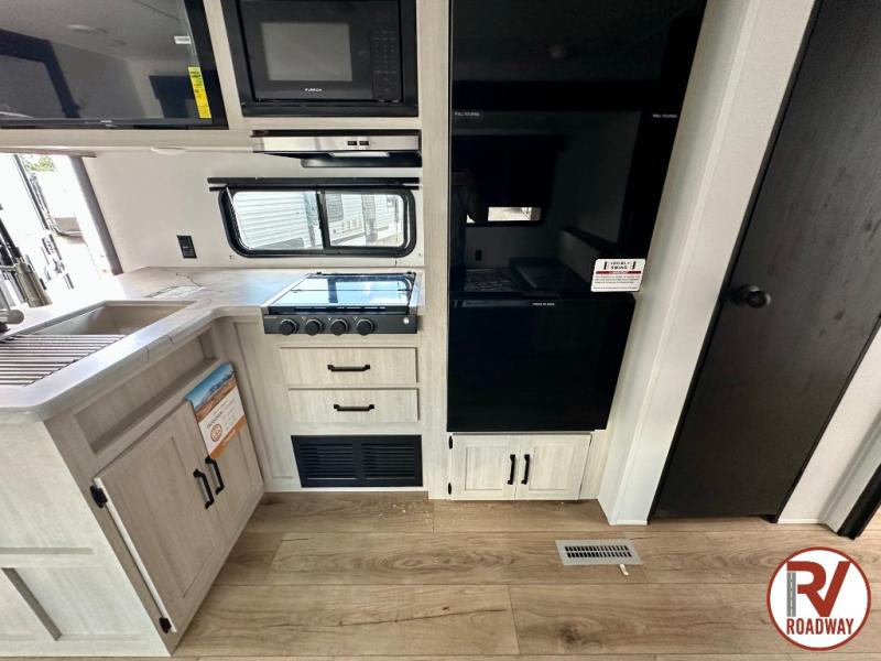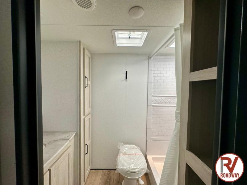Wherever you decide to camp, you can be sure to have a great time in this rear bath travel trailer! The combined kitchen and living area is made spacious thanks to the large slide out. Here, you can relax on the sofa and dine at the booth dinette, and an optional TV can be added if you want the option for movie night. The full kitchen will allow you to make meals each day, and you can choose to add the optional outside mini kitchen with a griddle if you want to cook with fresh air. This unit also includes a front private bedroom, complete with an RV queen bed, an overhead shelf and dual shirt closets to keep clothes wrinkle-free.