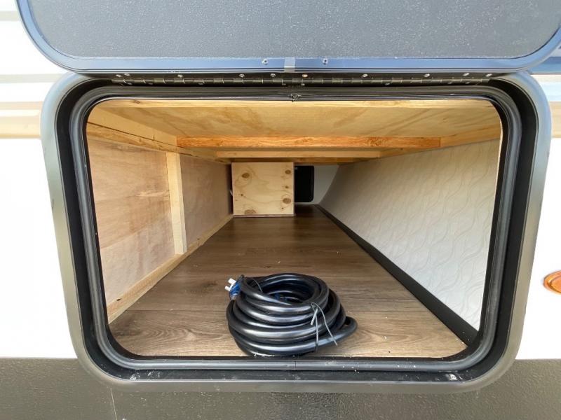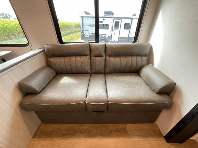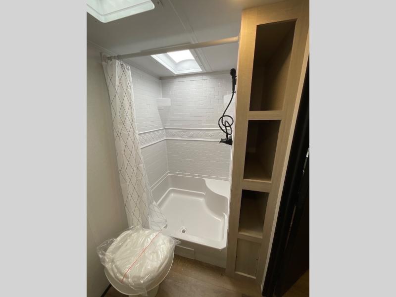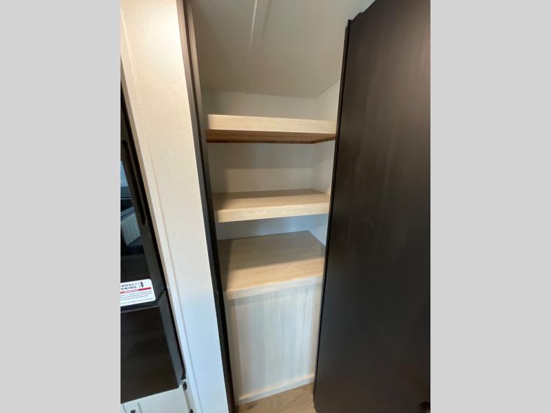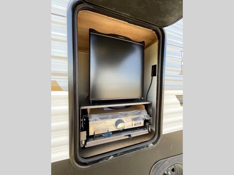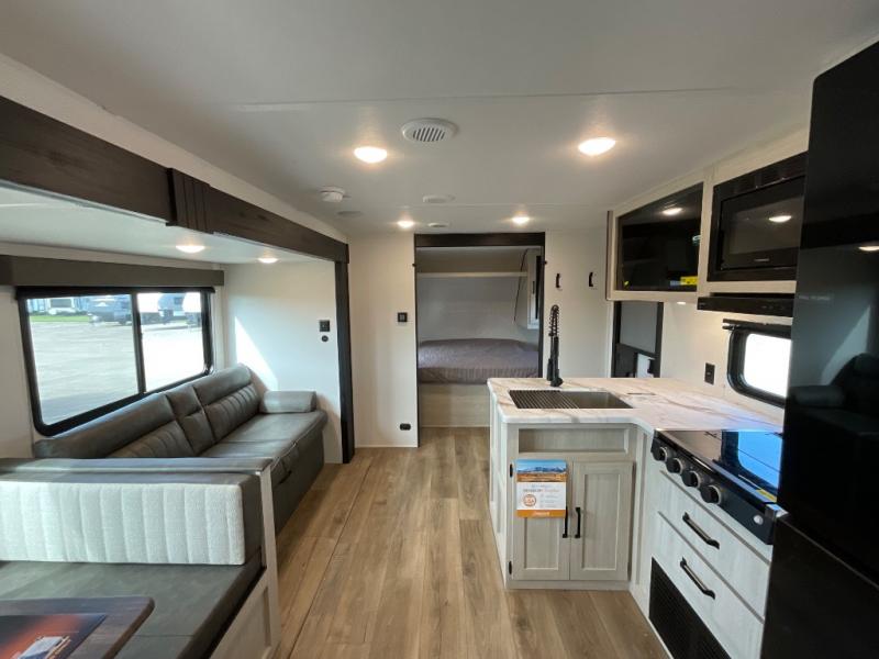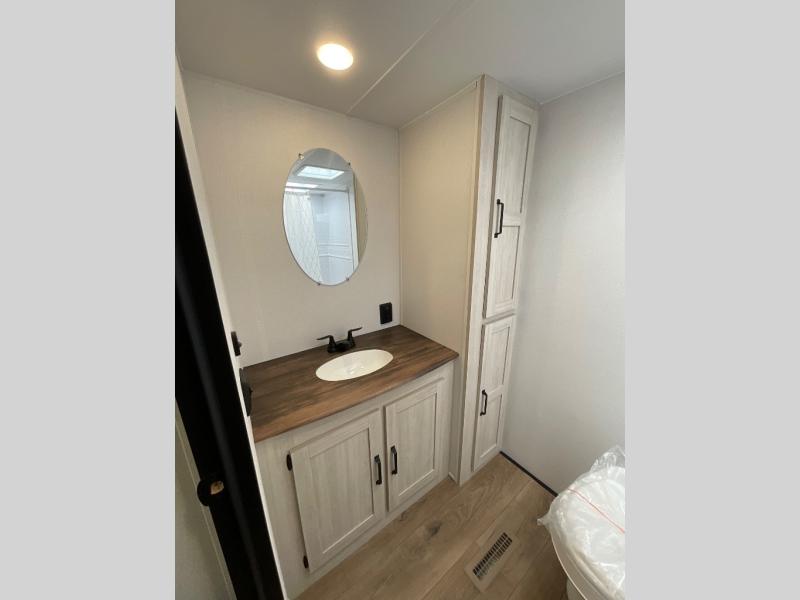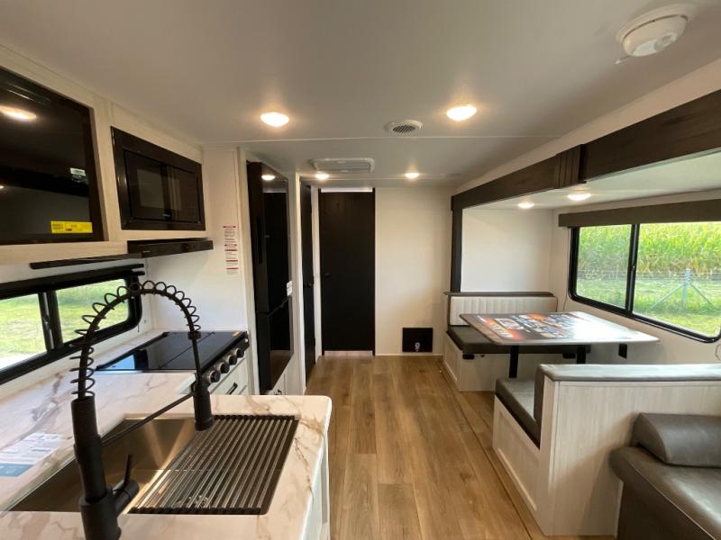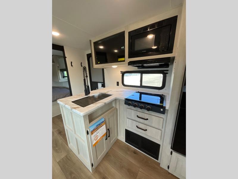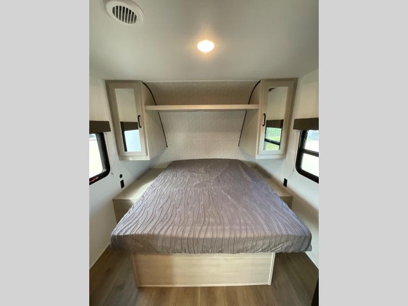 Wherever you decide to camp, you can be sure to have a great time in this rear bath travel trailer! The combined kitchen and living area is made spacious thanks to the large slide out. Here, you can relax on the sofa and dine at the booth dinette, and an optional TV can be added if you want the option for movie night. The full kitchen will allow you to make meals each day, and you can choose to add the optional outside mini kitchen with a griddle if you want to cook with fresh air. This unit also includes a front private bedroom, complete with an RV queen bed, an overhead shelf and dual shirt closets to keep clothes wrinkle-free.