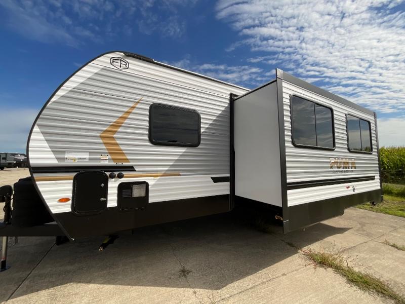 The Puma Camping Edition by Palomino offer an affordable travel trailer for rookie campers or seasoned RVers! They are built with 5/8" tongue and groove plywood flooring and a front diamond plate for added protection. There are also exterior clamp style door latches, back up camera prep, and 20 lb. LP bottles. Head inside to find Thermofoil countertops with a smooth drop edge, bedroom USB ports and outlets, and a GE appliance and kitchen package.