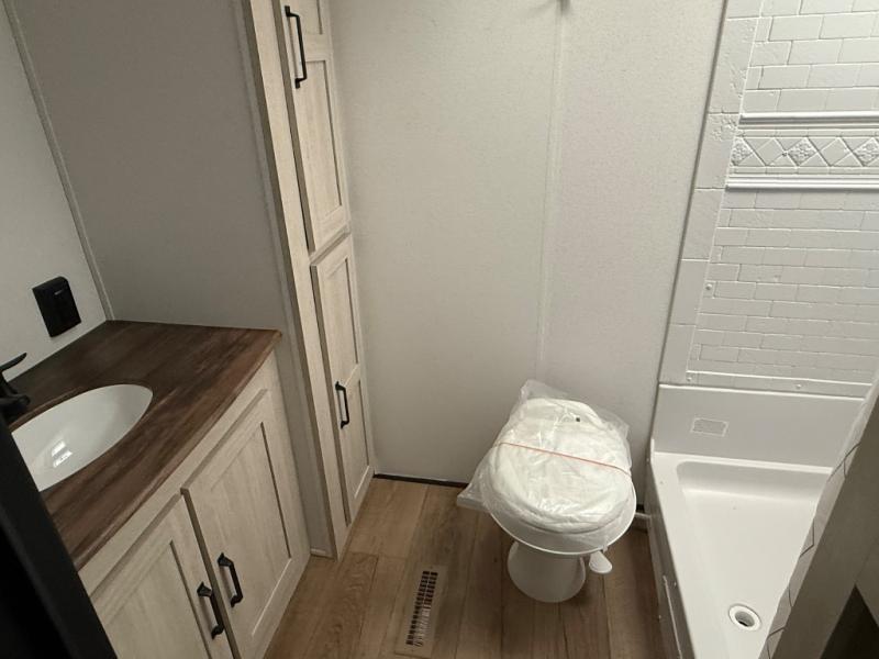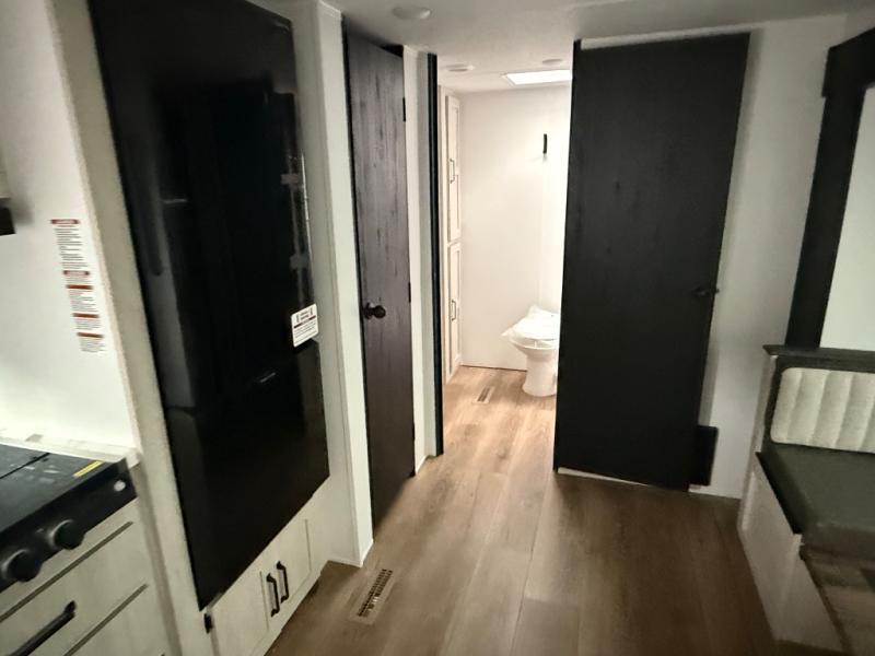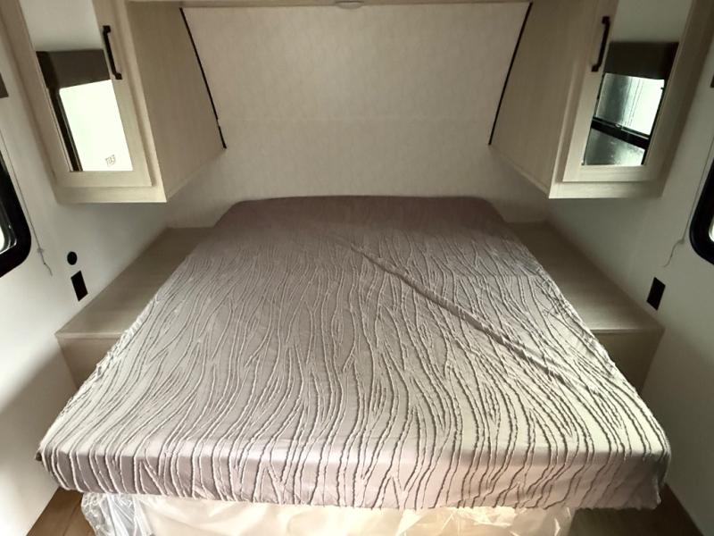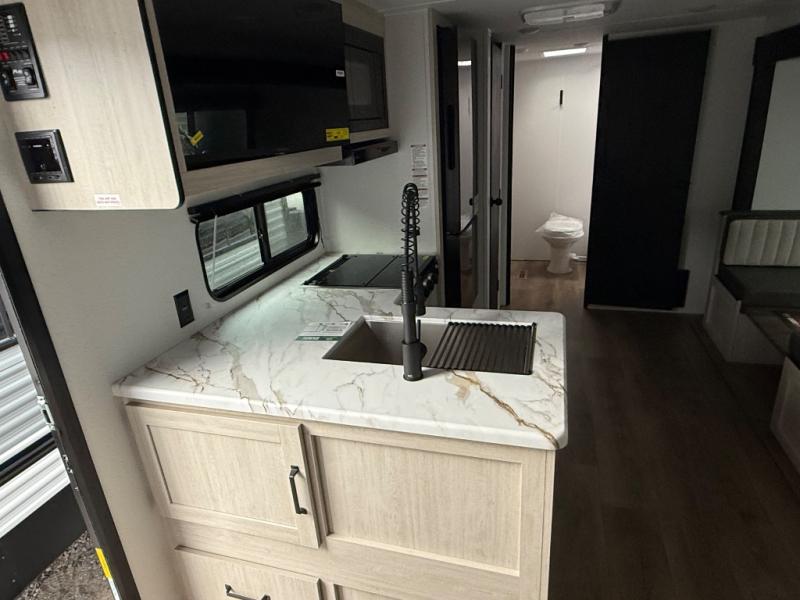 Wherever you decide to camp, you can be sure to have a great time in this rear bath travel trailer! The combined kitchen and living area is made spacious thanks to the large slide out. Here, you can relax on the sofa and dine at the booth dinette, and an optional TV can be added if you want the option for movie night. The full kitchen will allow you to make meals each day, and you can choose to add the optional outside mini kitchen with a grill if you want to cook with fresh air. This unit also includes a front private bedroom, complete with an RV queen bed, an overhead shelf and dual shirt closets to keep clothes wrinkle-free.