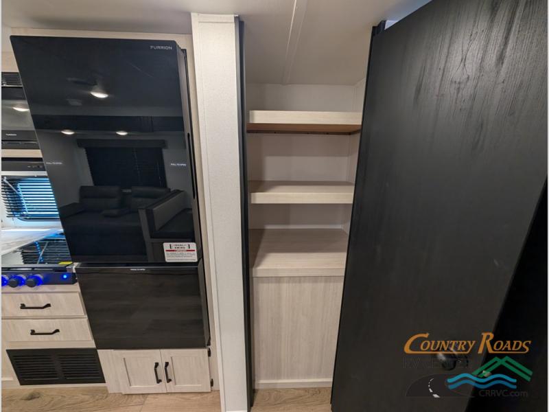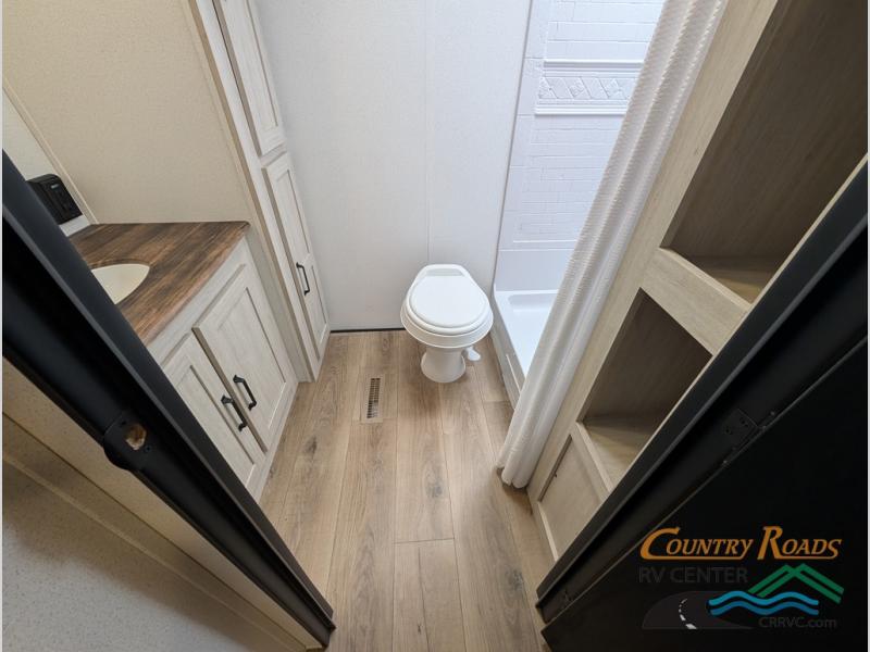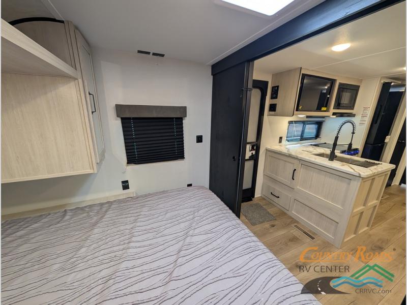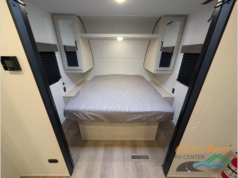 Wherever you decide to camp, you can be sure to have a great time in this rear bath travel trailer! The combined kitchen and living area is made spacious thanks to the large slide out. Here, you can relax on the sofa and dine at the booth dinette, and an optional TV can be added if you want the option for movie night. The full kitchen will allow you to make meals each day, and you can choose to add the optional outside mini kitchen with a griddle if you want to cook with fresh air. This unit also includes a front private bedroom, complete with an RV queen bed, an overhead shelf and dual shirt closets to keep clothes wrinkle-free.