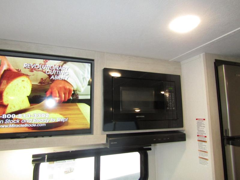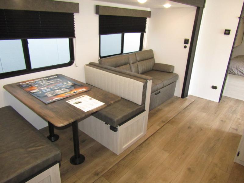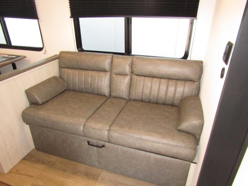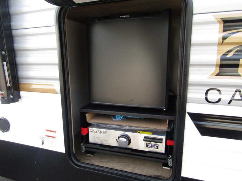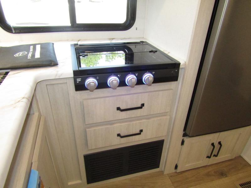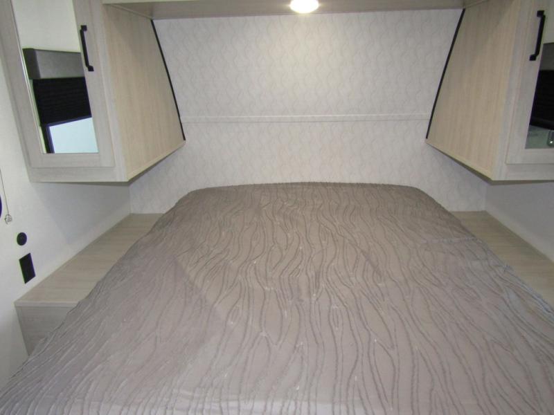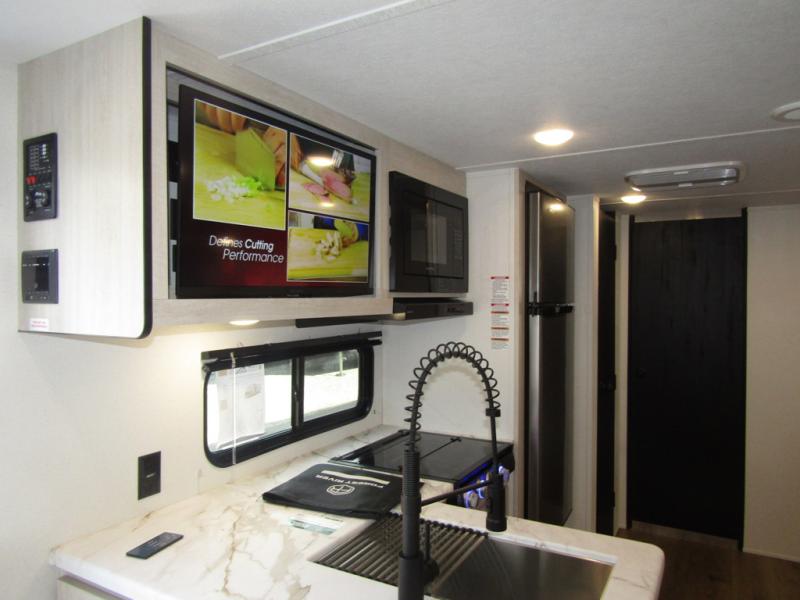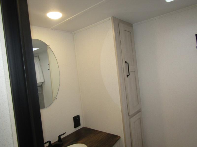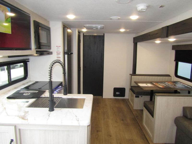 Wherever you decide to camp, you can be sure to have a great time in this rear bath travel trailer! The combined kitchen and living area is made spacious thanks to the large slide out. Here, you can relax on the sofa and dine at the booth dinette, and an optional TV can be added if you want the option for movie night. The full kitchen will allow you to make meals each day, and you can choose to add the optional outside mini kitchen with a grill if you want to cook with fresh air. This unit also includes a front private bedroom, complete with an RV queen bed, an overhead shelf and dual shirt closets to keep clothes wrinkle-free.