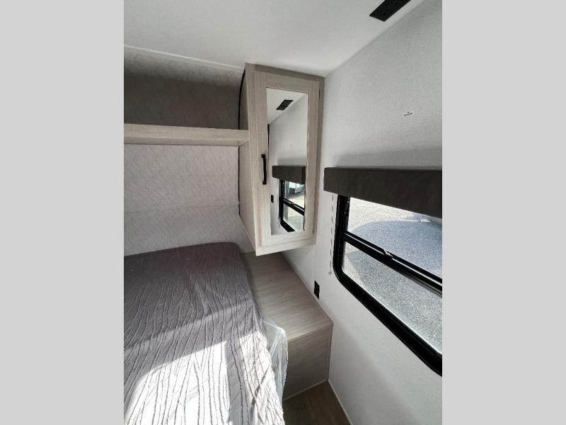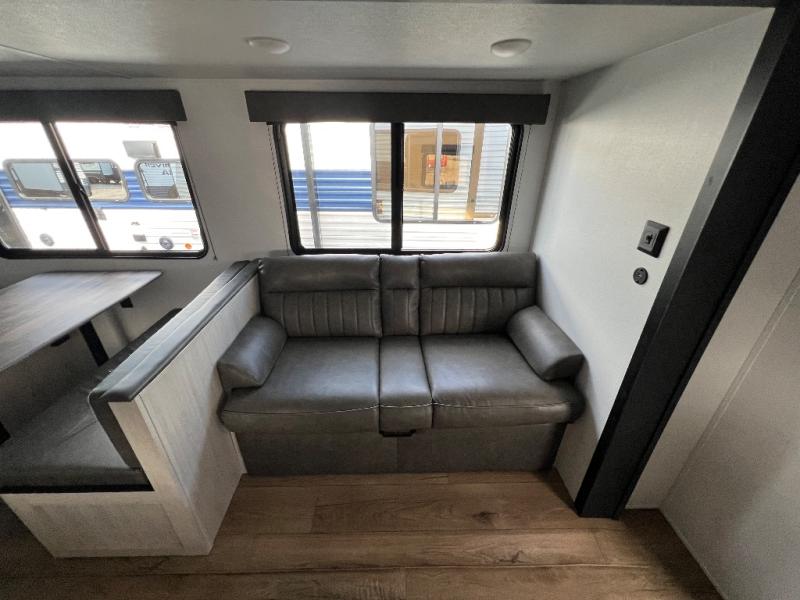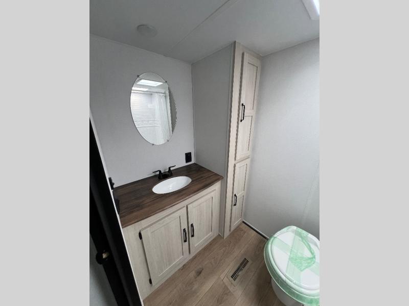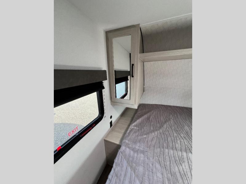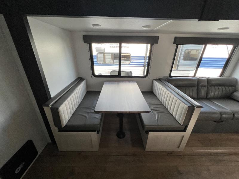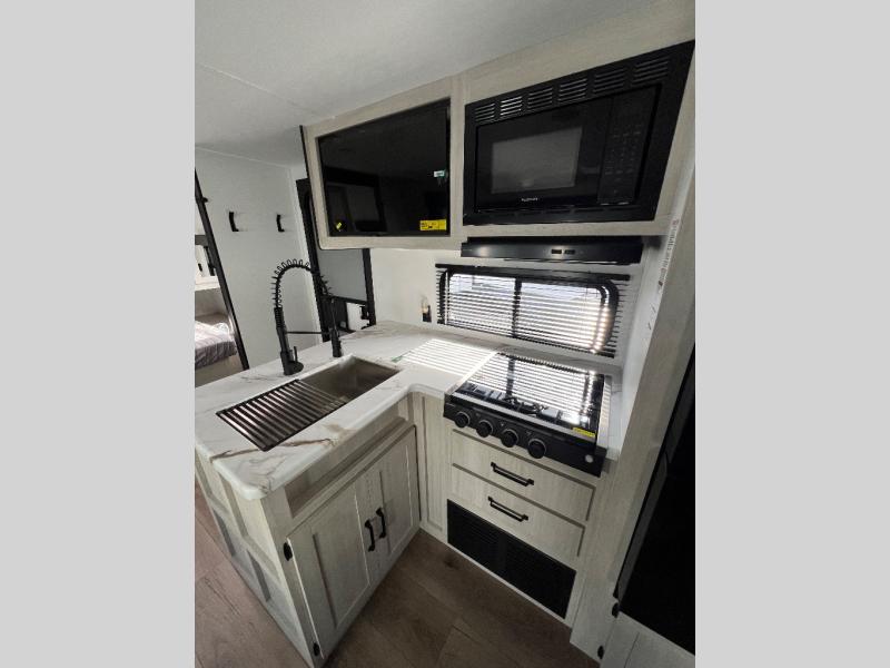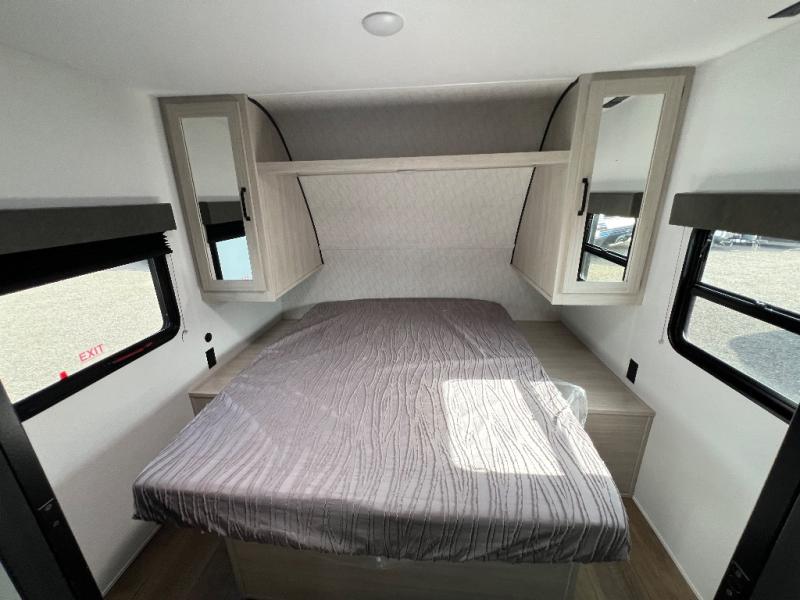 Wherever you decide to camp, you can be sure to have a great time in this rear bath travel trailer! The combined kitchen and living area is made spacious thanks to the large slide out. Here, you can relax on the sofa and dine at the booth dinette, and an optional TV can be added if you want the option for movie night. The full kitchen will allow you to make meals each day, and you can choose to add the optional outside mini kitchen with a grill if you want to cook with fresh air. This unit also includes a front private bedroom, complete with an RV queen bed, an overhead shelf and dual shirt closets to keep clothes wrinkle-free.