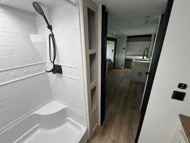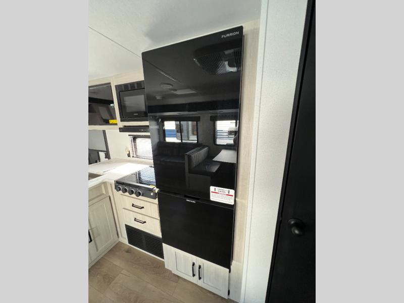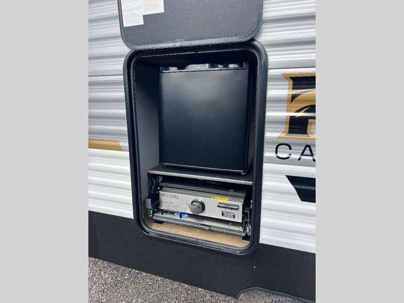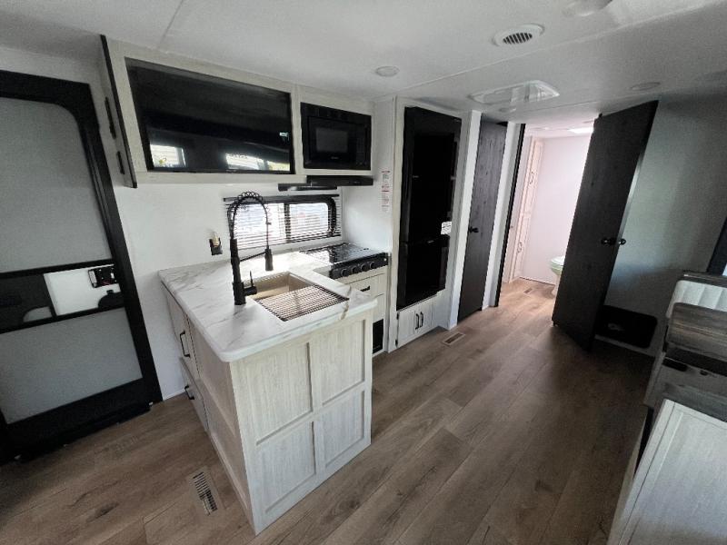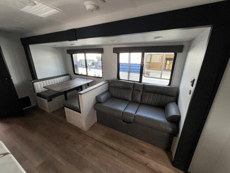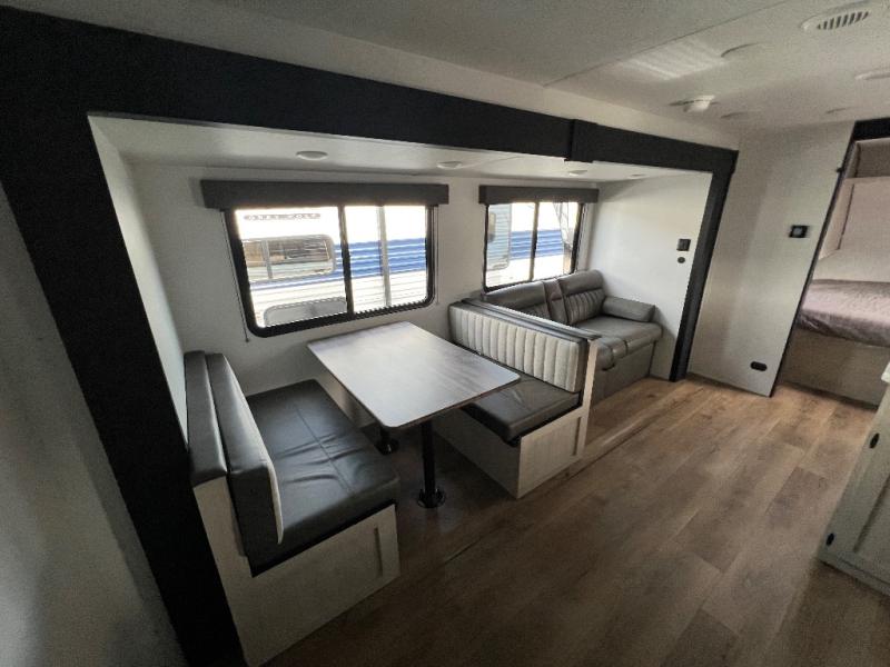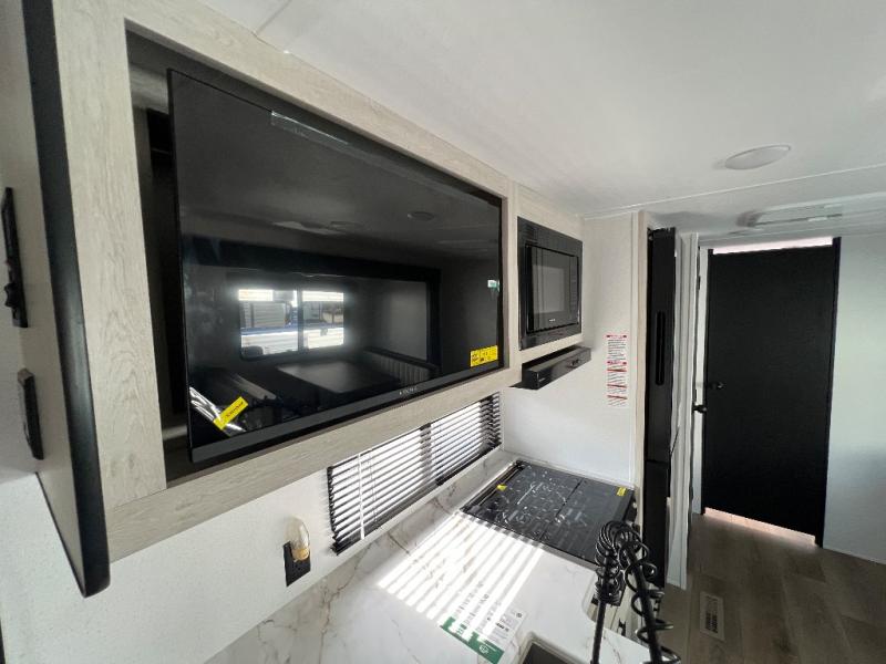 Wherever you decide to camp, you can be sure to have a great time in this rear bath travel trailer! The combined kitchen and living area is made spacious thanks to the large slide out. Here, you can relax on the sofa and dine at the booth dinette, and an optional TV can be added if you want the option for movie night. The full kitchen will allow you to make meals each day, and you can choose to add the optional outside mini kitchen with a grill if you want to cook with fresh air. This unit also includes a front private bedroom, complete with an RV queen bed, an overhead shelf and dual shirt closets to keep clothes wrinkle-free.