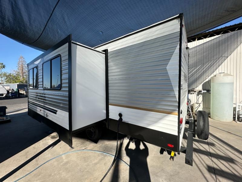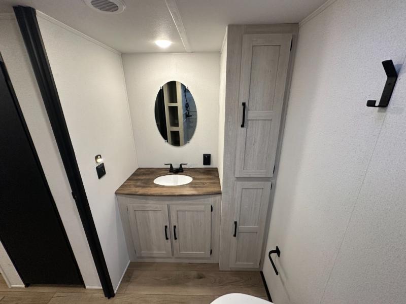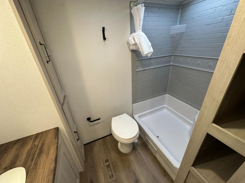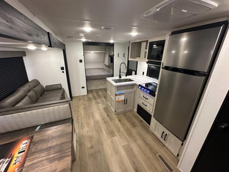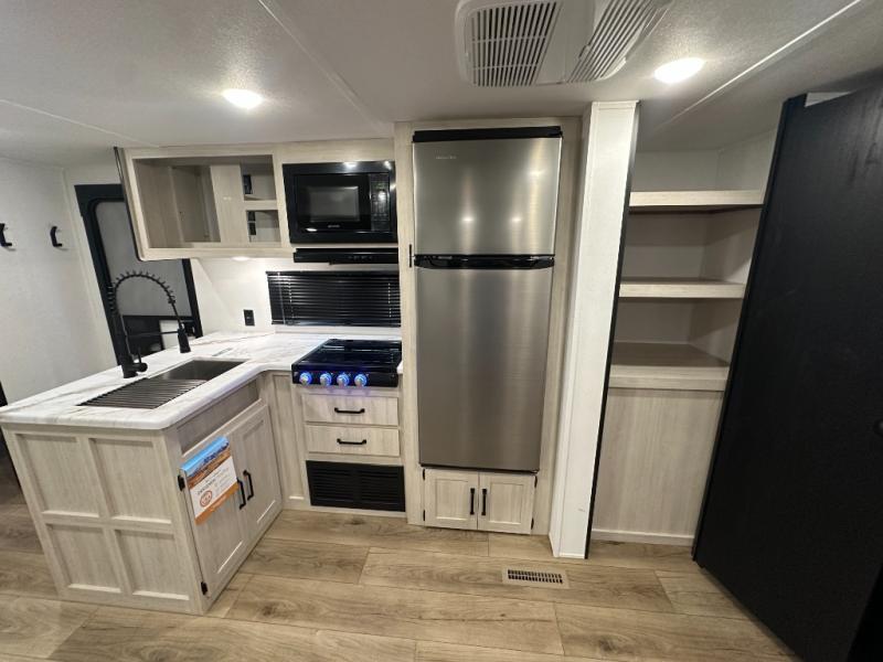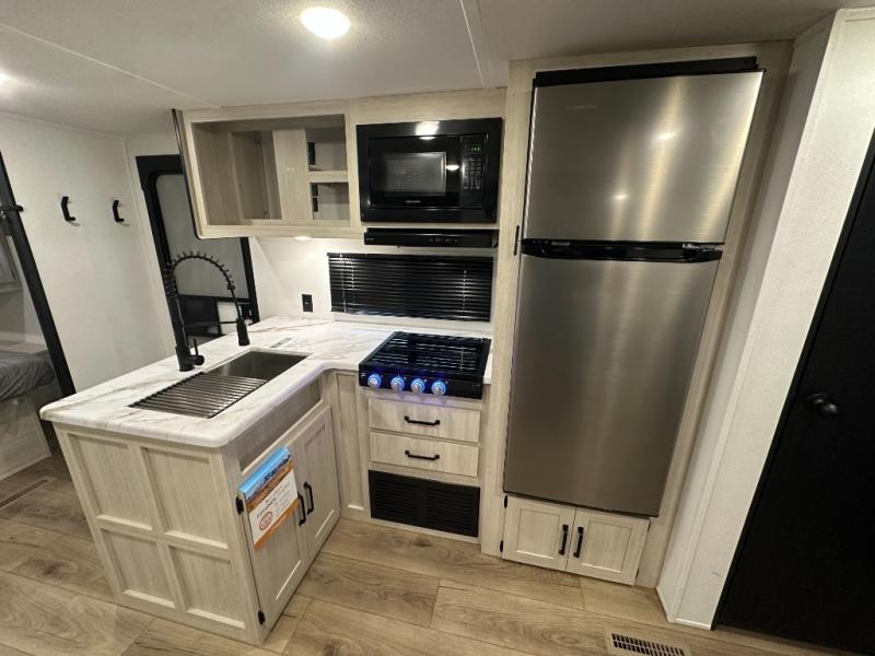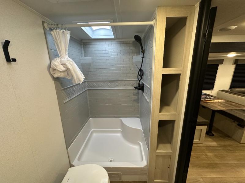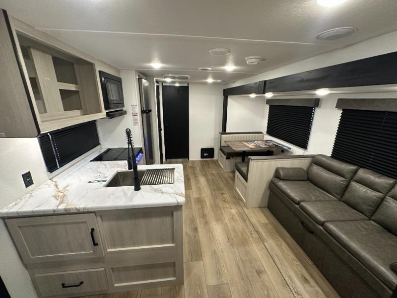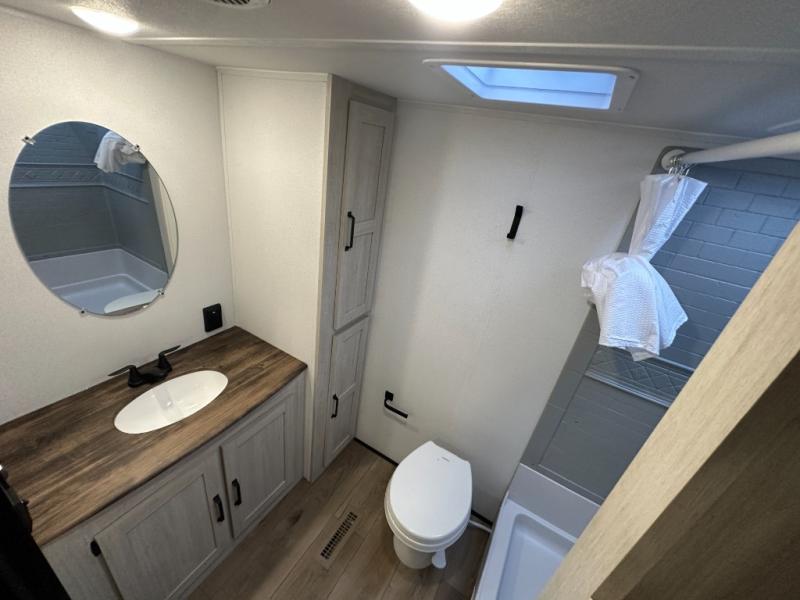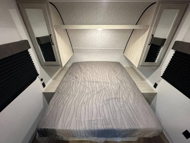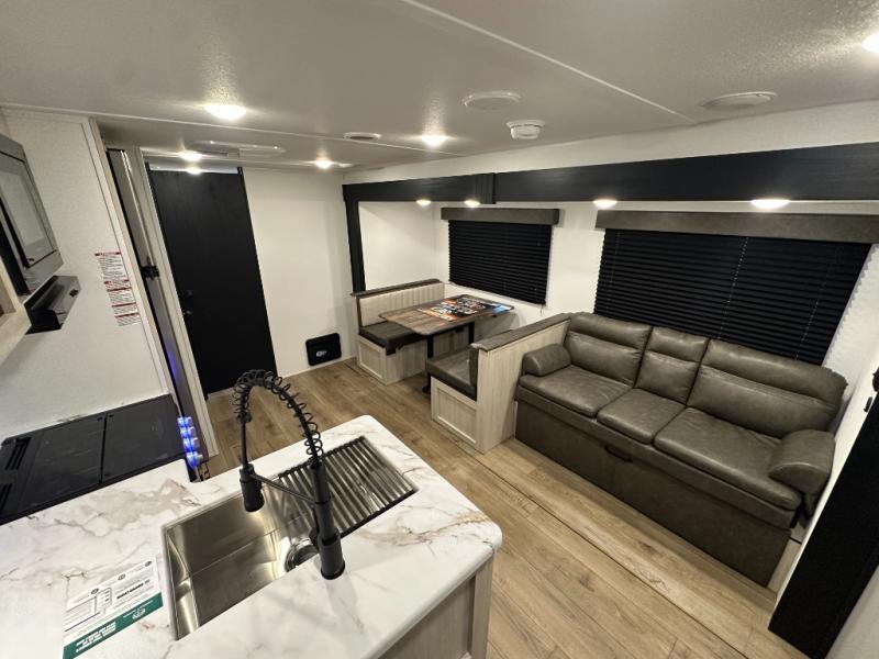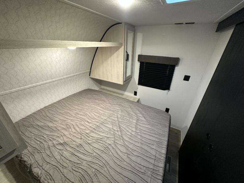 Wherever you decide to camp, you can be sure to have a great time in this rear bath travel trailer! The combined kitchen and living area is made spacious thanks to the large slide out. Here, you can relax on the sofa and dine at the booth dinette, and an optional TV can be added if you want the option for movie night. The full kitchen will allow you to make meals each day, and you can choose to add the optional outside mini kitchen with a grill if you want to cook with fresh air. This unit also includes a front private bedroom, complete with an RV queen bed, an overhead shelf and dual shirt closets to keep clothes wrinkle-free.