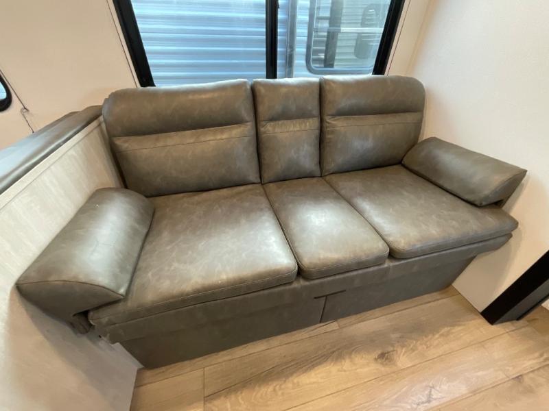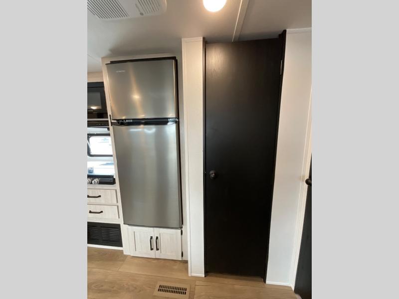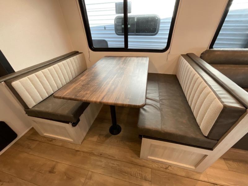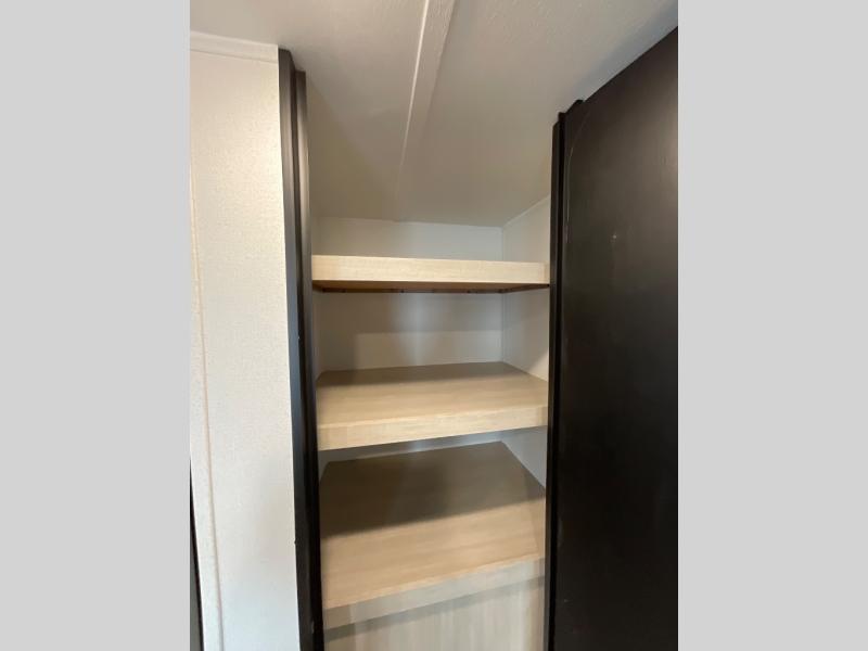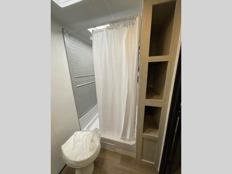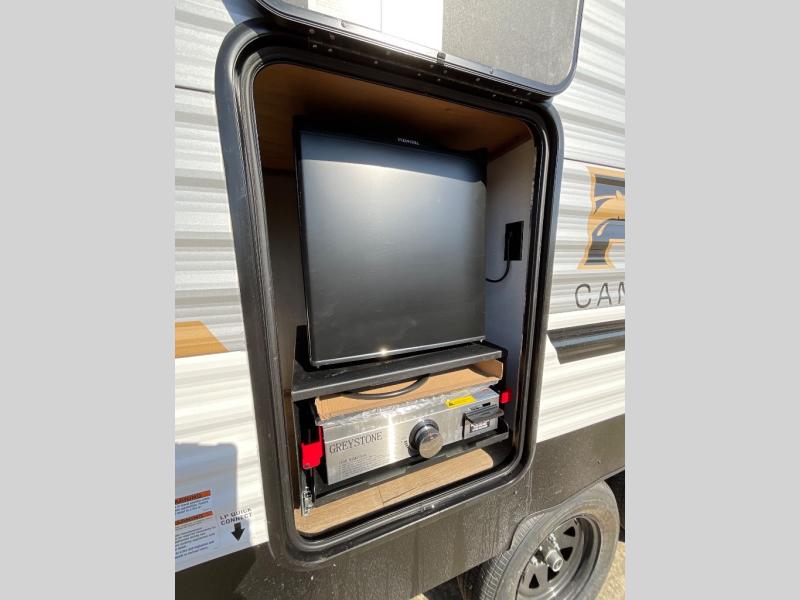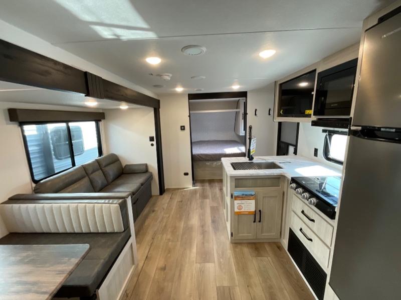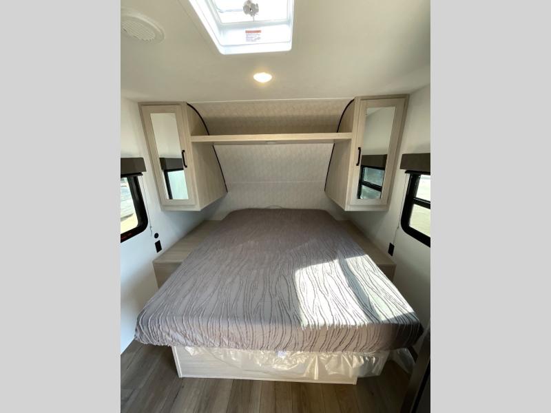 Wherever you decide to camp, you can be sure to have a great time in this rear bath travel trailer! The combined kitchen and living area is made spacious thanks to the large slide out. Here, you can relax on the sofa and dine at the booth dinette, and an optional TV can be added if you want the option for movie night. The full kitchen will allow you to make meals each day, and you can choose to add the optional outside mini kitchen with a grill if you want to cook with fresh air. This unit also includes a front private bedroom, complete with an RV queen bed, an overhead shelf and dual shirt closets to keep clothes wrinkle-free.